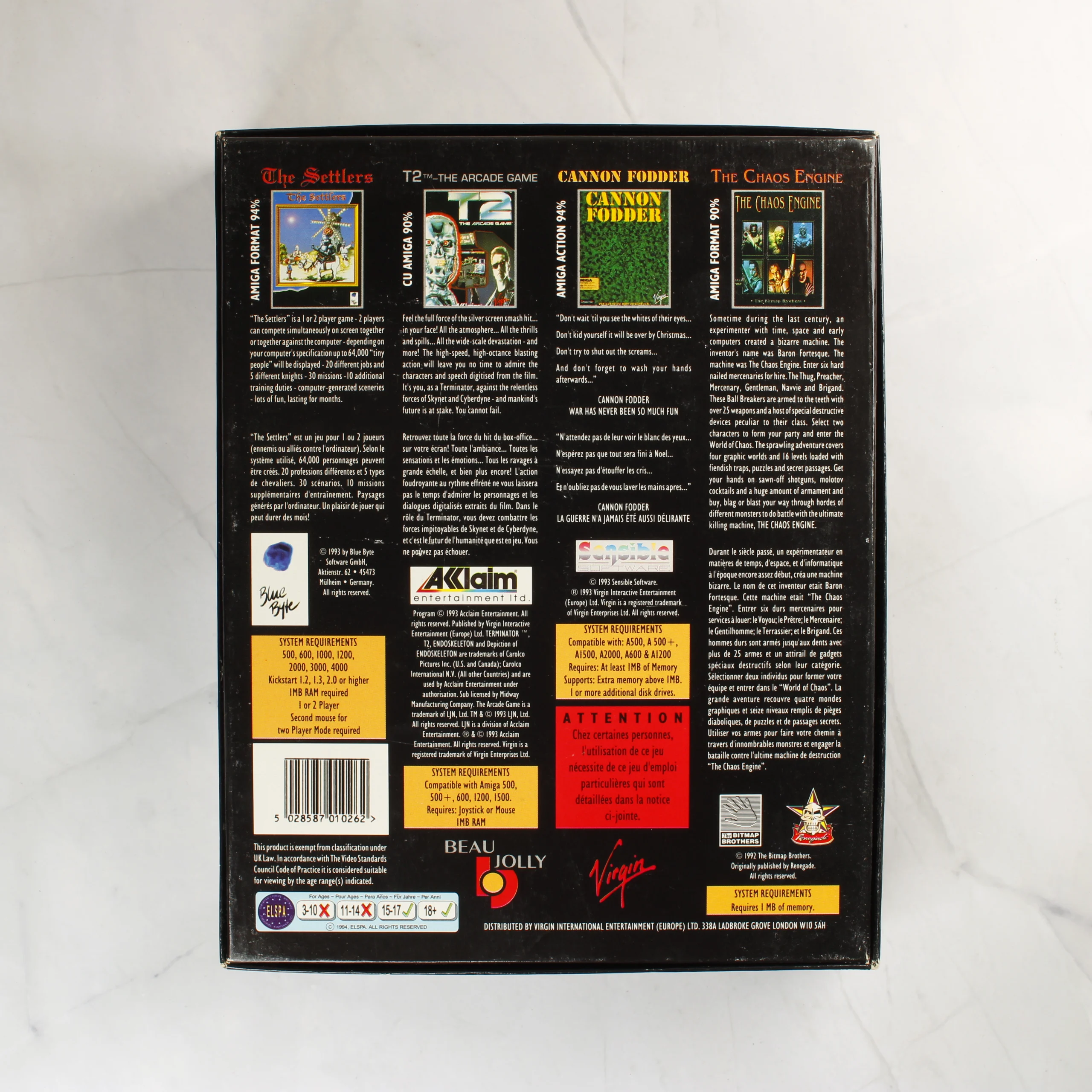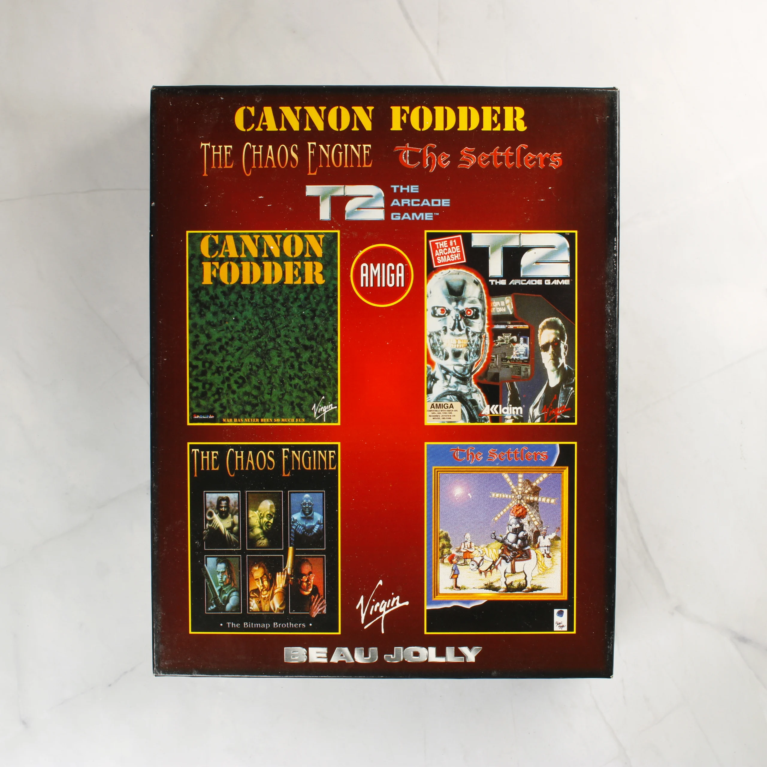 Ez a Beau Jolly által kiadott Amiga videójáték-válogatás négy klasszikus címet tartalmaz: Cannon Fodder, The Chaos Engine, The Settlers és T2: The Arcade Game. A csomag egy nagyméretű, színes kartondobozból, egy közös használati útmutatóból és összesen tizenegy darab 3,5 colos kék floppy lemezből áll. A doboz elején a játékok borítóképei láthatók, a hátoldalon pedig angol és francia nyelvű leírások, valamint rendszerkövetelmények szerepelnek. A lemezeken fehér alapon fekete feliratú címkék találhatók, amelyek jelzik az adott játékot és a lemez sorszámát. Az útmutató fehér borítójú, fekete felirattal. A készlet hiánytalannak tűnik a mellékelt lemezek alapján.