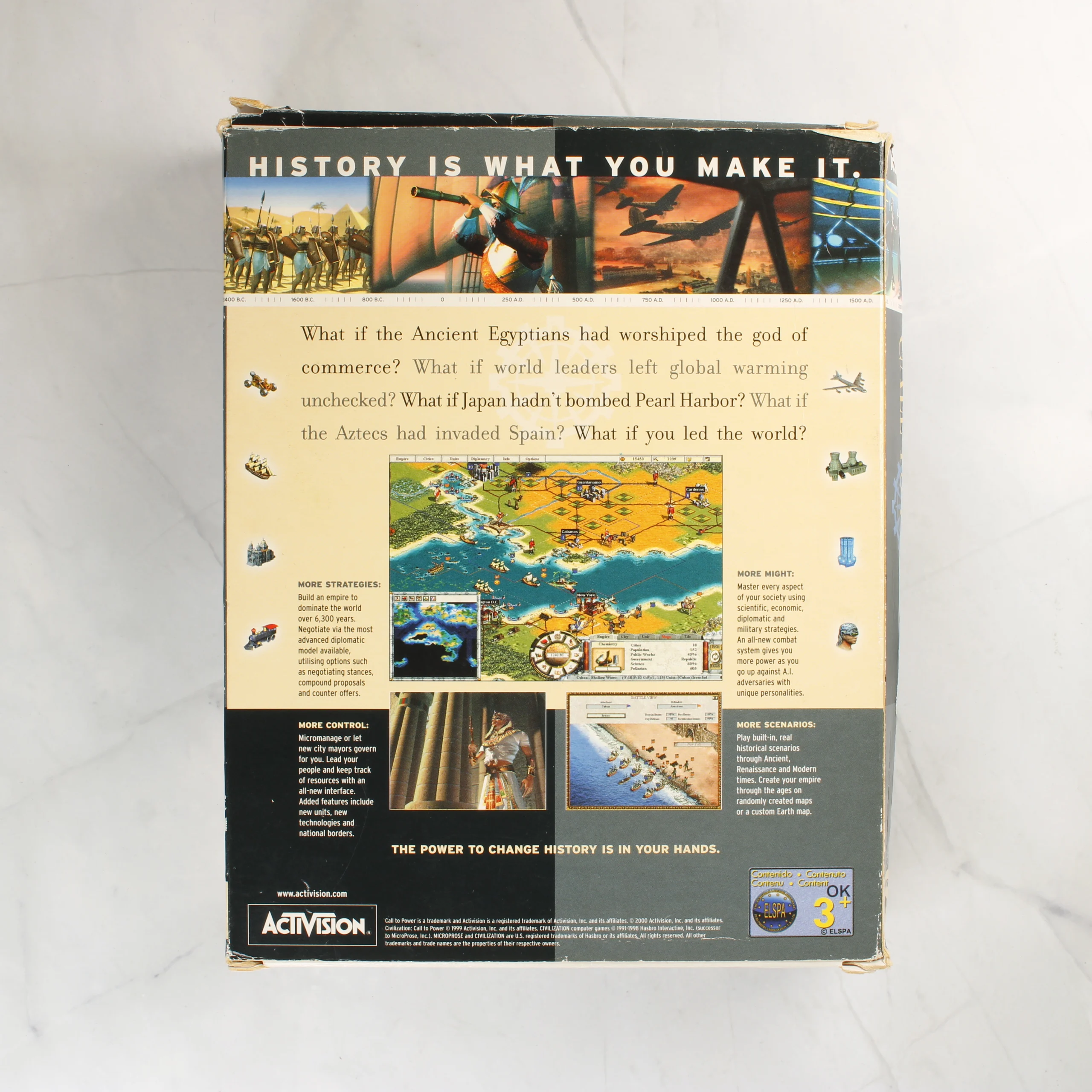 A Call to Power II című PC-s stratégiai videójáték eredeti, nagydobozos kiadása. A csomag tartalmazza a külső kartondobozt és a belső, normál CD-tokot a játéklemezszel. A doboz grafikája egy kettéosztott arcot ábrázol, amely az ókori egyiptomi és a jövőbeli technológiai korszakokat ötvözi. A hátoldalon játékmenet-felvételek és angol nyelvű leírások láthatóak. A kiadvány az Activision gondozásában jelent meg, és az ELSPA 3+ korhatár-besorolásával rendelkezik. A kartoncsomagolás élei és sarkai láthatóan kopottak, néhol benyomódások és kisebb szakadások tapasztalhatóak, különösen a felső éleknél. A belső műanyag tok és a borítófüzet épnek tűnik.