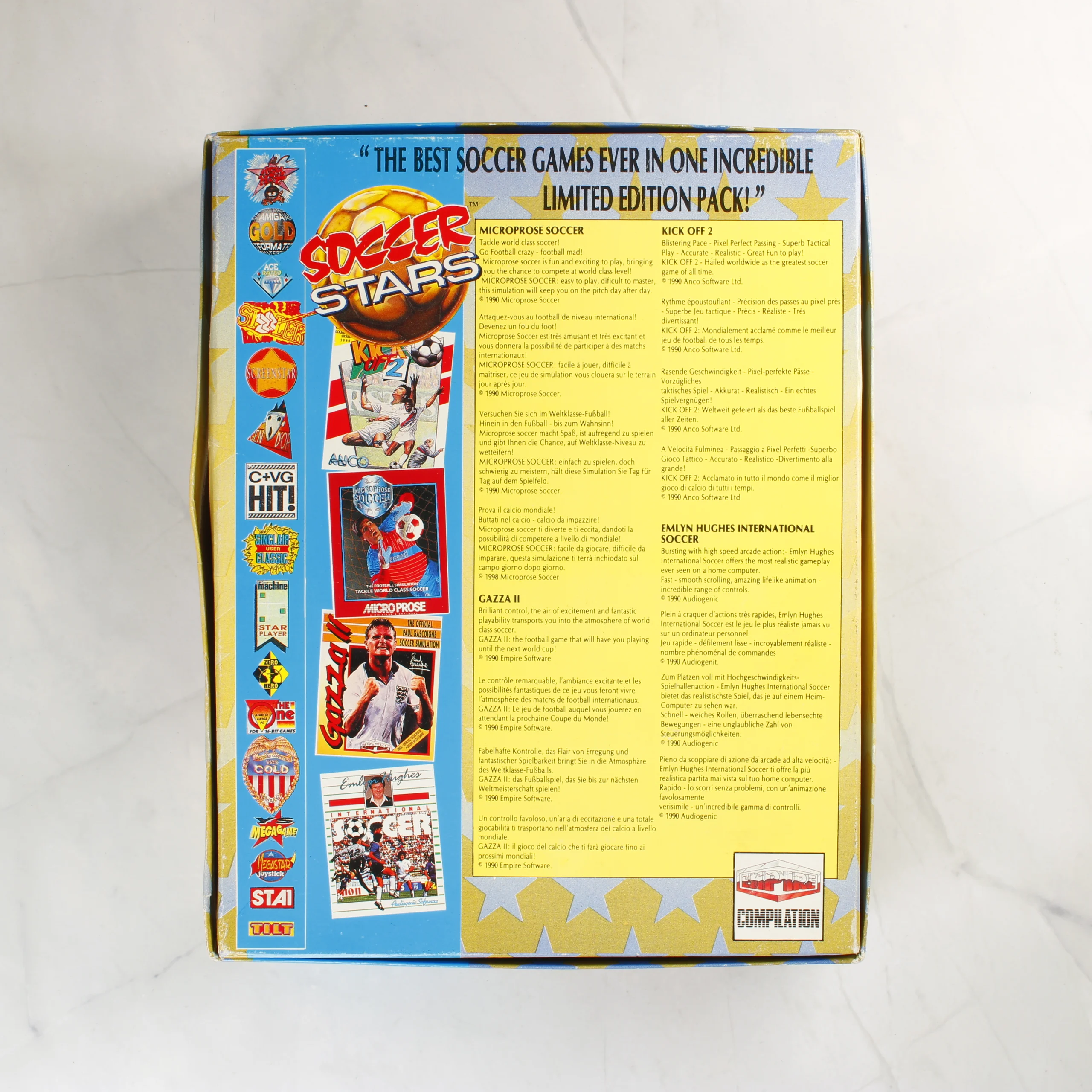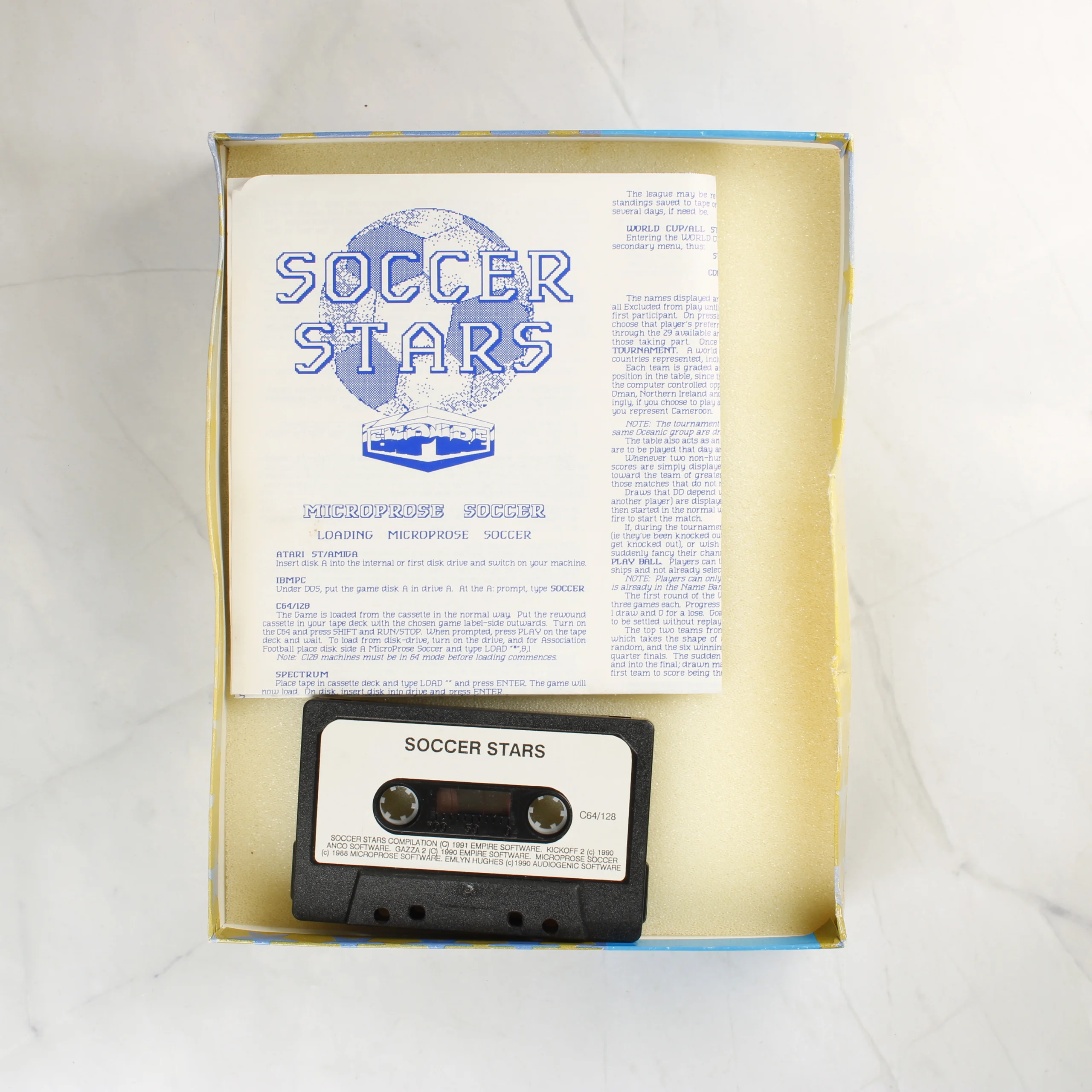 A Soccer Stars című videójáték-válogatás Commodore 64/128 platformra. A csomag öt klasszikus labdarúgó-szimulációt tartalmaz: MicroProse Soccer, Kick Off 2, Emlyn Hughes International Soccer, Gazza II és Gazza's Super Soccer. A termék az eredeti, nagyméretű kartondobozban található, amely sárga és kék színekben pompázik, rajta a játékok illusztrációival és logóival. A készlet része egy fekete színű, fehér címkés kazetta, amelyen a Soccer Stars felirat és a licencinformációk olvashatók, valamint egy többnyelvű használati útmutató. A doboz hátoldalán részletes leírások találhatók a válogatásban szereplő játékokról angol, francia, német és olasz nyelven. A kiadvány az Empire Software gondozásában jelent meg.