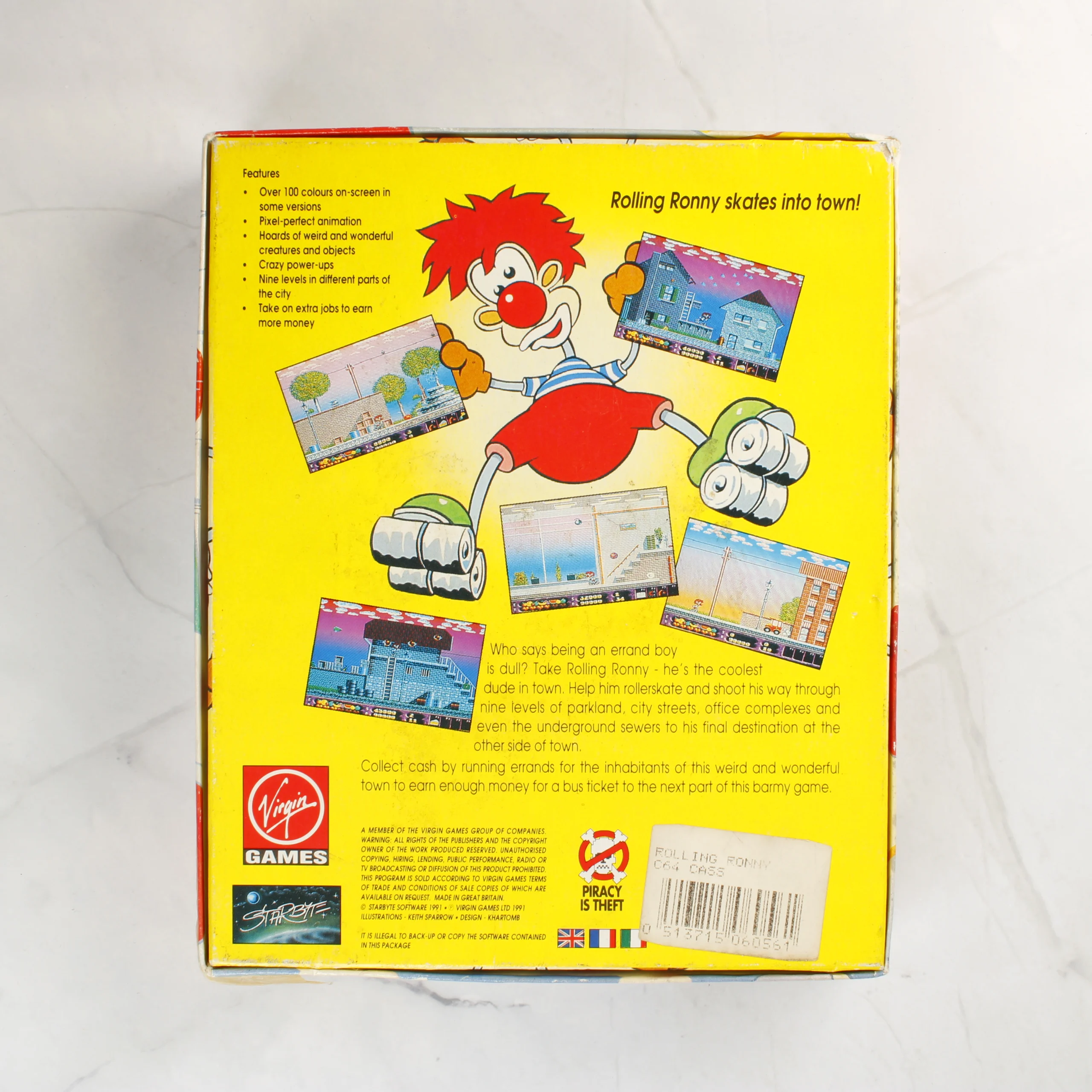 A Rolling Ronny című videójáték Commodore 64 platformra készült kiadása. A csomag tartalmazza az eredeti színes kartondobozt, egy fekete színű mágnesszalagos kazettát és egy többnyelvű használati útmutatót. A doboz elején egy görkorcsolyázó bohóc látható városi környezetben, a hátoldalon pedig játékmenet-fotók és angol nyelvű leírás olvasható. A Virgin Games által kiadott szoftver kazettáján fehér felirattal szerepel a cím és a platform megnevezése. A doboz sarkai és élei enyhén kopottak, a frontoldalon egy kézzel írt számjelzés látható egy fehér címkén.