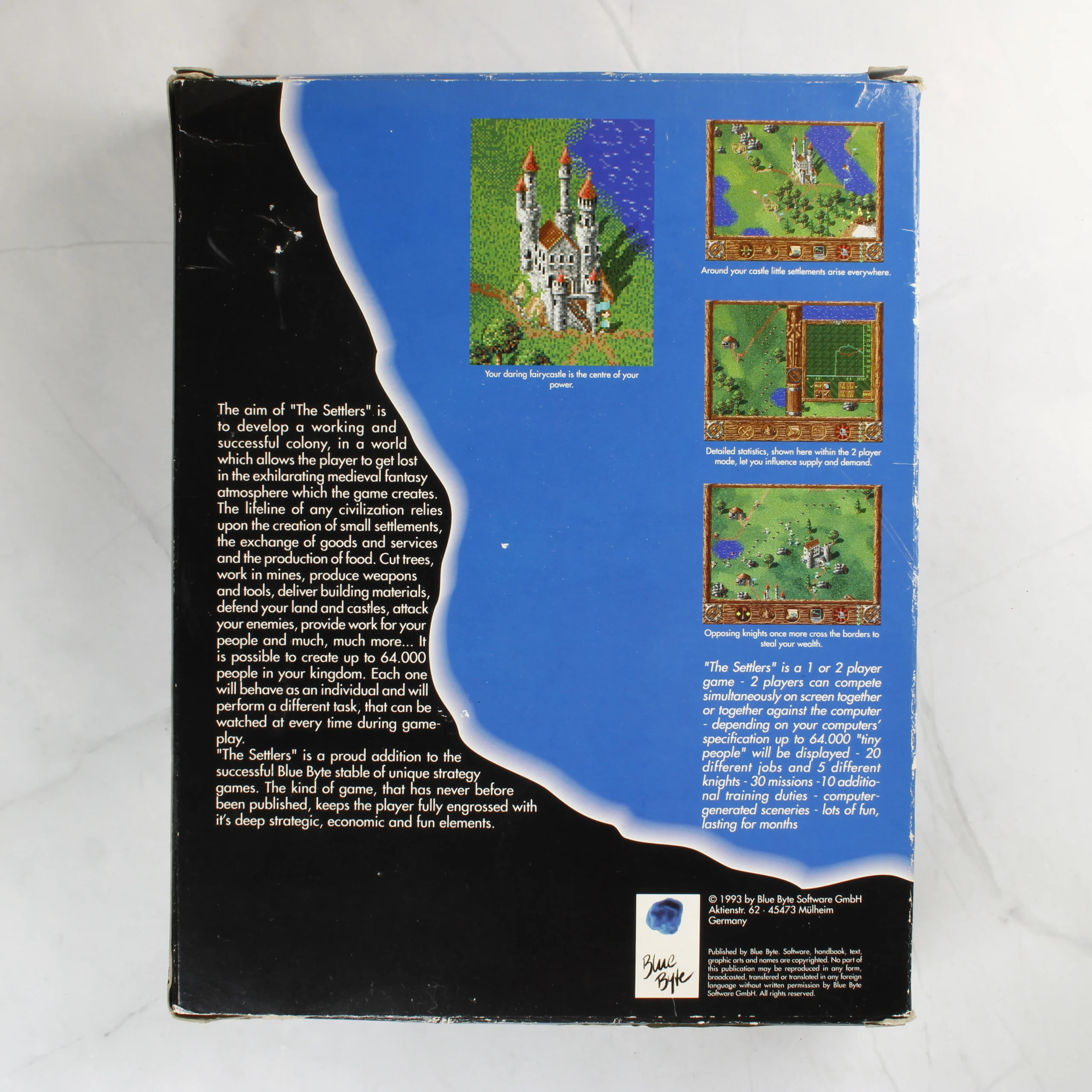 A The Settlers című stratégiai videójáték Amiga platformra kiadott változata. A csomag tartalmazza az eredeti kartondobozt és három darab kék színű, 3,5 colos floppy lemezt. A doboz elején a játékra jellemző illusztráció látható egy lovaggal, szélmalommal és egyéb karakterekkel, valamint több szaklap elismerő értékelése is feltüntetésre került. A hátoldalon angol nyelvű leírás és képernyőmentések mutatják be a játékmenetet. A kiadvány a Blue Byte Software gondozásában jelent meg 1993-ban. A lemezek feliratozottak, jelölve a sorszámukat (1/3, 2/3, 3/3).