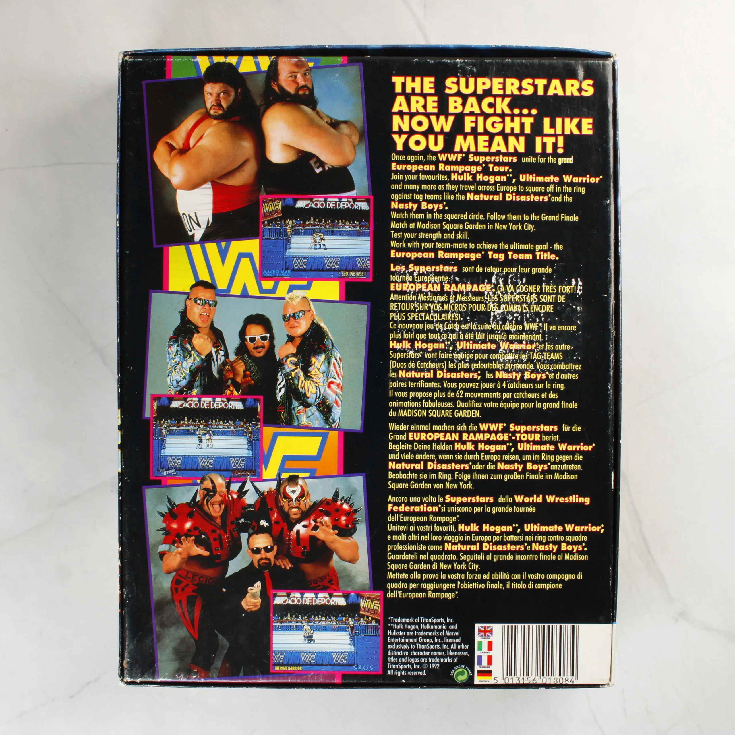 A WWF European Rampage Tour videójáték Amiga platformra készült kiadása. A csomag tartalmazza az eredeti színes kartondobozt, amelyen híres pankrátorok, mint az Ultimate Warrior és Bret Hart láthatóak. A dobozban megtalálható egy többnyelvű használati útmutató füzet, valamint két darab kék színű, 3,5 colos floppy lemez. A lemezeken fehér felirat jelzi a játék címét és a lemez sorszámát. A doboz hátoldalán többnyelvű leírás és játékmenet-fotók láthatóak. A kiadvány az Ocean Software gondozásában jelent meg 1992-ben, a World Wrestling Federation hivatalos licencével.