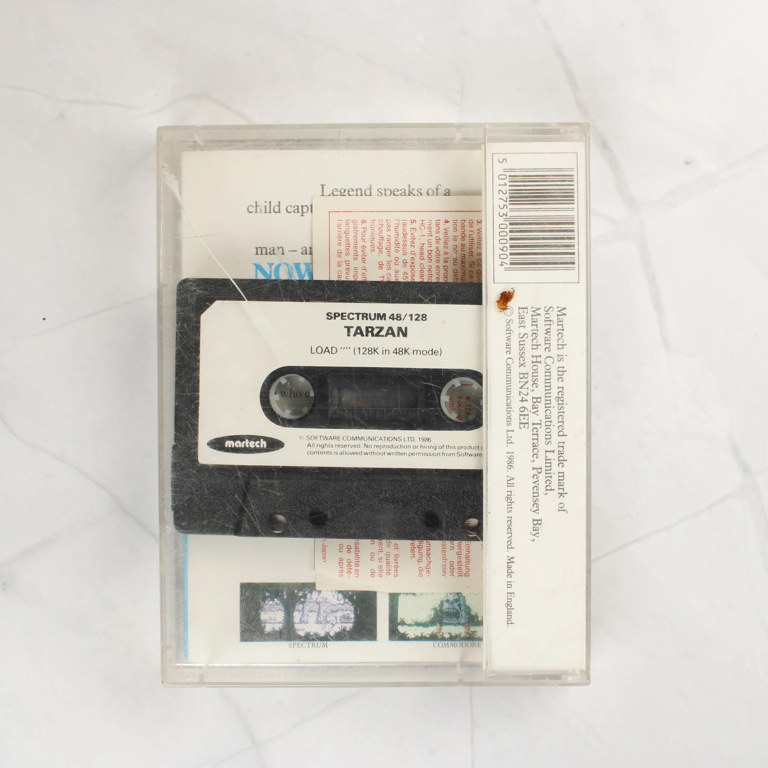 A Tarzan című videójáték ZX Spectrum 48/128 platformra kiadott változata. A csomag tartalmaz egy átlátszó műanyag tokot, egy színes borítót és egy fekete színű kazettát. A borítón Tarzan látható egy kötélen függve, mellette gorillák és egy oroszlán illusztrációja szerepel. A kazetta címkéje fehér, fekete feliratokkal, amelyeken a Martech logó és a betöltési utasítások olvashatók. A tok hátoldalán a vonalkód és a kiadó adatai látszanak. A termék korának megfelelő állapotban van, a műanyag tokon és a kazetta felületén használatból eredő apró karcok és kopások figyelhetők meg.