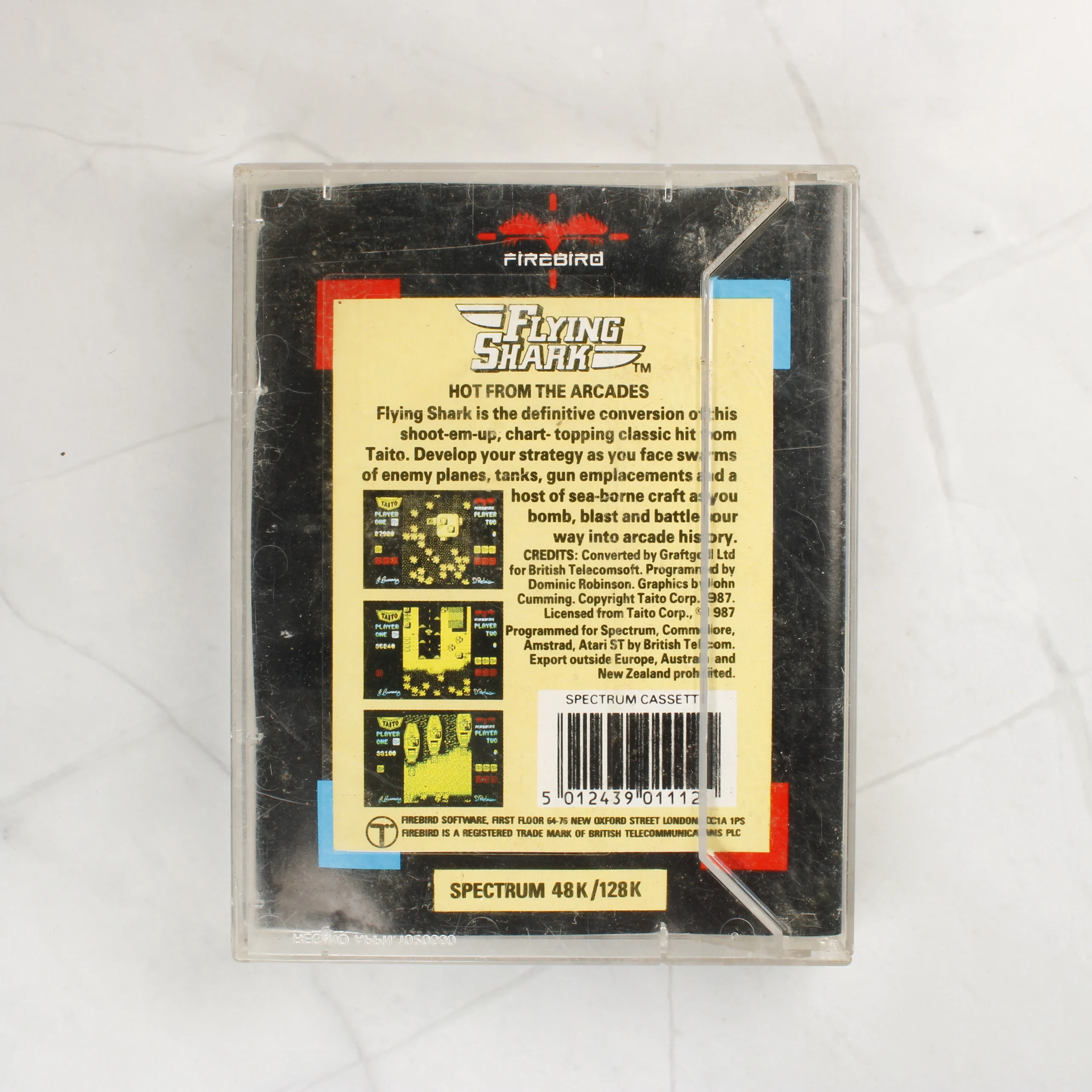 A Flying Shark című videójáték ZX Spectrum 48K/128K számítógépekre kiadott változata. A csomag tartalmazza az eredeti műanyag tokot, a színes borítót és a fekete színű mágnesszalagos kazettát. A borító előlapján egy harci repülőgép látható akció közben, a Firebird és a Taito logóival. A hátoldalon angol nyelvű leírás, képernyőmentések és a készítők névsora olvasható. A kazetta címkéje fehér alapon fekete és piros feliratokkal rendelkezik, rajta a játék címével és a platform megjelölésével. A műanyag tok átlátszó, felületén használatból eredő apró karcok és kopások láthatóak.