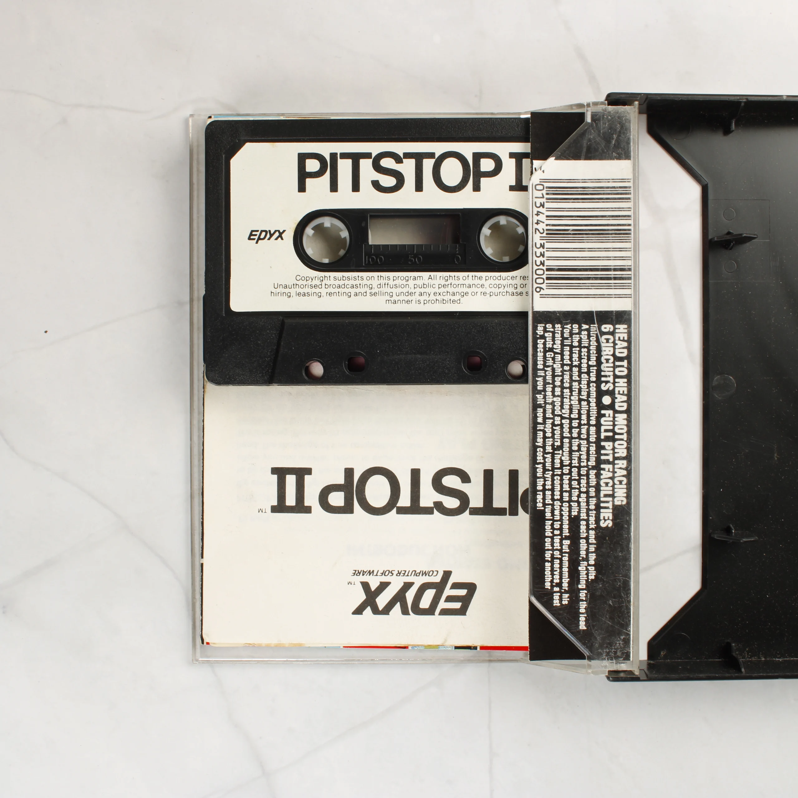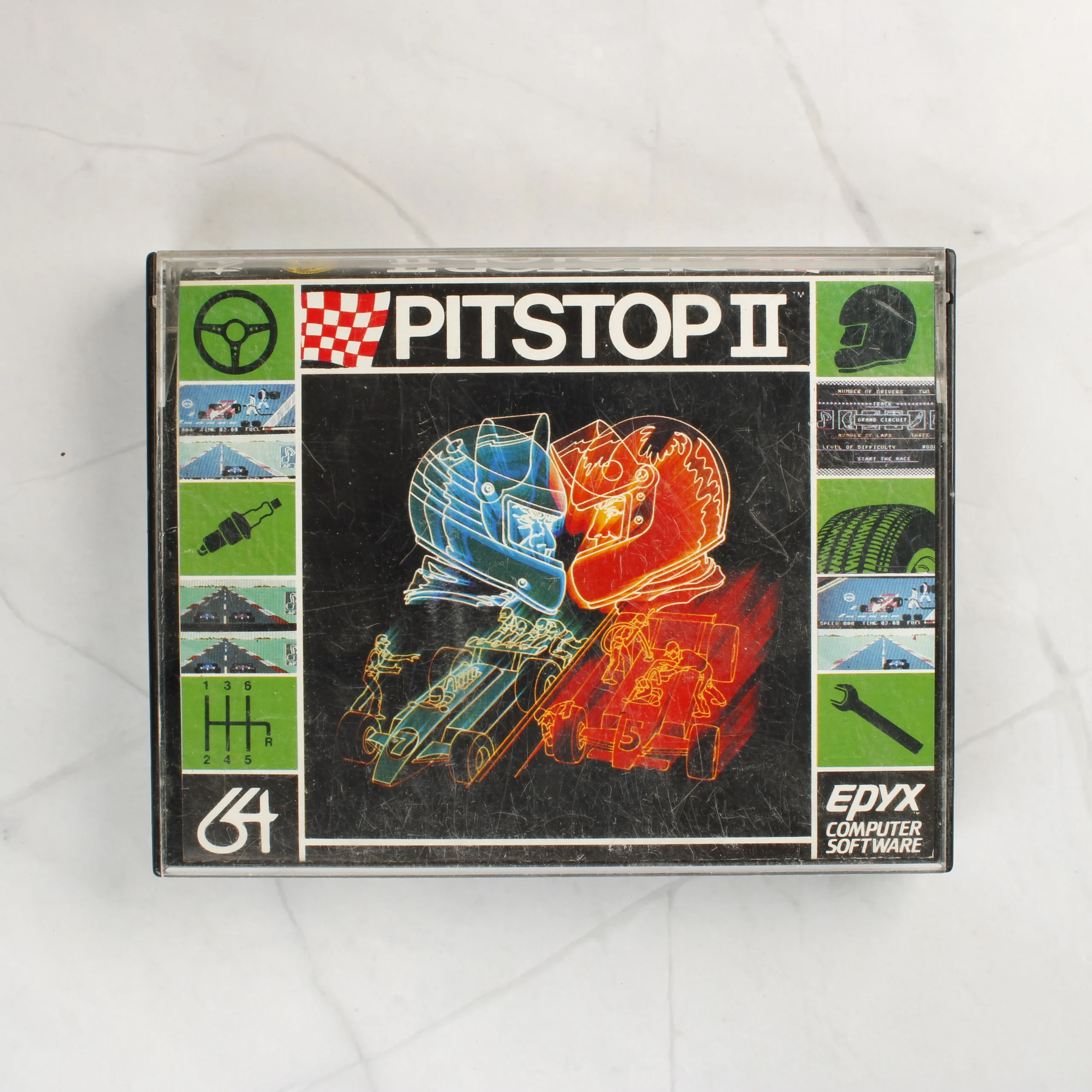 A Pitstop II című videójáték Commodore 64 platformra készült kiadása. A csomag egy fekete műanyag tokot, egy színes borítót és egy mágnesszalagos kazettát tartalmaz. A borítón két versenyző sisakja és versenyautók láthatók neonos körvonalakkal, valamint a játékmenetből vett képernyőmentések és technikai ikonok. A kazetta fekete színű, fehér címkével, amelyen a játék címe és az Epyx logója szerepel. A műanyag tok átlátszó előlappal rendelkezik, amelyen használatból eredő karcolások láthatók. A belső papírborító hátoldalán angol nyelvű leírás és vonalkód található. A termék az Epyx Computer Software gondozásában jelent meg.