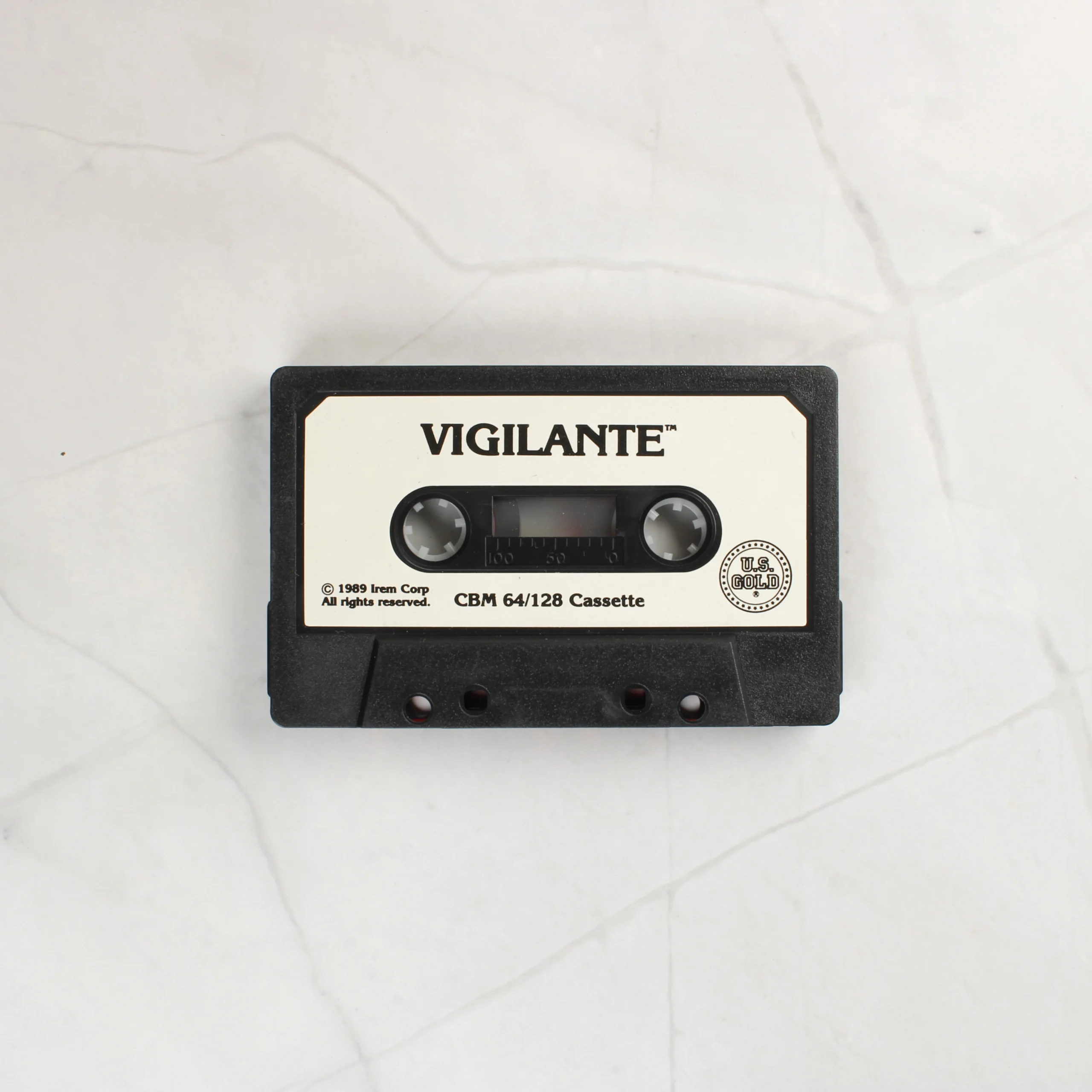 A Vigilante című videójáték Commodore 64 és 128 rendszerekhez készült kiadása. A csomag tartalmazza az eredeti műanyag tokot, a színes borítót és a fekete színű mágnesszalagos kazettát. A borító előlapján akciódús illusztráció látható, amely egy utcai harcot ábrázol, alul pedig a CBM 64/128 Cassette felirat olvasható. A hátoldalon angol és francia nyelvű leírás, valamint játékmenet-képek találhatók. A kazetta fehér címkével rendelkezik, amelyen a játék címe és a kiadó logója szerepel. A termék az U.S. Gold gondozásában jelent meg 1989-ben. A műanyag tok átlátszó, a borító papírja és a kazetta állapota a képek alapján megkímélt.