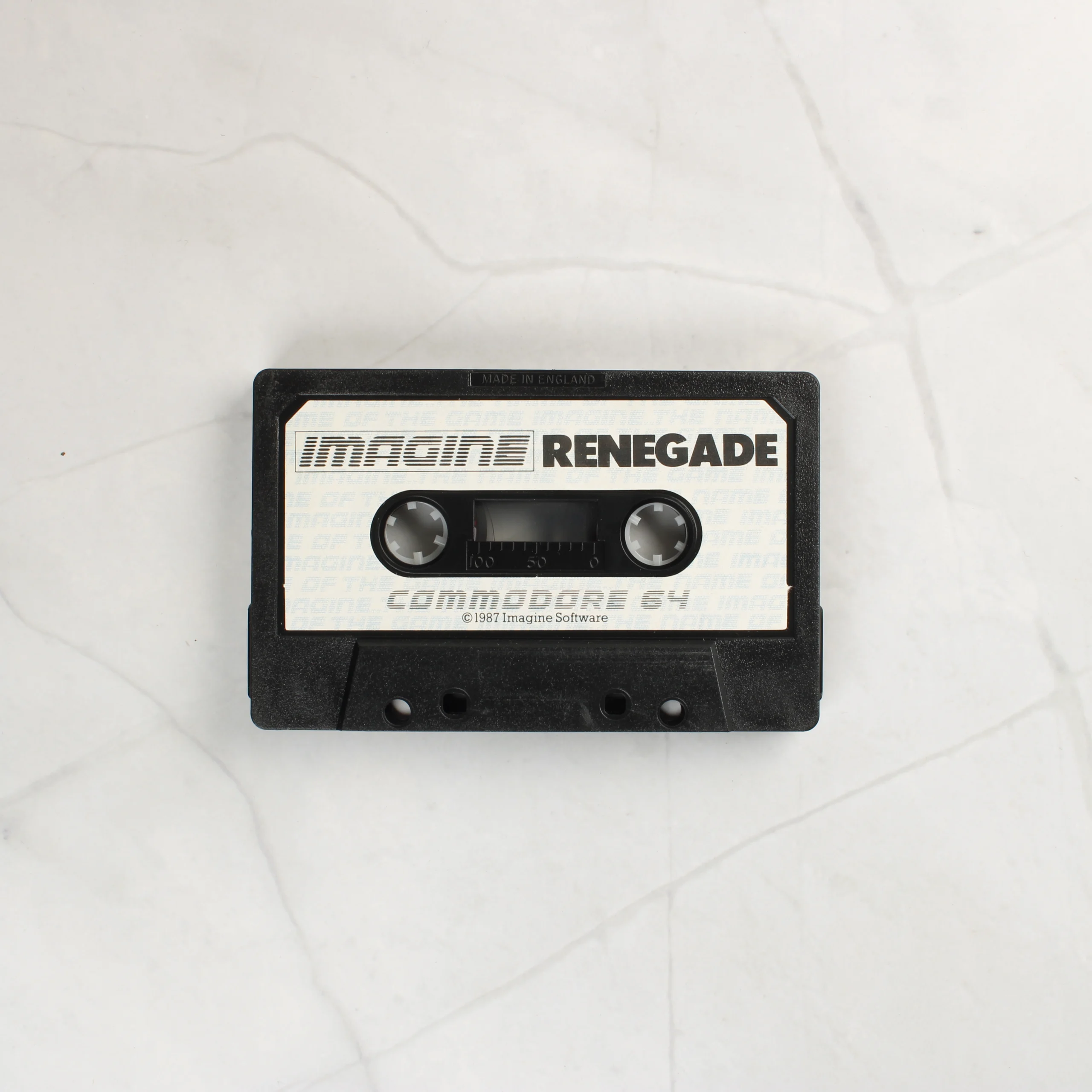 A Renegade című videójáték Commodore 64 platformra készült kiadása. A csomag tartalmaz egy átlátszó műanyag tokot, egy színes borítót és egy fekete színű mágnesszalagos kazettát. A borító elején akciódús illusztráció látható, amely utcai harcot ábrázol, rajta az Imagine és a Taito logókkal. A hátoldalon angol nyelvű leírás és két képernyőkép található a játékmenetből. A kazetta fehér címkéjén fekete feliratok jelzik a címet és a gyártót. A tokon és a borítón használatból eredő apró karcok és kopások láthatóak, a borító elülső részén sárga filctollas felirat található.