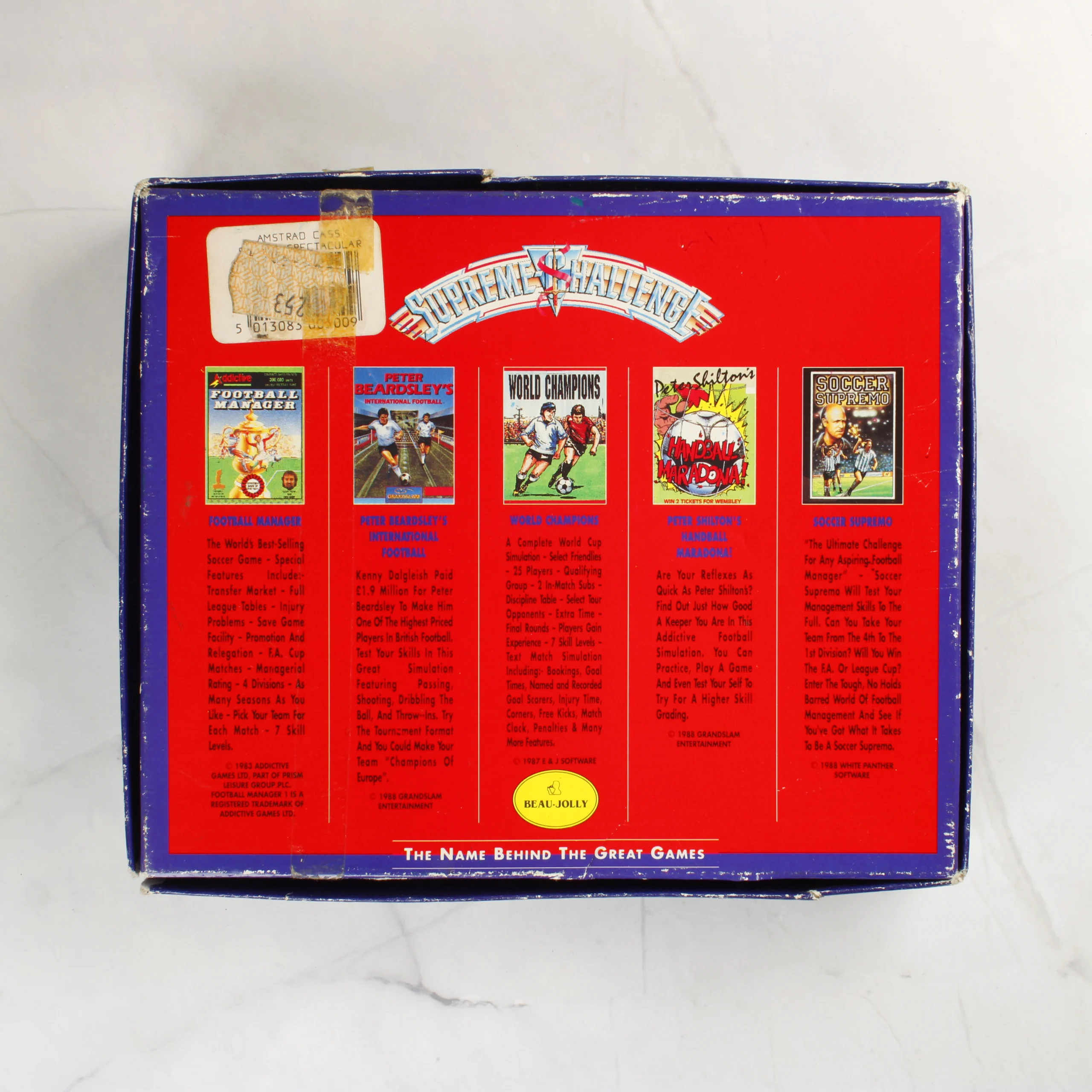 A Soccer Spectacular egy Amstrad 464/6128 számítógépekre kiadott videójáték-válogatás, amely öt különböző labdarúgó-tematikájú programot tartalmaz. A piros színű kartondoboz elején a FIFA világbajnoki trófea látható, felette a Supreme Challenge felirattal. A csomag két darab magnókazettát tartalmaz: egy fehér színű Soccer Double 2 kazettát és egy fekete Soccer Spectacular kazettát, amelyek egy fekete műanyag tálcában helyezkednek el. A készlethez tartozik egy fehér papír alapú használati útmutató is, amely felsorolja a tartalmazott játékokat, mint például a Football Manager és a World Champions. A doboz hátoldalán részletes leírások és képernyőképek láthatóak az egyes játékokról.