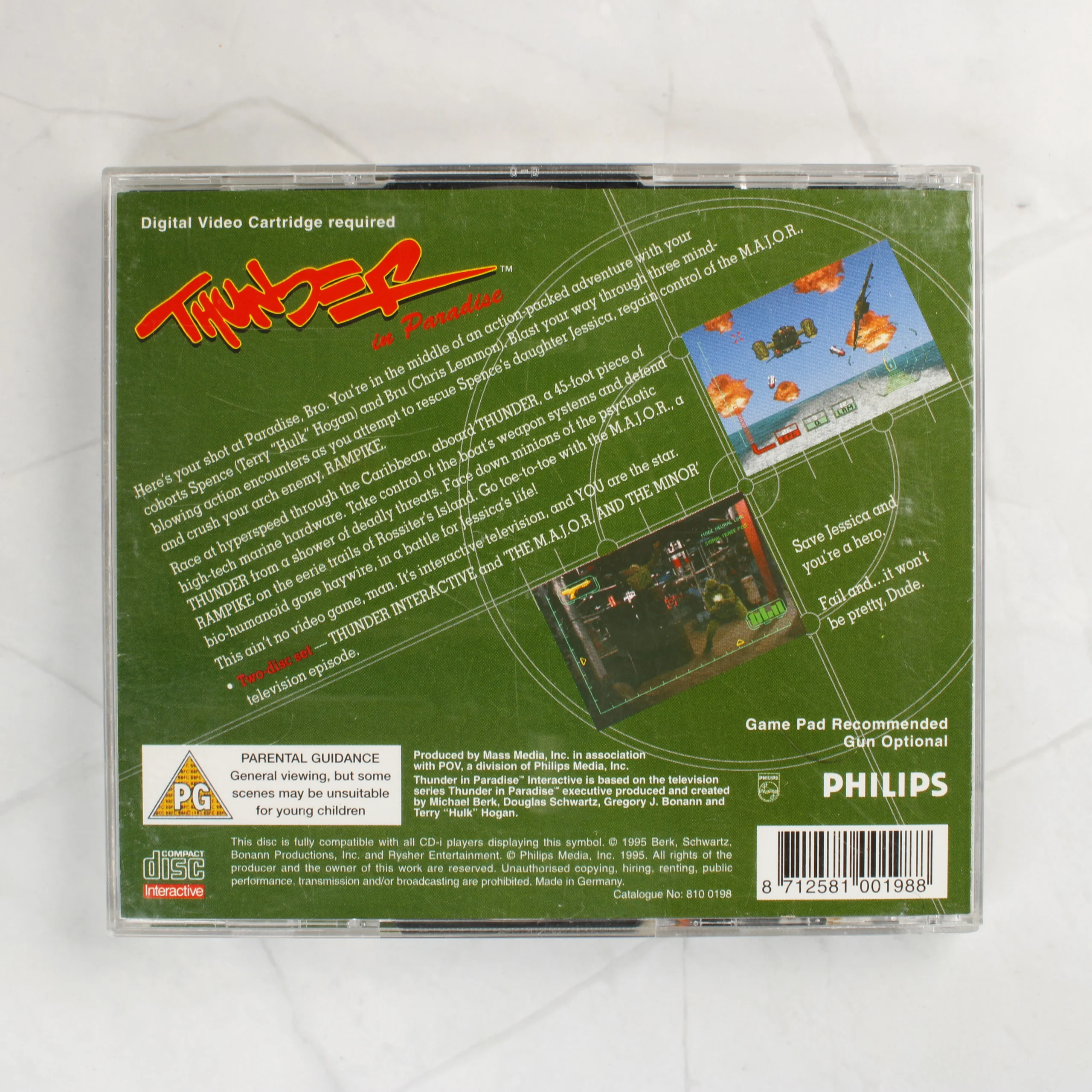 A Philips CD-i platformra megjelent Thunder in Paradise interaktív videójáték és televíziós epizód gyűjteménye. A csomag egy vastag, fekete tálcás műanyag tokban található, amely két lemezt tartalmaz: az első lemezen maga a játék, a másodikon pedig egy televíziós epizód kapott helyet. A borítón Terry 'Hulk' Hogan látható akció közben, mellette egy futurisztikus hajó és egy helikopter képeivel. A tok hátoldala zöld alapszínű, rajta angol nyelvű leírással, játékmenet-fotókkal és a technikai követelményekkel, mint például a Digital Video Cartridge szükségessége. A termék korának megfelelő állapotban van, a műanyag tokon és a papírborítón kisebb kopások és használati nyomok láthatóak.