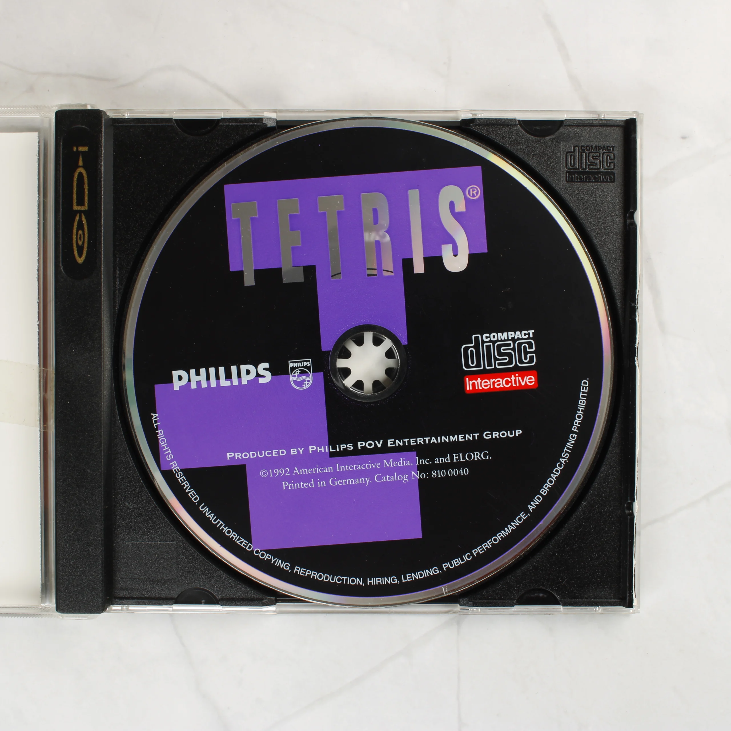 A Tetris videójáték Philips CD-i platformra készült kiadása. A termék egy normál CD-tokban található, amelynek előlapján a klasszikus Tetris logó és stilizált kék-lila alakzatok láthatók fekete háttér előtt. A tok hátoldalán angol nyelvű leírás, egy játékmenet-kép és a Philips POV Entertainment Group logója szerepel. A csomag tartalmazza az eredeti CD-lemezt is, amely fekete és lila színekkel nyomtatott, rajta a Philips és a Compact Disc Interactive feliratokkal. A lemezen látható adatok szerint a kiadvány 1992-ben készült Németországban. A műanyag tok felületén használatból eredő karcok és kopások láthatók, a papírborító élei mentén enyhe kopás tapasztalható.