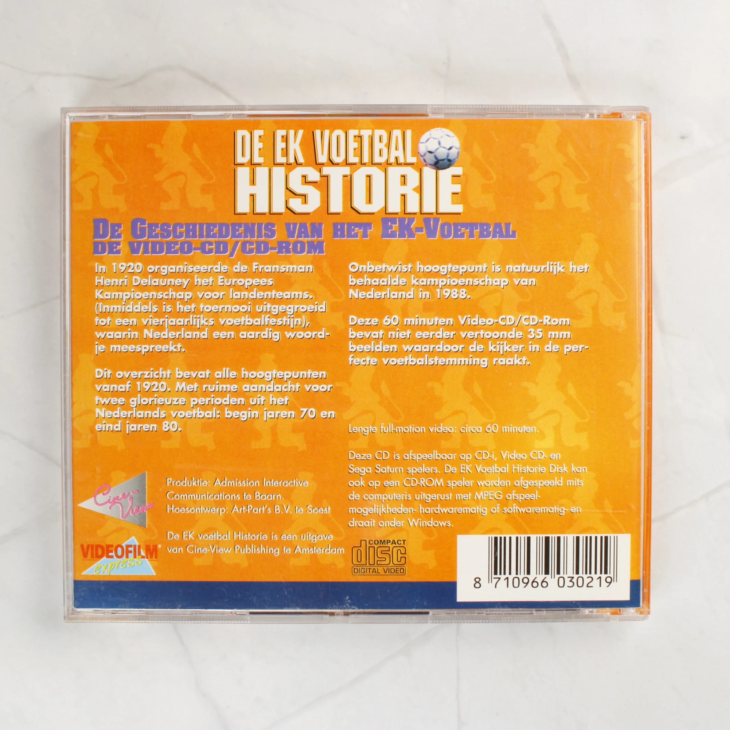 De EK Voetbal Historie 1920-1992 labdarúgó Európa-bajnokság történetét bemutató Video-CD és CD-ROM hibrid kiadvány narancssárga tokban.