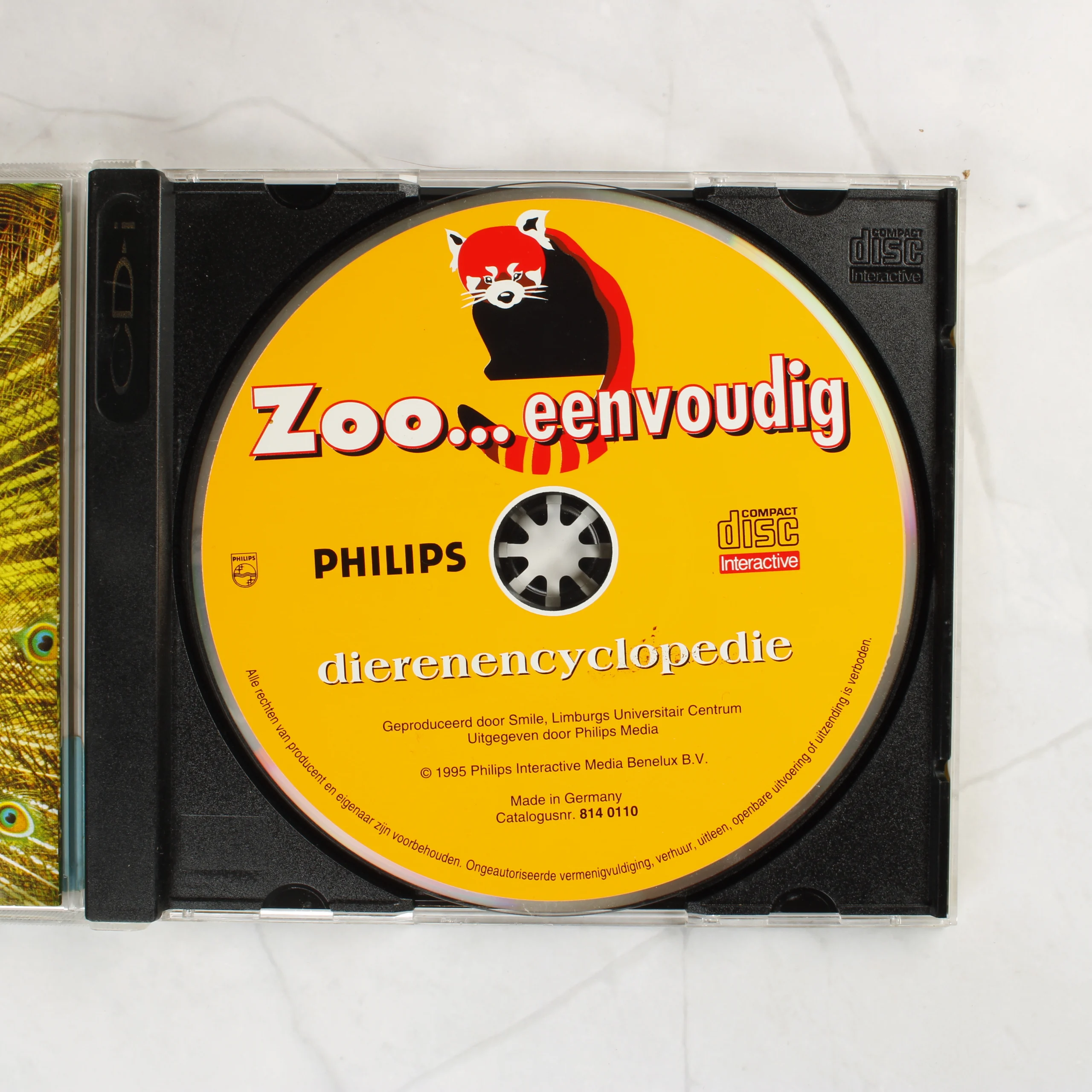 A Philips által kiadott Zoo... eenvoudig dierenencyclopedie egy CD-i formátumú interaktív szoftver, amely az Antwerpeni Állatkert világát mutatja be. A termék egy vastag, fekete tálcás műanyag tokban található, amelynek előlapján színes állatfotók – többek között elefánt, páva és vörös macskamedve – láthatóak. A tok elülső részén egy fehér árcímke és vonalkódos matrica maradványa észlelhető. A hátlapon holland nyelvű leírás, képernyőmentések és a Philips logója szerepel. A lemez maga sárga alapszínű, rajta a vörös macskamedve illusztrációjával és a Compact Disc Interactive logóval. A kiadvány 1995-ös gyártású, Németországban készült. A tokon és a borítón kisebb használati nyomok és felületi karcok láthatóak, de az összkép megkímélt állapotot tükröz.