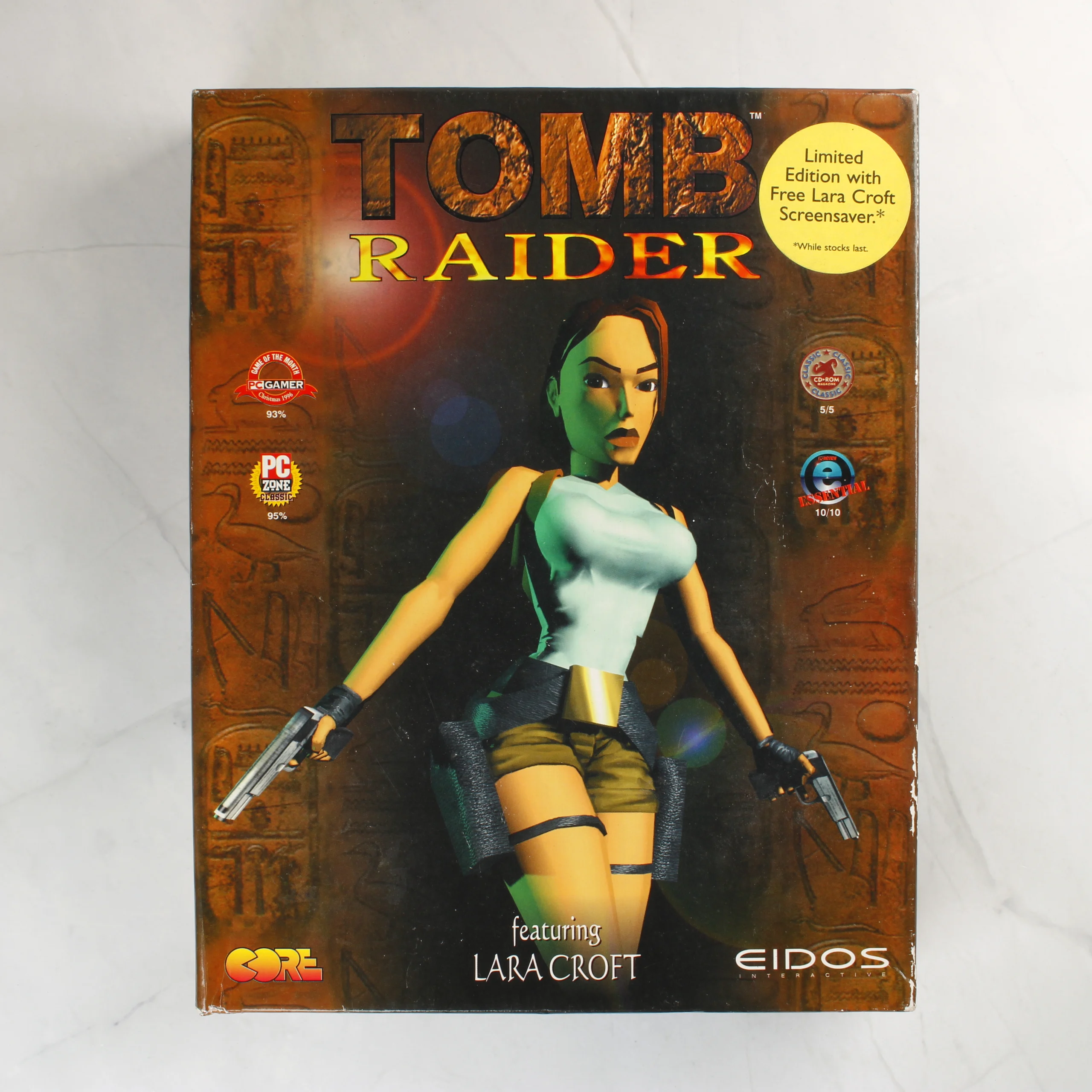 A Tomb Raider videójáték PC-s kiadása nagy méretű kartondobozban. A doboz elején Lara Croft karaktere látható két pisztollyal, felette a játék címe olvasható. A csomagoláson egy sárga kör alakú felirat jelzi, hogy ez egy limitált kiadás, amely tartalmaz egy ingyenes Lara Croft képernyővédőt is. A doboz hátoldalán játékmenetből származó képernyőképek, leírások és különböző szaklapok értékelései találhatók. A belső fekete műanyag tálcában egy papírtokos CD-ROM látható, amely a bónusz képernyővédőt tartalmazza. A doboz élei mentén fehér kopásnyomok és kisebb benyomódások figyelhetők meg, különösen a sarkoknál. A grafika színei élénkek, a feliratok jól olvashatók.