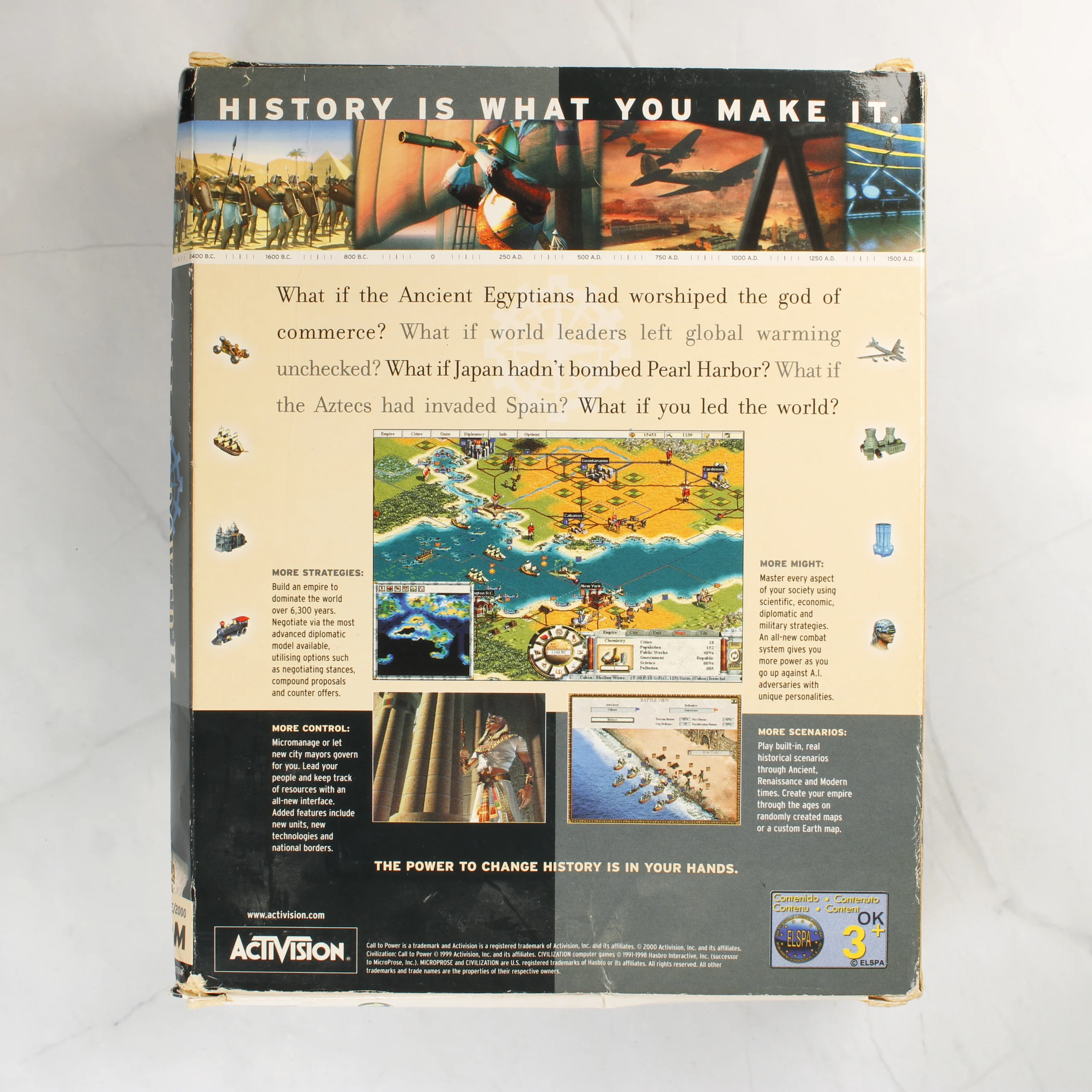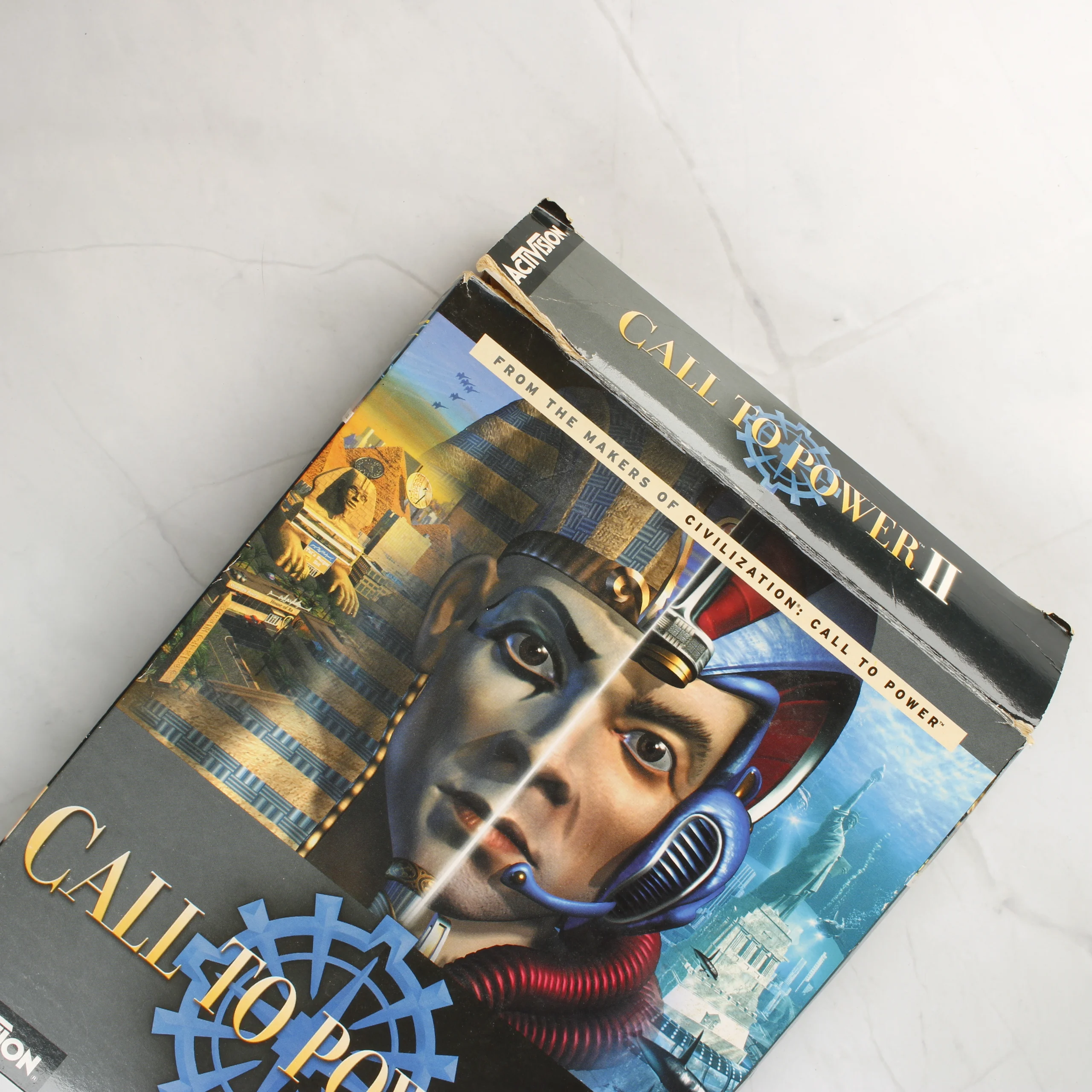 A Call to Power II című PC-s stratégiai játék nagy dobozos kiadása, amely tartalmazza az első Civilization: Call to Power részt is. A csomag két különálló, normál CD-tokban elhelyezett lemezt foglal magában. A külső kartondoboz elején egy kettéosztott arc látható, amely az ókori és a futurisztikus korszakokat szimbolizálja, hátoldalán pedig játékmenet-képek és leírások találhatók. A lemezek felülete grafikával ellátott: a második részé szürke fogaskerekes mintázatú, míg az elsőé kék alapszínű, idővonalas díszítéssel. A doboz élei mentén látható kopások és kisebb szakadások találhatók, különösen a felső zárófülnél.