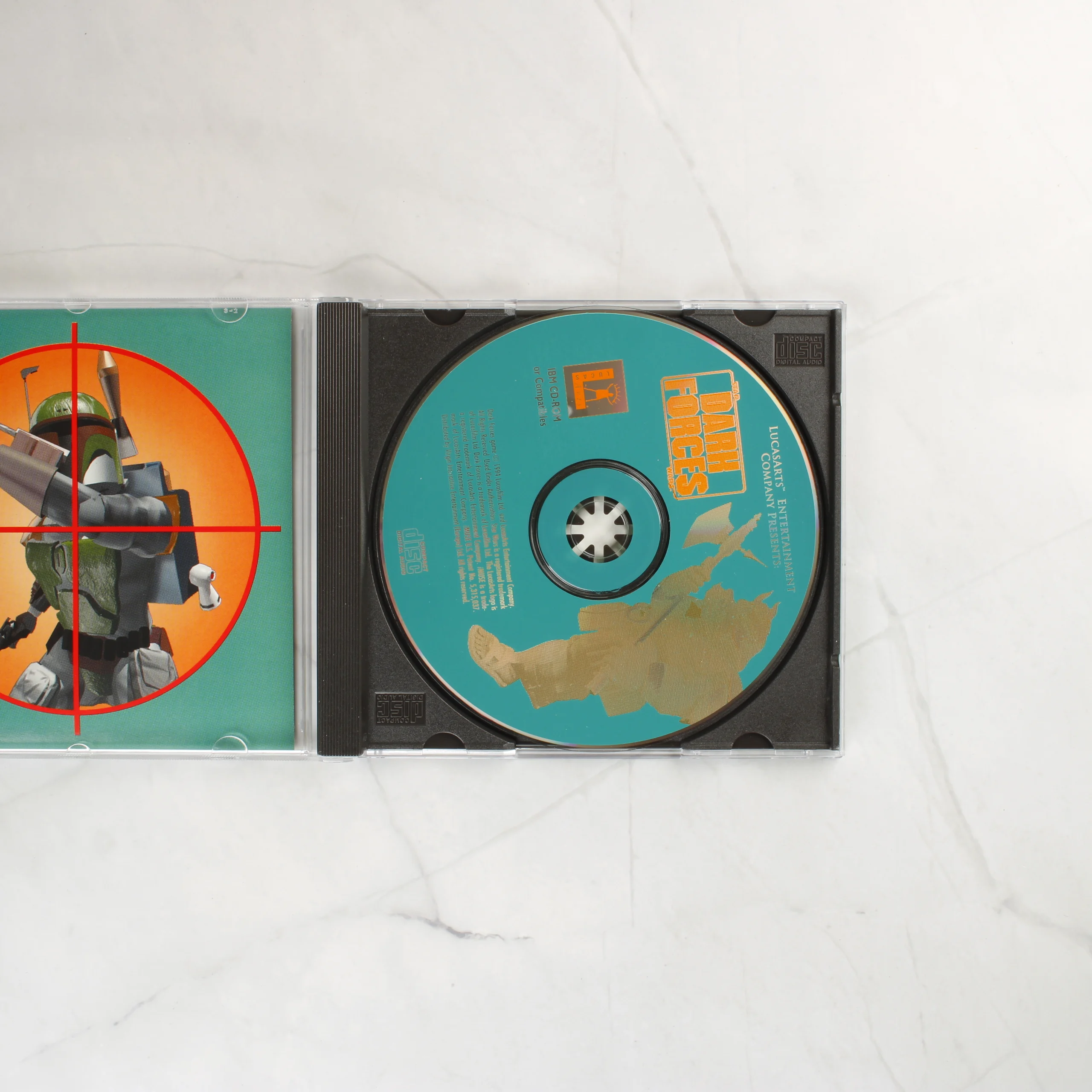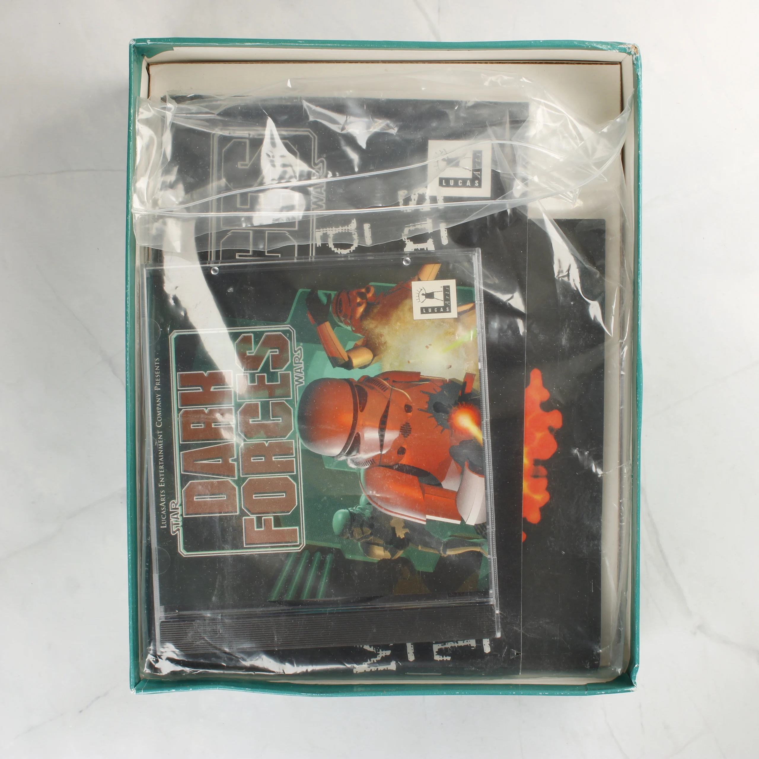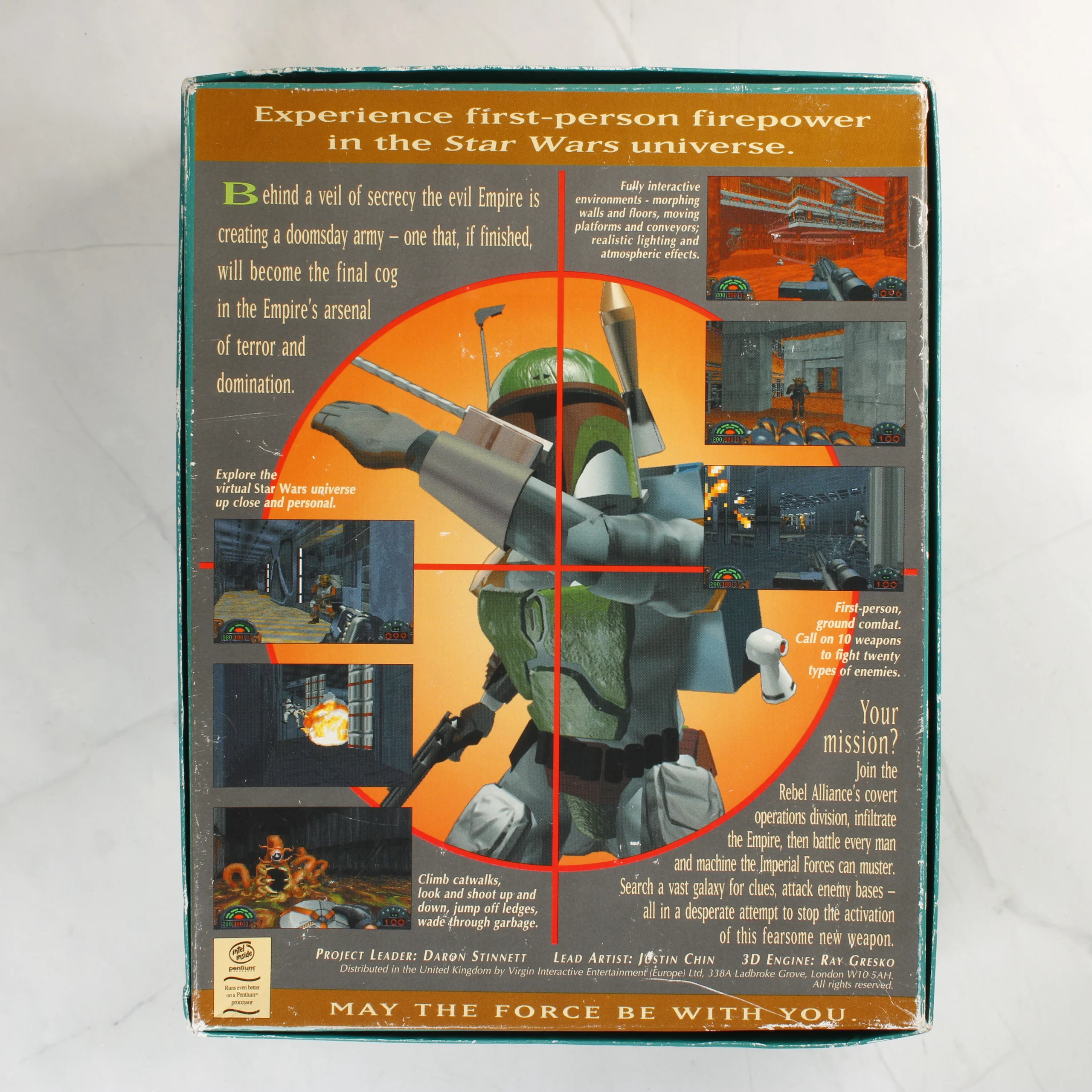 A Star Wars: Dark Forces videójáték eredeti, nagy dobozos kiadása PC-re. A csomag tartalmazza a színes illusztrációval ellátott külső kartondobozt, a belső tartót, egy műanyag tokos CD-ROM-ot és a hozzá tartozó dokumentációt. A doboz elején birodalmi rohamosztagosok láthatóak harc közben, míg a hátoldalon Boba Fett grafikája és játékmenet-felvételek szerepelnek. A CD-ROM türkizkék felületű, rajta a játék logójával és a LucasArts emblémájával. A kiadvány az IBM CD-ROM kompatibilis rendszerekhez készült. A csomagoláson látható a Virgin Interactive Entertainment forgalmazói felirata is.