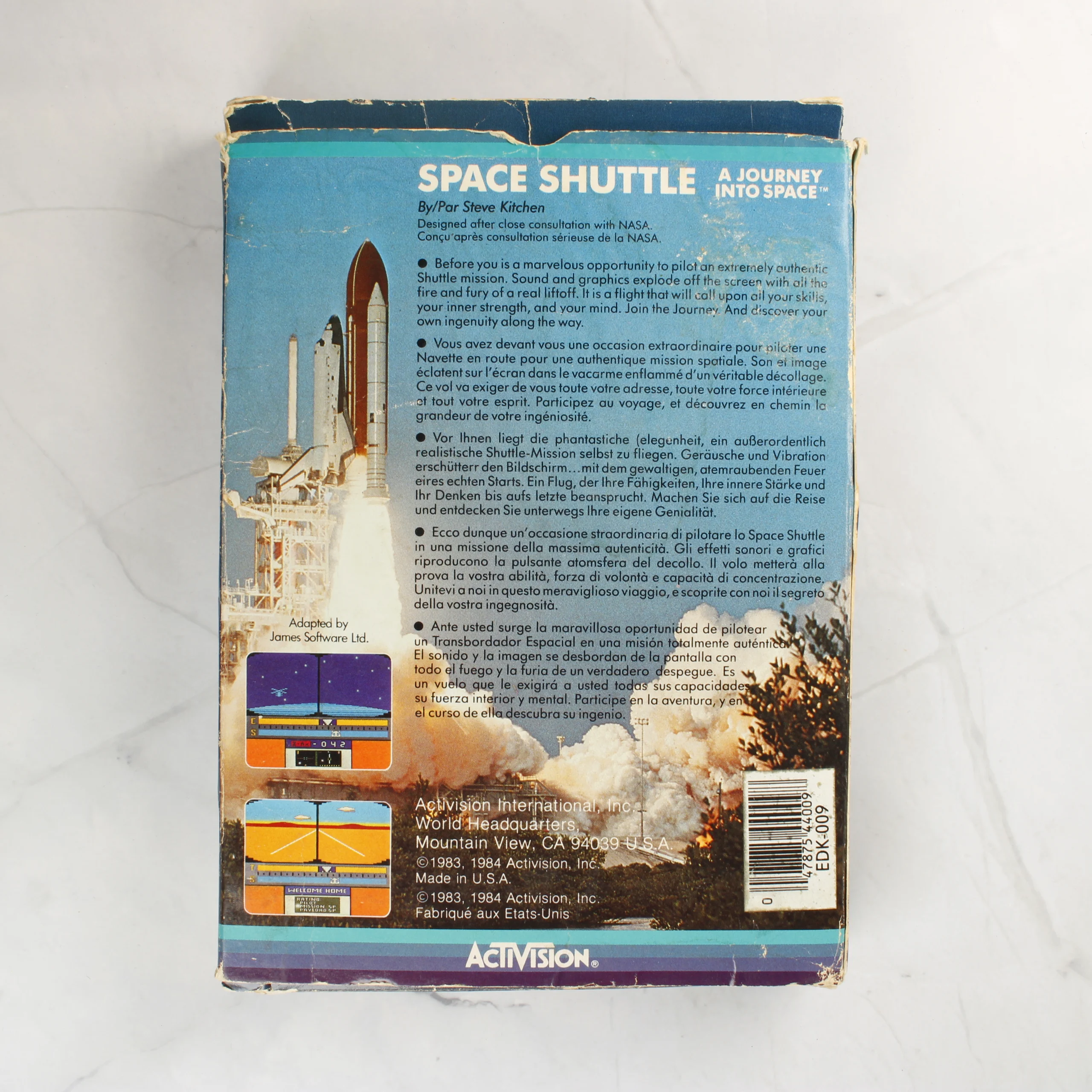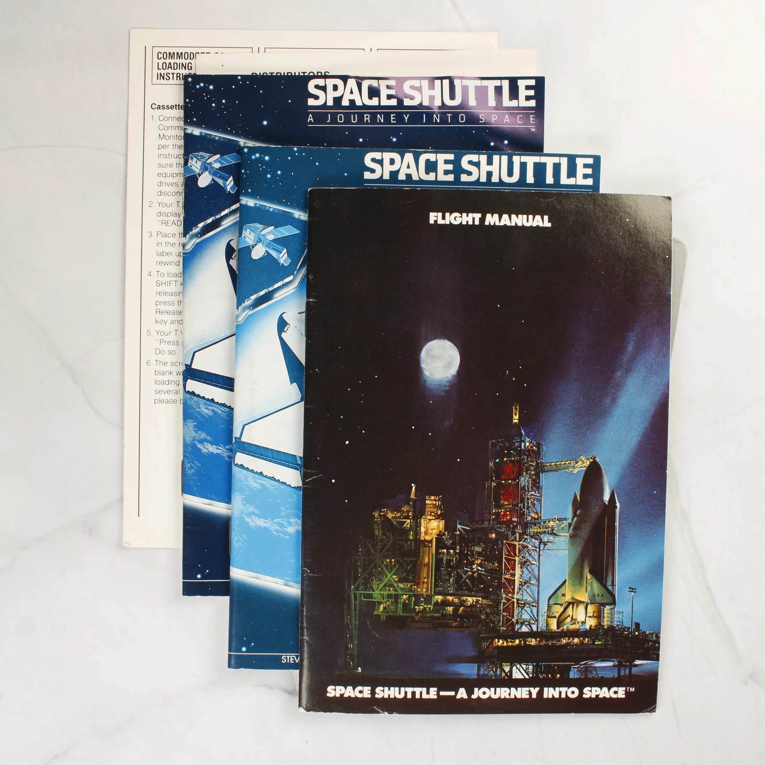 A Space Shuttle: A Journey Into Space egy űrszimulátor videójáték Commodore 64 platformra, az Activision gondozásában. A csomag tartalmazza az eredeti kartondobozt, amelyen egy űrrepülőgép látható a Föld körüli pályán. A készlet része egy műanyag tokban elhelyezett magnókazetta, egy átlátszó műanyag belső tálca, valamint több nyomtatott dokumentáció, köztük egy részletes Flight Manual (repülési kézikönyv) és betöltési útmutató. A doboz grafikája sötétkék alapszínű, fehér és sárga feliratokkal. A kazetta fehér színű, fekete felirattal, és az Egyesült Királyságban készült. A dokumentációk színes borítóval rendelkeznek, amelyek az űrrepülőgép indítását és különböző fázisait ábrázolják.