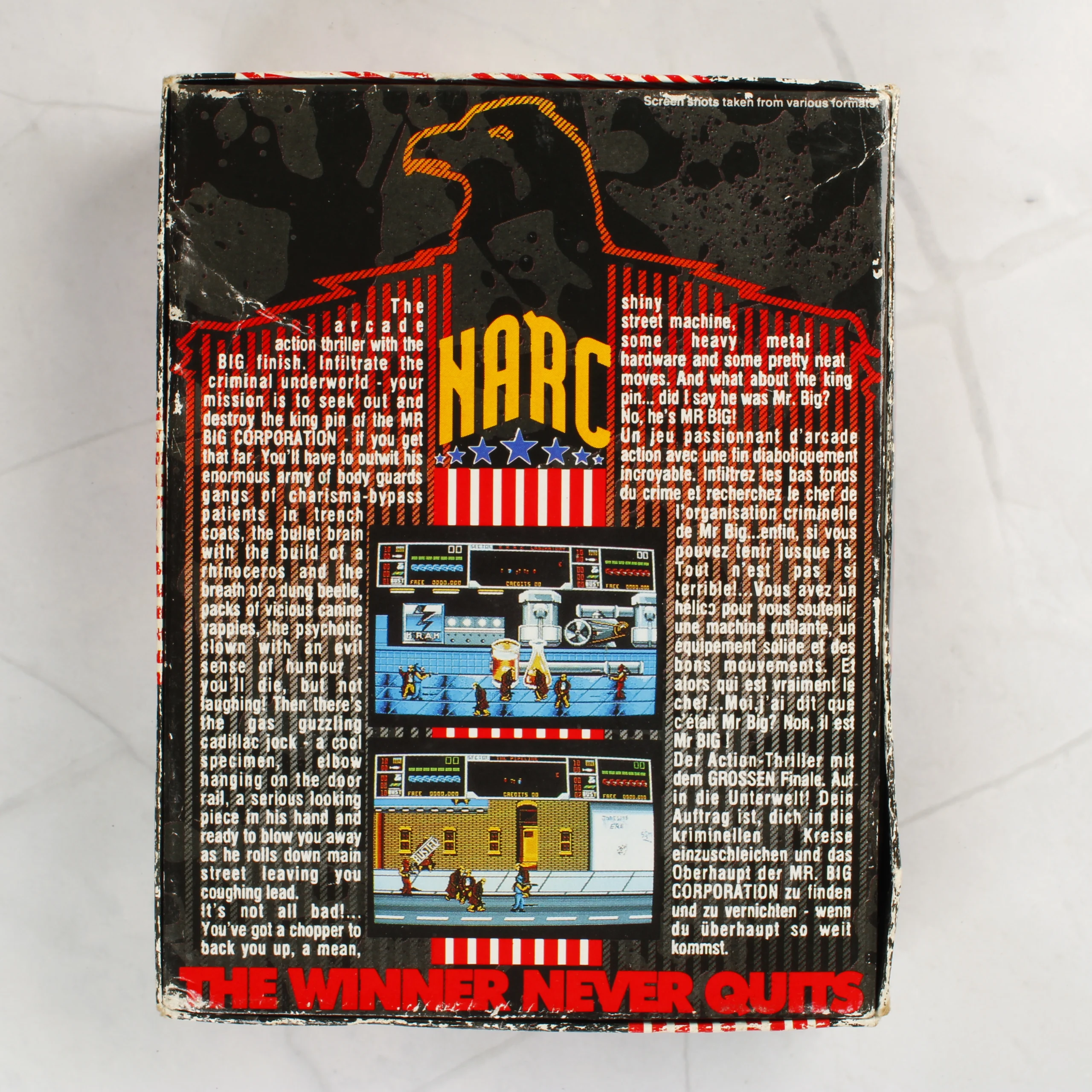 A NARC című videójáték ZX Spectrum platformra készült kiadása. A csomag tartalmazza az eredeti kartondobozt, egy fekete színű mágneskazettát és a hozzá tartozó nyomtatott használati útmutatót. A doboz elején színes, akciódús illusztráció látható fegyveres karakterekkel és az Ocean logójával. A hátoldalon többnyelvű leírás és játékmenetből vett képernyőfotók szerepelnek. A kazettán kék felirat jelzi a kompatibilitást a Spectrum 128/+2/+3 modellekkel. A csomagolás élei és sarkai láthatóan kopottak, a karton felületén több helyen fehér kopásnyomok és kisebb benyomódások észlelhetők. A kazetta felülete poros, de ép.