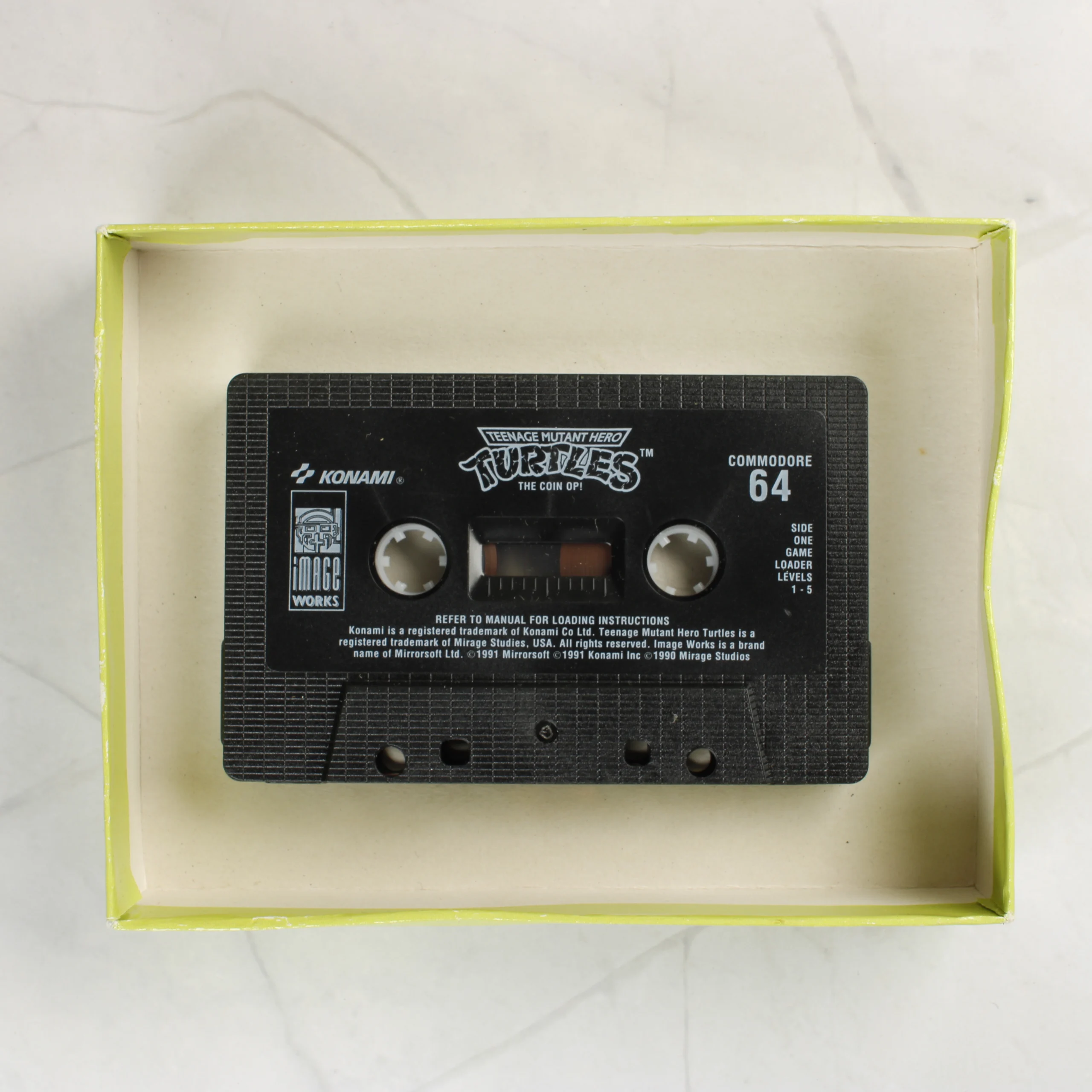 A Teenage Mutant Hero Turtles: The Coin-Op! című videójáték Commodore 64 platformra készült kiadása. A csomag egy sárgászöld alapszínű kartondobozt és egy fekete színű mágnesszalagos kazettát tartalmaz. A doboz elején az ikonikus nindzsa teknőcök láthatóak gördeszkákkal egy csatornafedél felett, valamint a Konami és az Image Works logói. A hátoldalon angol, francia és német nyelvű leírás, képernyőmentések és egy játéktermi automata illusztrációja szerepel. A fekete kazettán fehér feliratok jelzik a címet, a gyártót és a technikai adatokat. A doboz felületén jelentős kopások, szakadások és anyaggyengülés látható, különösen az éleken és a sarkokon.