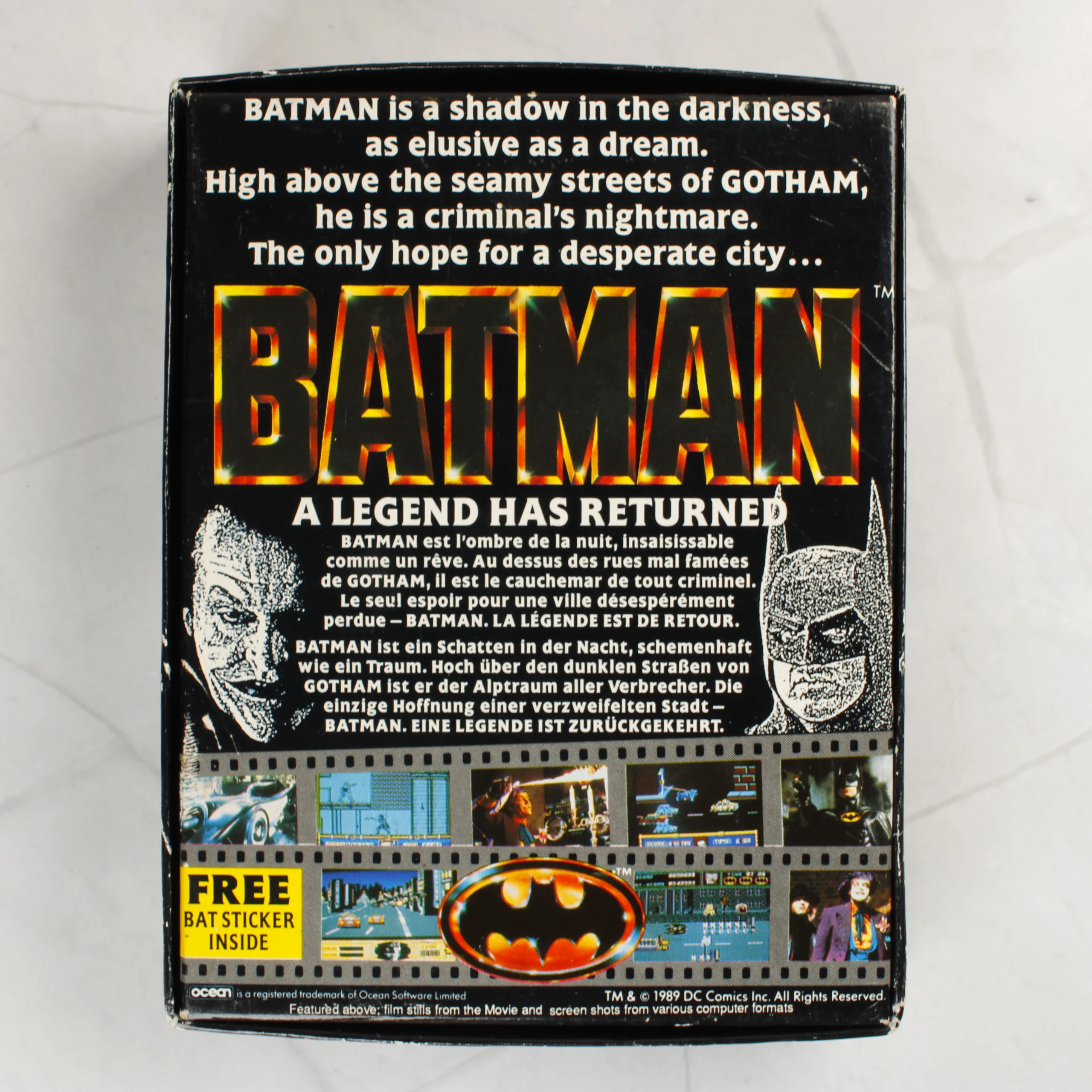A Batman: The Movie című videójáték eredeti, kartondobozos kiadása ZX Spectrum (48/128) platformra. A fekete színű doboz elején a klasszikus sárga-fekete Batman logó és az Ocean szoftverkiadó emblémája látható. A hátoldalon angol, francia és német nyelvű leírás, valamint a játékból és a filmből származó jelenetképek találhatók. A csomag tartalmazza az eredeti fekete műanyag kazettát, amelyen kék felirat jelzi a címet és a kompatibilitást. A doboz élei mentén kopások és kisebb fehér benyomódások láthatók, különösen a sarkoknál, de a szerkezete ép. A kazetta felülete tiszta, a szalag szemrevételezés alapján épnek tűnik.