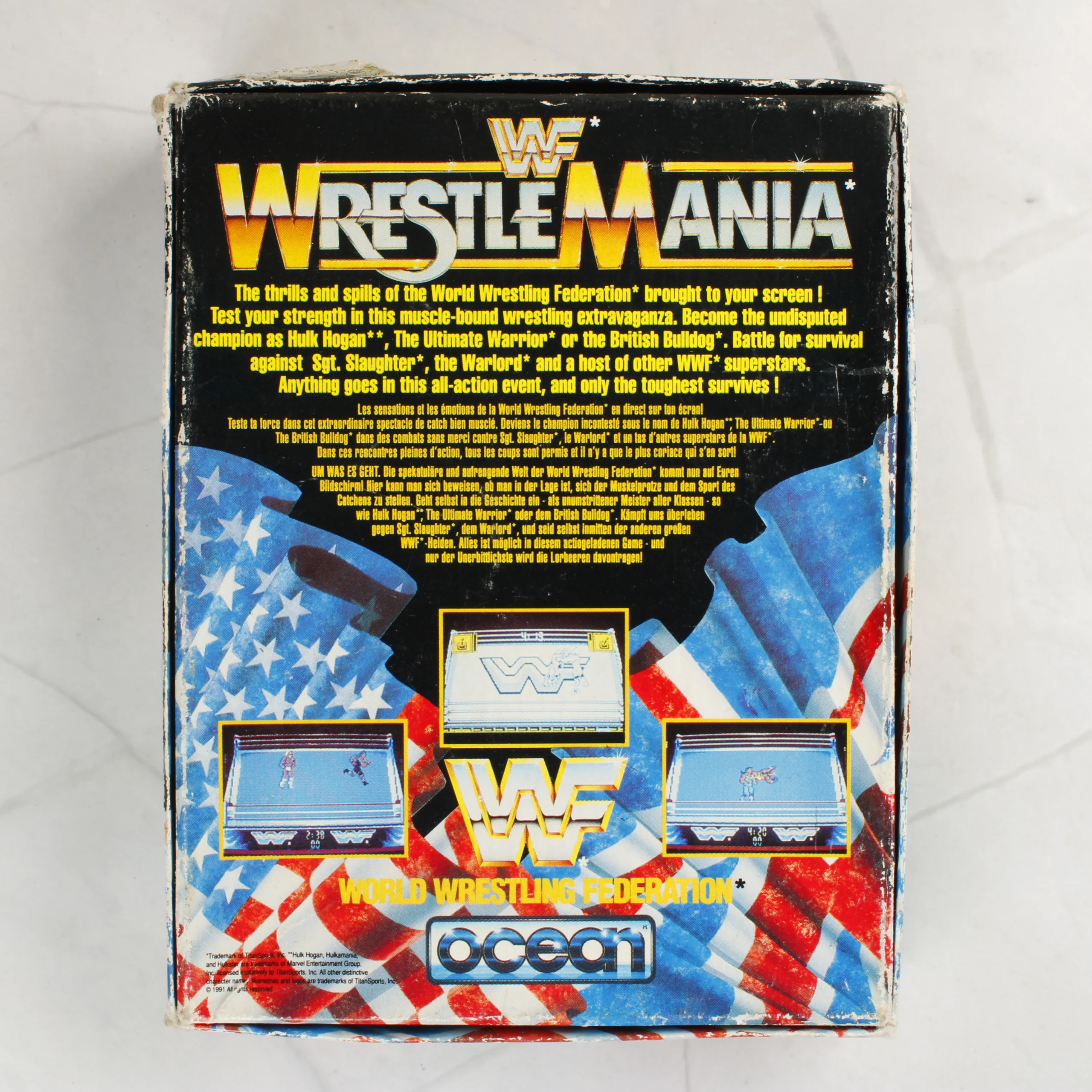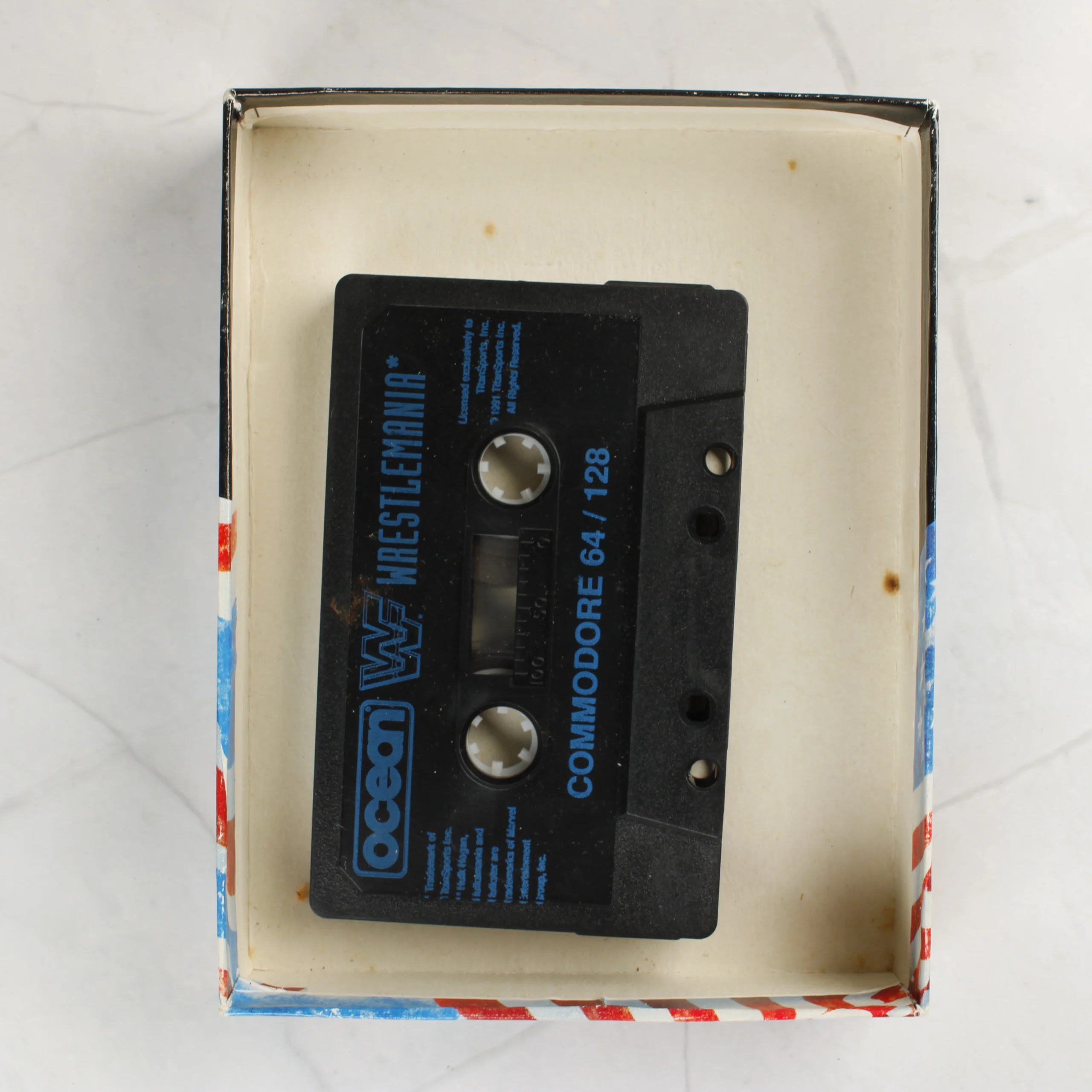 A WWF WrestleMania videójáték Commodore 64/128 platformra kiadott változata. A csomag tartalmazza az eredeti kartondobozt és egy fekete színű mágnesszalagos kazettát. A doboz elején Hulk Hogan és más pankrátorok láthatóak az amerikai zászló előtt, az Ocean Software logójával. A hátoldalon angol, francia és német nyelvű leírás, valamint három képernyőkép található a játékmenetről. A kazettán kék felirat jelzi a címet és a kompatibilis számítógéptípust. A belső papírtálca világos színű, rajta kisebb elszíneződések láthatóak.