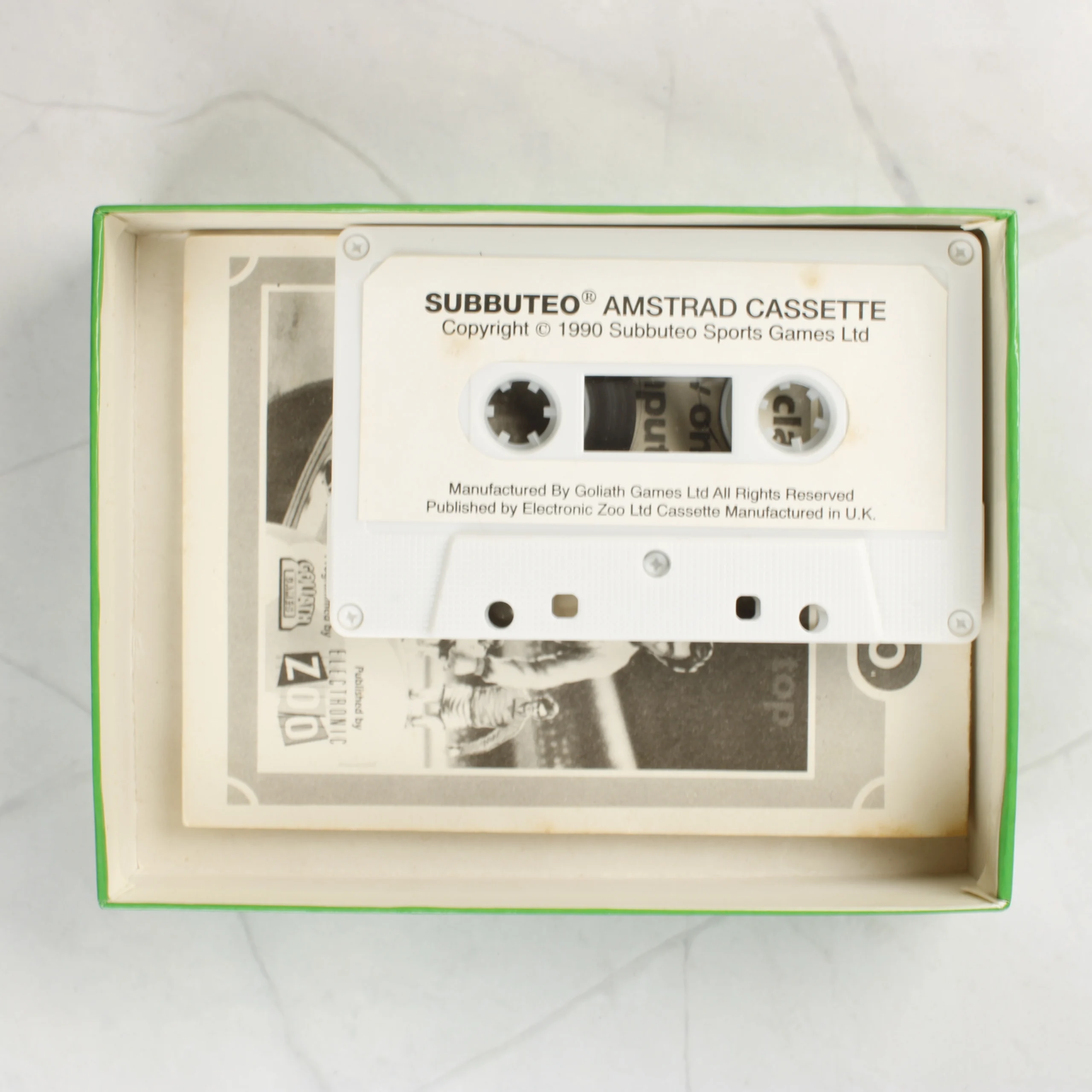 A Subbuteo: The Computer Game című videójáték Amstrad CPC platformra készült kiadása. A csomag egy zöld színű, kartonból készült dobozt, egy fehér színű mágnesszalagos kazettát és egy nyomtatott használati útmutatót tartalmaz. A doboz elején színes illusztráció látható, amely futballistákat ábrázol játék közben, a hátoldalon pedig képernyőmentések és angol nyelvű leírás olvasható a játékról. A kazetta címkéjén fekete felirat jelzi a címet és a gyártási adatokat. A termék az 1990-es évekből származó retró szoftver.