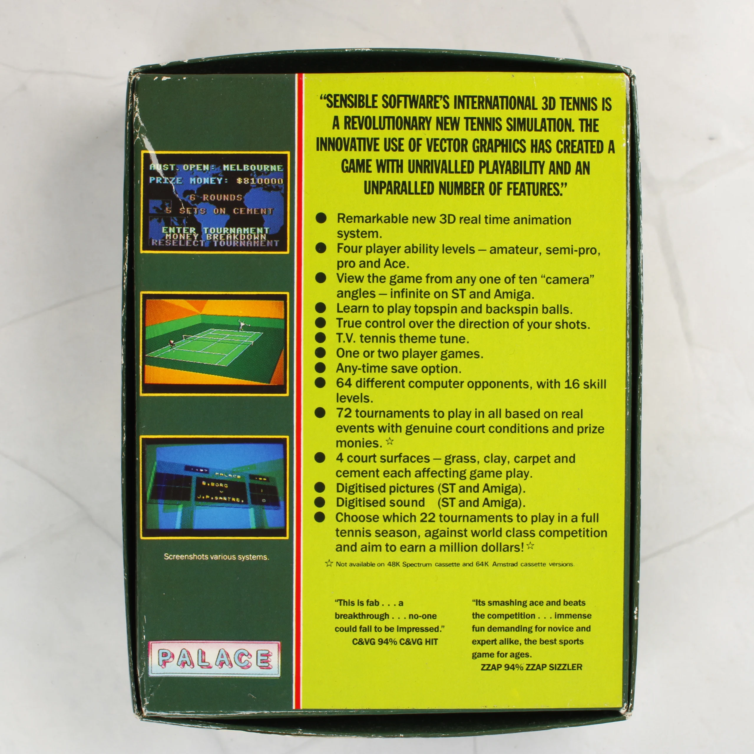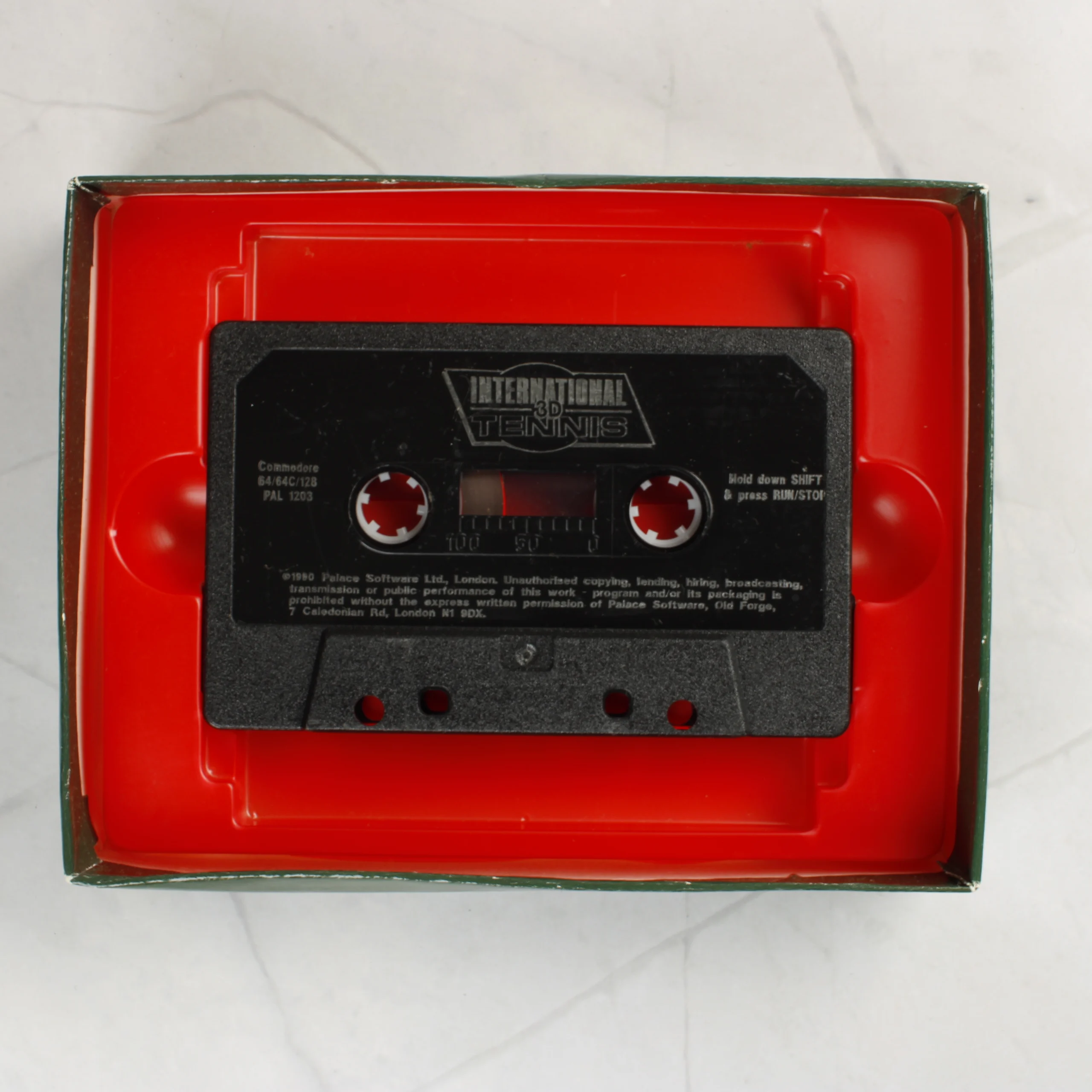 Az International 3D Tennis egy Commodore 64 platformra megjelent videójáték, amely eredeti kartondobozos csomagolásban található. A sötétzöld alapszínű doboz elején egy teniszező látható játék közben, felette a sárga és piros betűkkel írt cím olvasható. A csomagolás tartalmazza a fekete színű adathordozó kazettát, amely egy piros műanyag tálcában helyezkedik el. A doboz hátoldalán sárga alapon angol nyelvű leírás és képernyőmentések láthatóak a játékmenetről. A Sensible Software által fejlesztett és a Palace Software által kiadott szoftver láthatóan használt állapotú, a papírdoboz élein és sarkain kopások, valamint kisebb benyomódások és karcolások figyelhetőek meg. A kazetta felületén fehér feliratok és a játék logója látható.