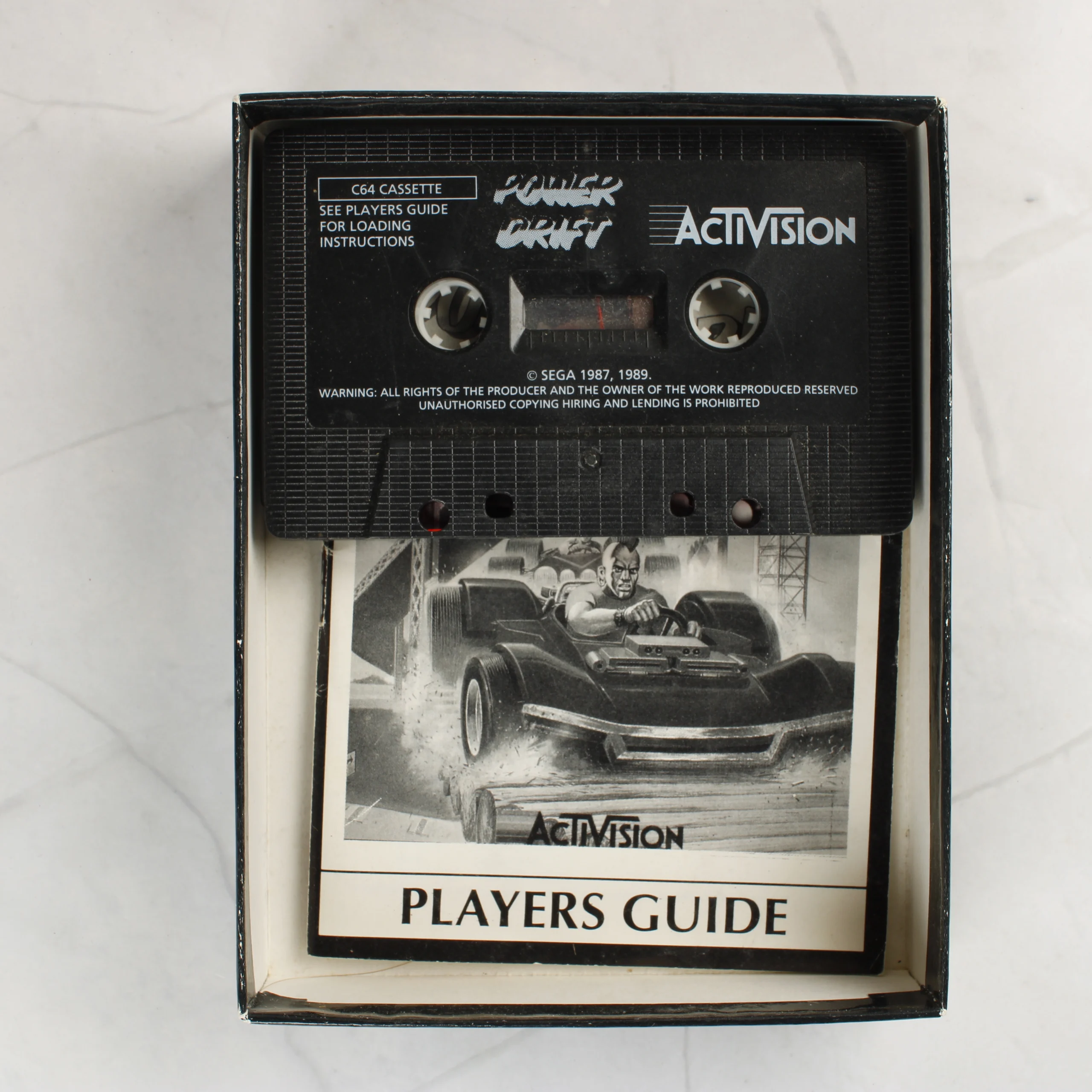 A Power Drift című videójáték Commodore 64 platformra készült kiadása. A csomag tartalmazza az eredeti kartondobozt, egy fekete színű mágnesszalagos kazettát és egy fekete-fehér nyomtatású használati útmutatót (Players Guide). A doboz elején színes illusztráció látható, amely egy kék versenyautót és annak vezetőjét ábrázolja verseny közben. A hátoldalon játékmenetből származó képernyőmentések és angol nyelvű leírás található. A kazetta fekete műanyag házas, fehér feliratozással, amelyen az Activision logója és a játék címe szerepel. A papírdoboz élei mentén látható némi kopás és fehéredés, de a grafika ép és jól kivehető. A belső tartalom hiánytalannak tűnik.