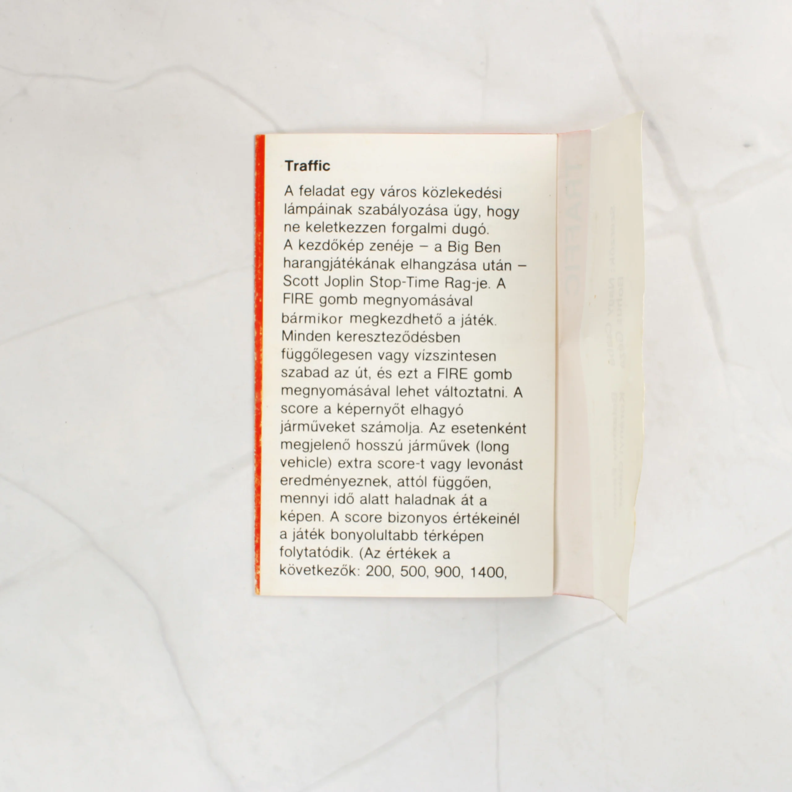 Ez a Traffic című videójáték Commodore 64 platformra, amelyet az Andromeda Software adott ki. A csomag egy fekete műanyag tokot tartalmaz, amelyben egy piros alapszínű, illusztrált papírborító található. A borítón a játék címe, egy képernyőkép és a kiadó logója látható. A készlet része egy fekete magnókazetta is, amelyen fehér papírcímke található kézzel írt vagy gépelt felirattal. A belső borítón magyar nyelvű használati útmutató olvasható, amely részletezi a játékmenetet és a pontozást. A hátoldalon a szerzők nevei szerepelnek: Nagy Csaba, Bohus Géza, Beleznay Ferenc és Korányi Gábor. A termék korának megfelelő állapotban van, a papír részeken enyhe sárgulás és használati nyomok láthatóak.