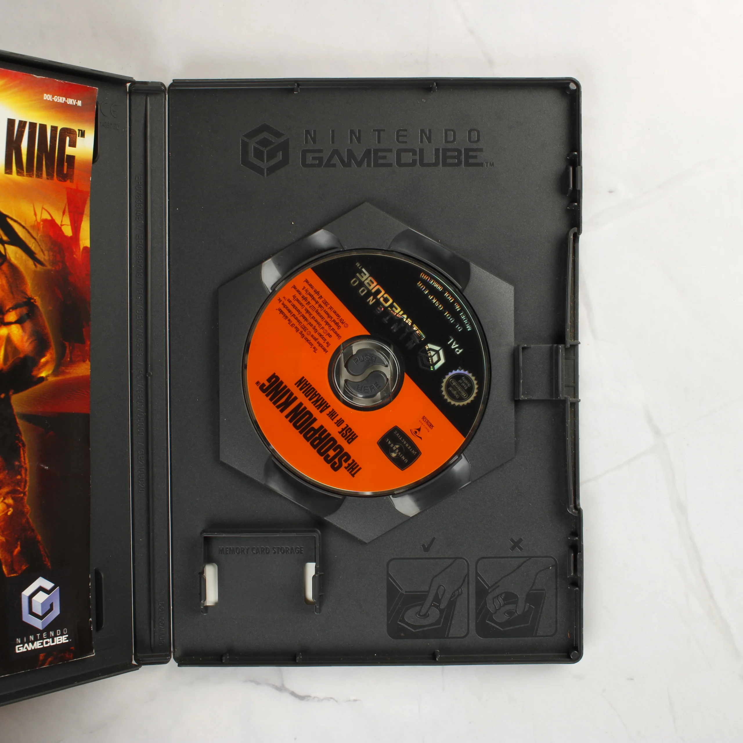 A The Scorpion King: Rise of the Akkadian című videójáték Nintendo GameCube konzolra. A termék egy fekete műanyag tokban található, amely tartalmazza az eredeti borítót, a használati útmutatót és a játéklemezt. A borítón a film főszereplője látható harci pózban, a háttérben egy hadsereggel. A tok elején egy holografikus matrica és az ELSPA 11+ korhatár-besorolása látható. A hátoldalon angol nyelvű leírás és játékmenet-fotók szerepelnek. A belső részben a fekete és narancssárga színű optikai lemez biztonságosan rögzítve van a tartóban. A kiadvány PAL régiókódú.
