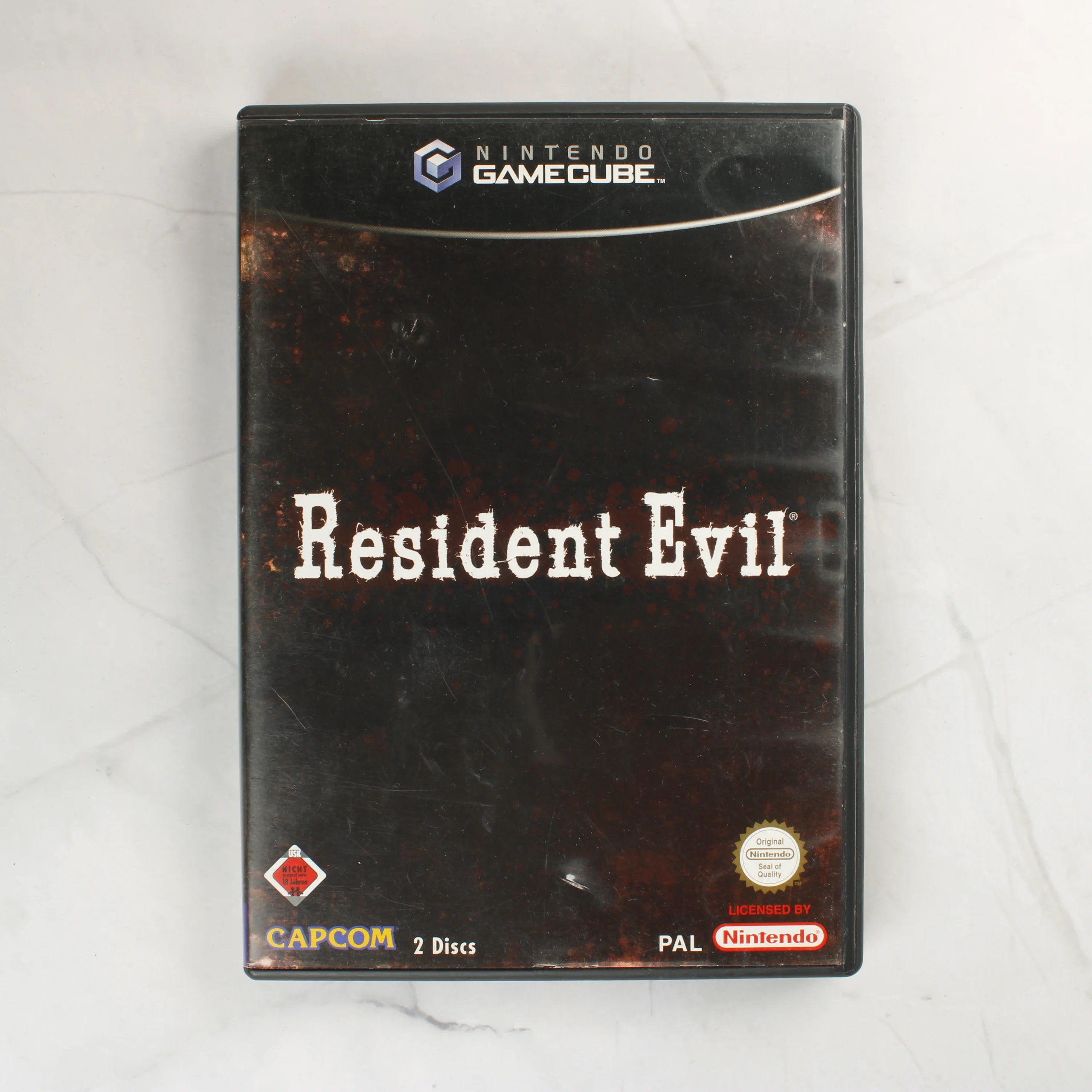 A Resident Evil videójáték Nintendo GameCube konzolra kiadott PAL verziója. A csomag egy fekete műanyag tokot tartalmaz, amelyben két optikai lemez található. Az első lemez a Resident Evil remake változata, míg a második lemez a Resident Evil 4 egy példánya. A tok borítóján a játék címe és a Capcom logója látható, a hátoldalon pedig német nyelvű leírás és játékmenet-fotók szerepelnek. A belső részben egy kézikönyv is helyet kapott. A tok és a lemezek használt állapotúak, a műanyag borításon és a papírbetéteken látható kopásnyomokkal.