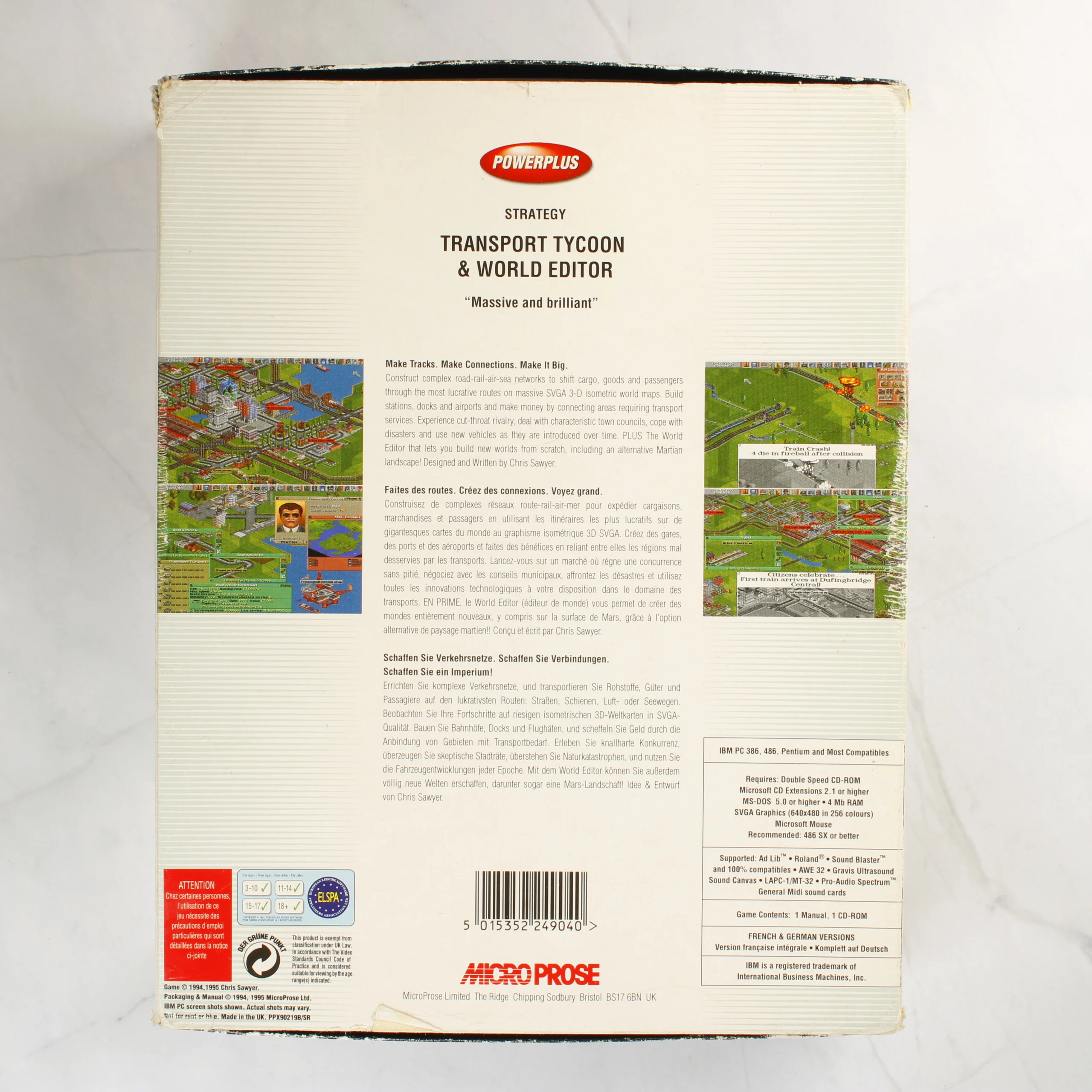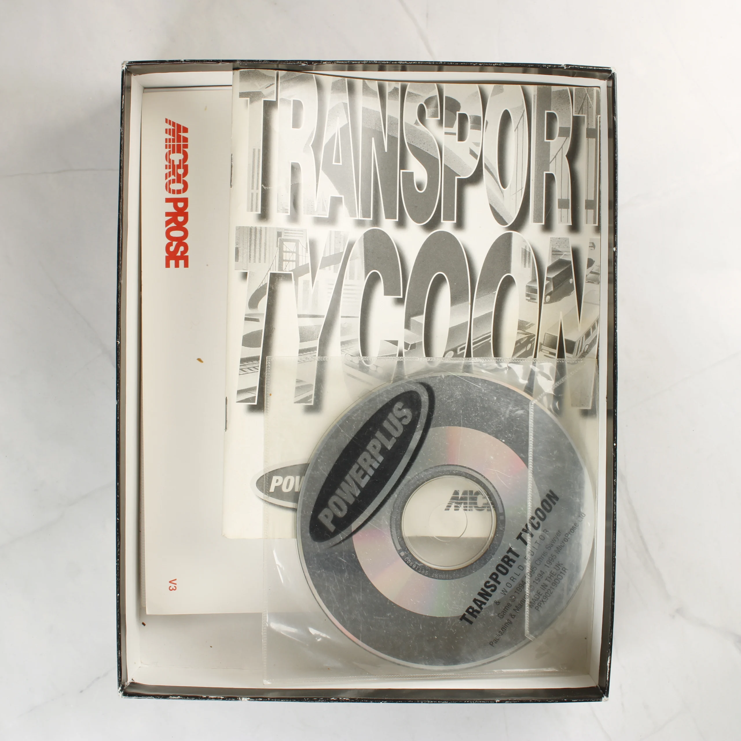 A Transport Tycoon & World Editor videójáték nagy dobozos kiadása PC platformra. A csomag tartalmazza az eredeti CD-ROM lemezt műanyag tasakban, valamint a hozzá tartozó nyomtatott kézikönyvet és dokumentációt. A doboz elején a Powerplus és a MicroProse logója látható, a jobb felső sarokban egy EB 9.99 árcímke található. A hátoldalon többnyelvű (angol, francia, német) leírás és játékmenet-képek szerepelnek, amelyek a közlekedési hálózatok építését mutatják be. A termék Chris Sawyer tervezése. A doboz fehér alapszínű, vízszintes csíkozással díszített.
