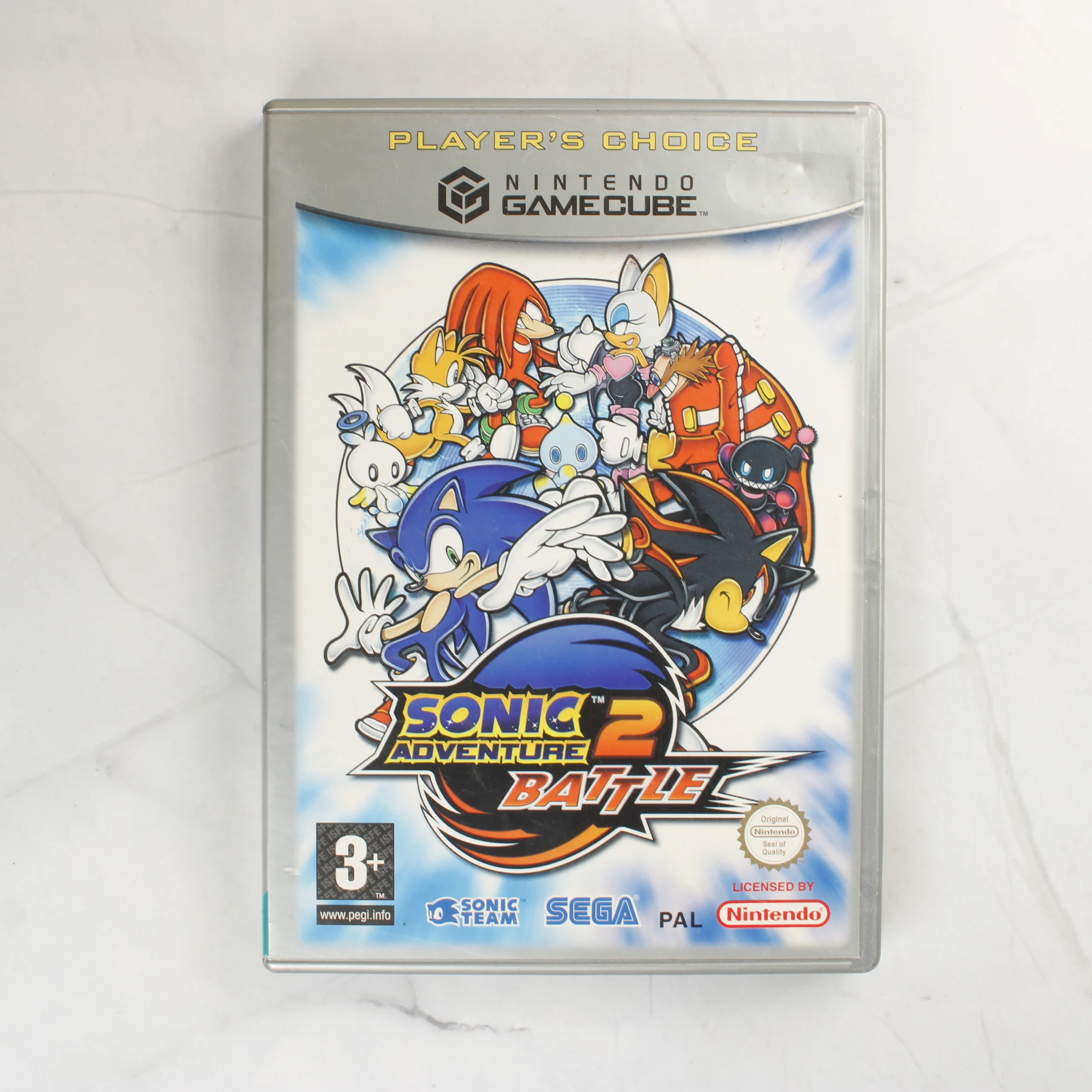 A Sonic Adventure 2 Battle videójáték Nintendo GameCube konzolra. A termék a Player's Choice sorozat része, ezüst színű műanyag tokban érkezik. A borítón a Sonic sorozat számos karaktere látható, köztük Sonic, Shadow, Knuckles és Tails. A tok tartalmazza az eredeti játéklemezt és a használati útmutatót is. A hátoldalon angol nyelvű leírás, játékmenet-képek és technikai adatok szerepelnek. A tokon látható a PEGI 3+ korhatár-besorolás és a PAL régiókód. A belső részben külön hely van kialakítva a memóriakártya számára.
