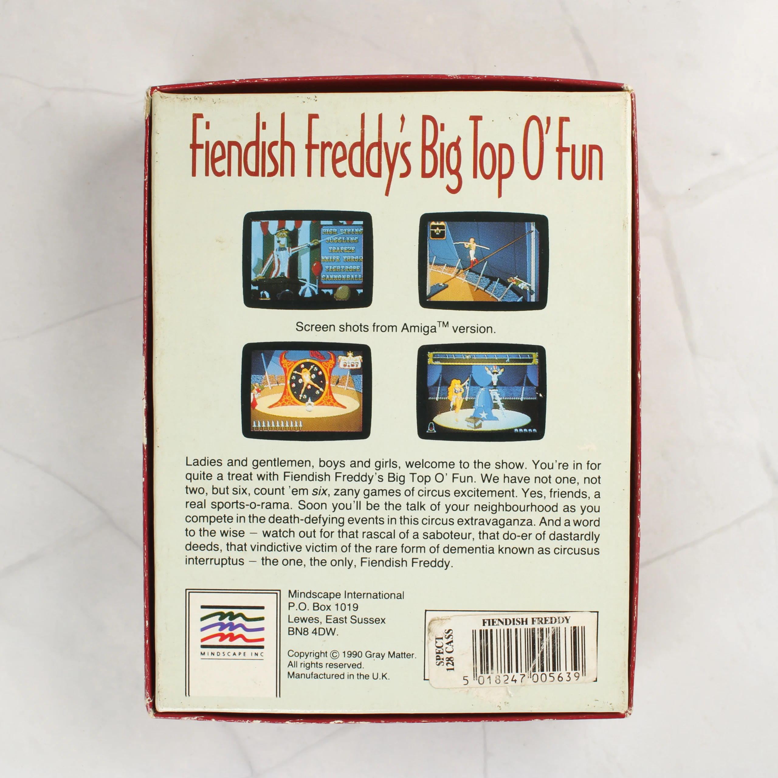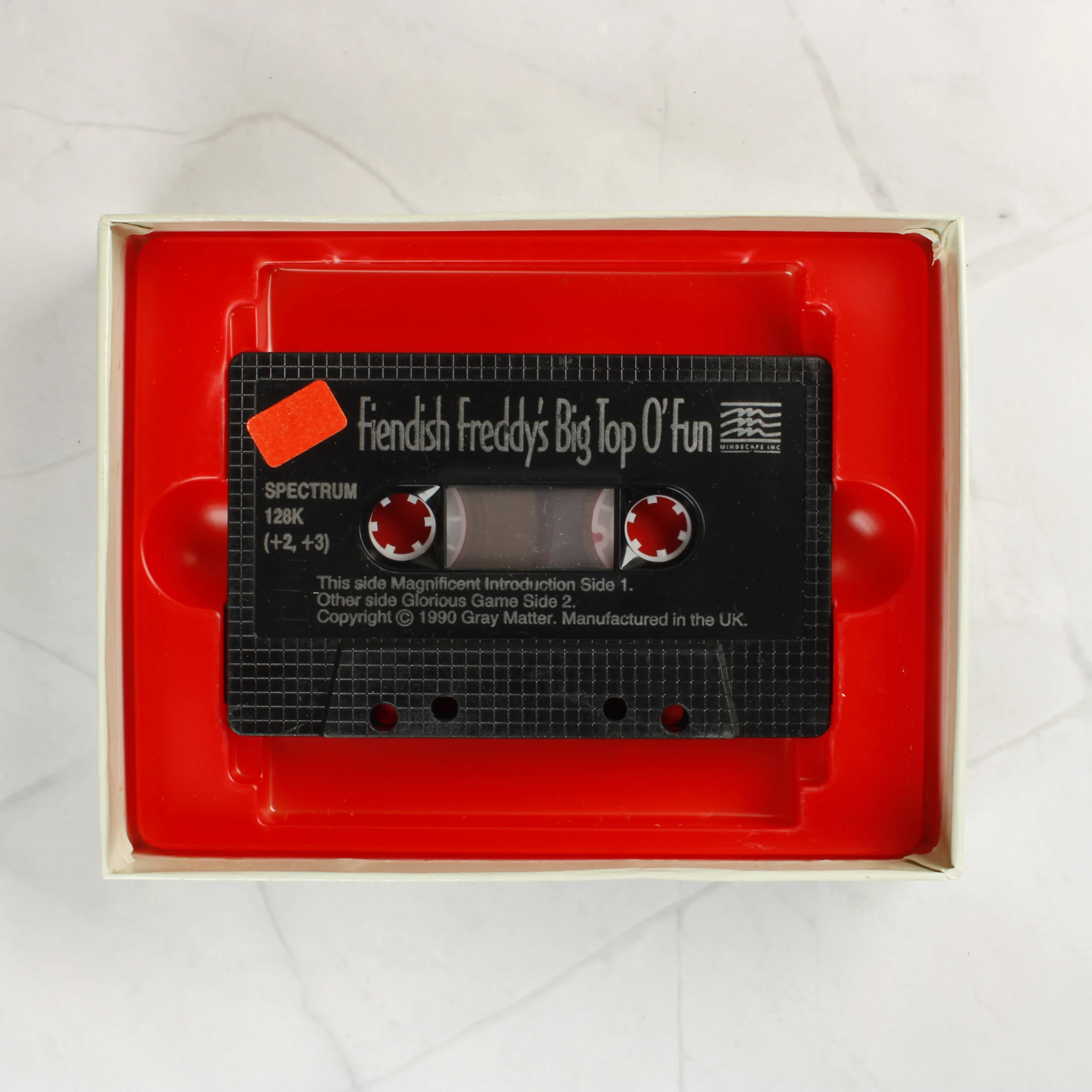 A Fiendish Freddy's Big Top O' Fun című videójáték ZX Spectrum 128K platformra kiadott változata. A csomag egy eredeti kartondobozt és egy fekete színű műanyag kazettát tartalmaz, amely egy piros belső tálcában helyezkedik el. A doboz elején egy színes, bohócot ábrázoló illusztráció látható, rajta a Gray Matter és a Mindscape logóival. A hátoldalon a játékmenetből vett képernyőfotók és angol nyelvű leírás olvasható. A kazettán fehér feliratok jelzik a címet, a kiadót és a szerzői jogi információkat. A termék az 1990-es évekből származó brit gyártmány.
