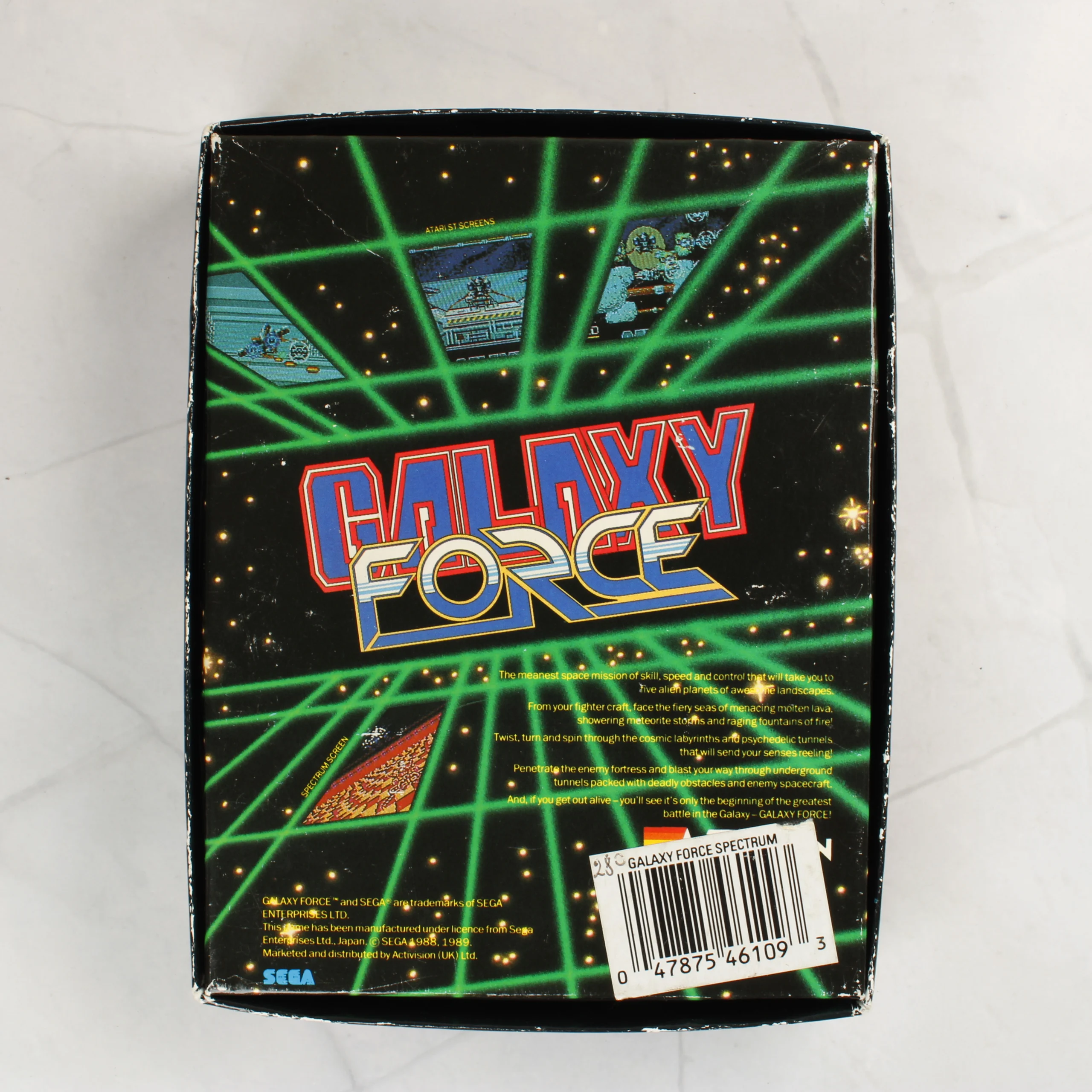 A Galaxy Force című videójáték ZX Spectrum számítógépre kiadott változata. A csomag tartalmazza az eredeti kartondobozt, egy fekete műanyag kazettát fehér címkével, valamint a hozzá tartozó használati útmutatót. A doboz elején egy futurisztikus űrhajó látható harc közben, a hátoldalon pedig játékmenetből származó képernyőmentések és angol nyelvű leírás olvasható. A kazetta és a kézikönyv egy átlátszó műanyag tálcában helyezkedik el a dobozon belül. A kiadvány az Activision gondozásában jelent meg a Sega licence alapján. A doboz élein és sarkain látható kopások a korából adódó használat jelei.