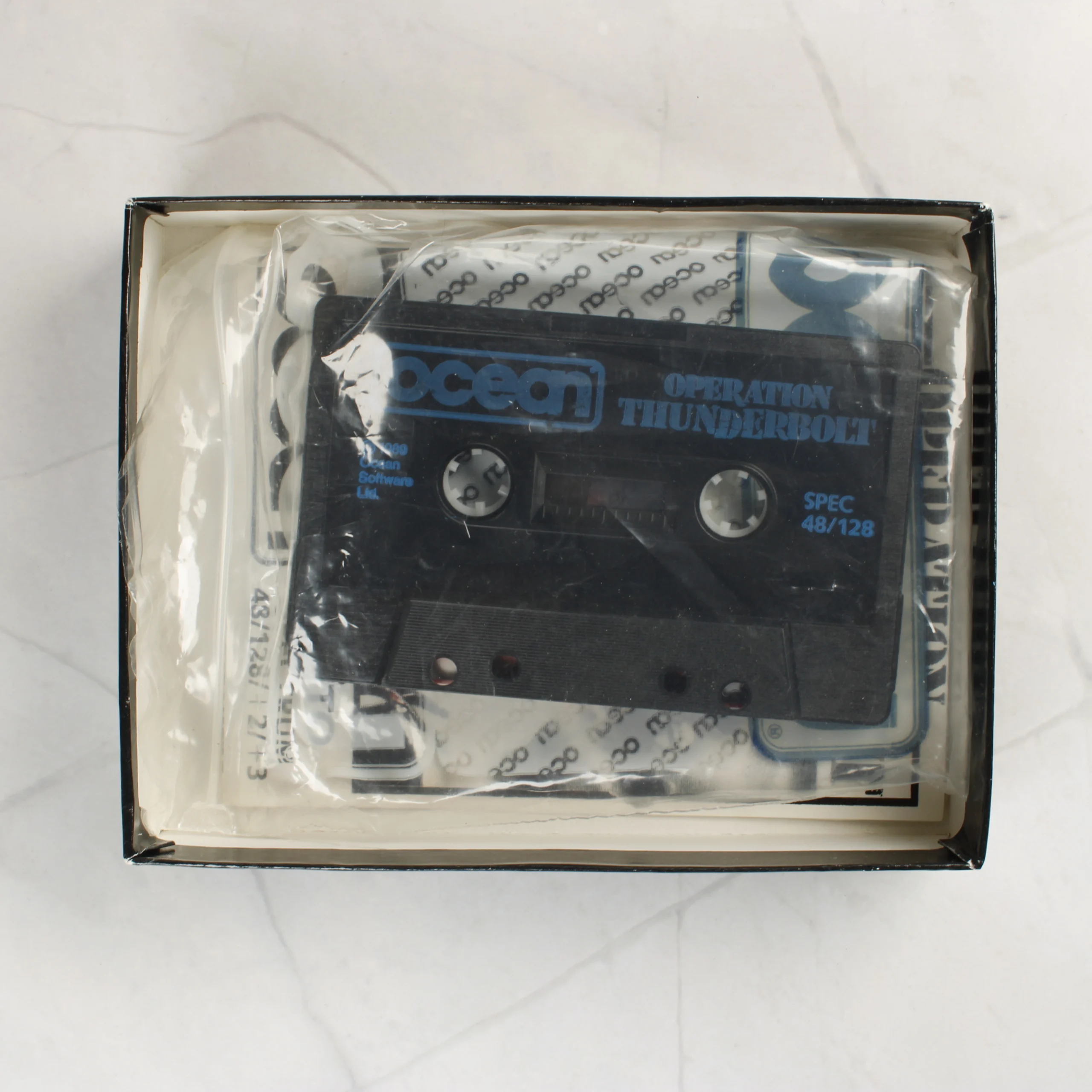 Az Operation Thunderbolt című videójáték eredeti, dobozos kiadása ZX Spectrum platformra. A csomag tartalmazza a fekete színű műanyag kazettát, amelyen kék felirat látható, valamint a papíralapú használati útmutatót, mindezt egy átlátszó védőfóliában. A külső kartondoboz színes grafikával illusztrált, amelyen katonai jelenetek és egy játéktermi automata látható. A doboz hátoldalán angol és francia nyelvű leírás, valamint képernyőmentések találhatók a játékból. A csomagolás élei mentén látható kopások és fehér foltok jelzik a használatot és az idő múlását. A kazetta fizikai állapota jónak tűnik, a szalag épnek látszik a betekintő ablakon keresztül.