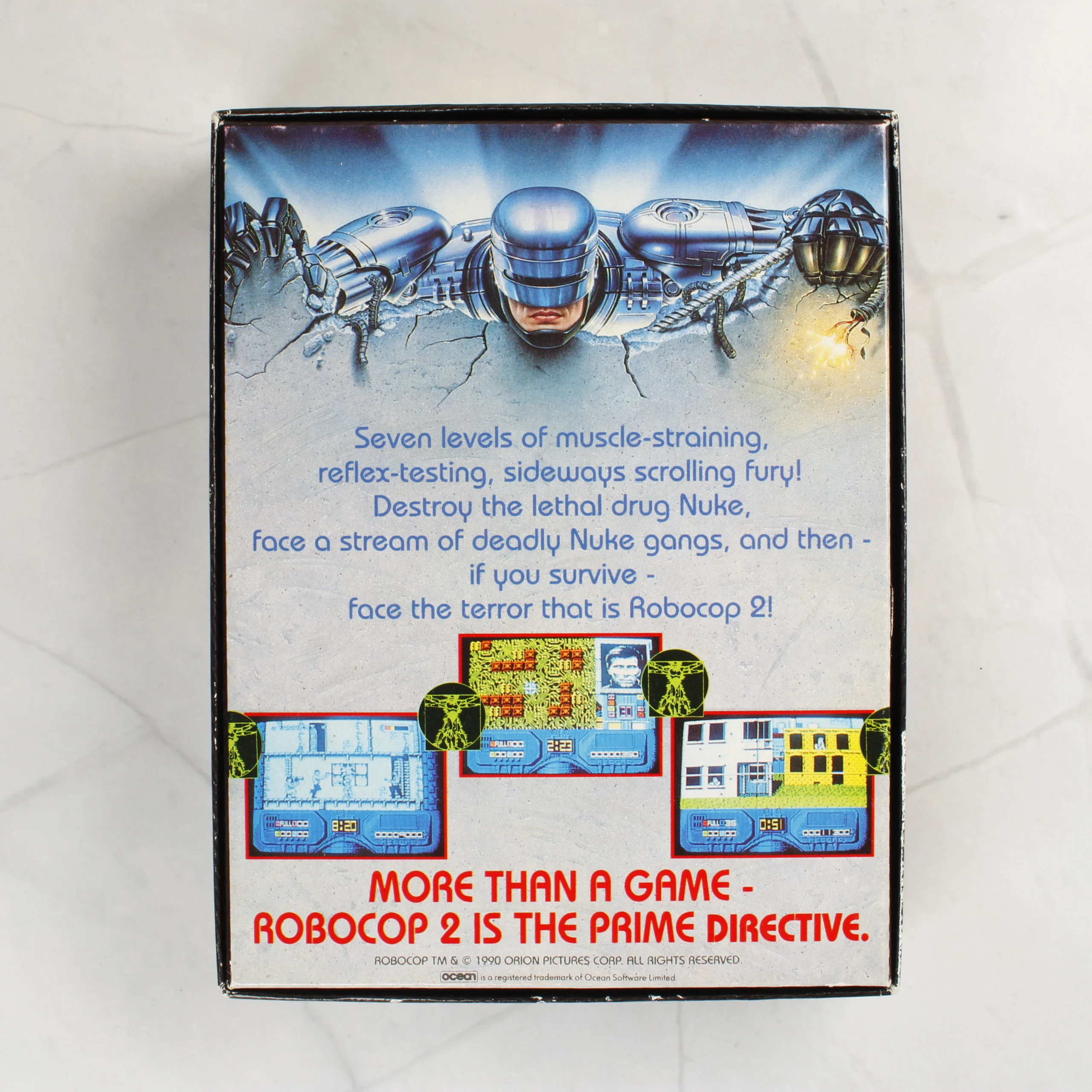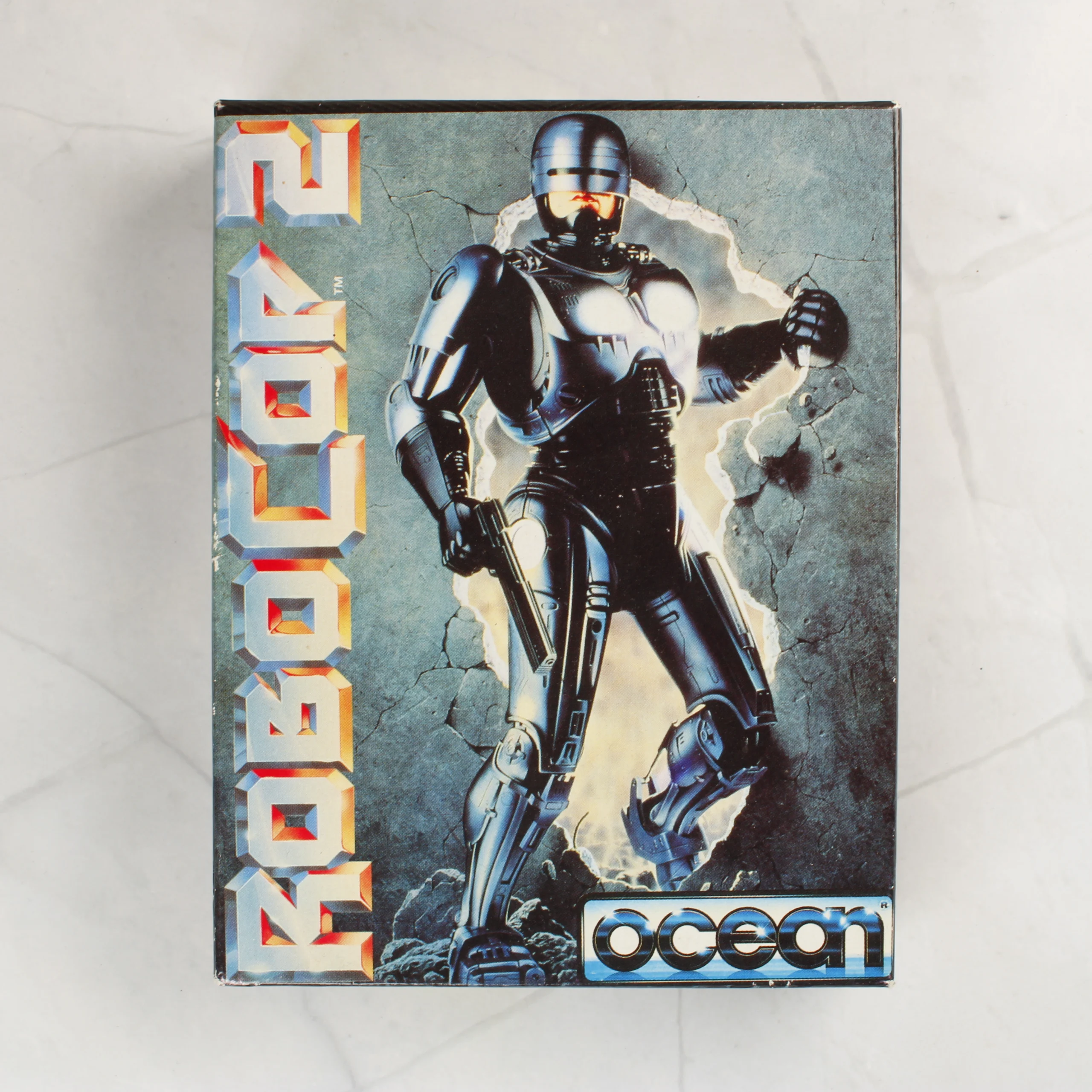 A RoboCop 2 videójáték ZX Spectrum platformra kiadott változata, eredeti kartondobozos csomagolásban. A készlet tartalmazza a fekete színű műanyag kazettát, amelyen kék feliratok és az Ocean logója látható. A doboz előlapján a film főhőse látható teljes páncélzatban, fegyverrel a kezében, egy repedezett fal előtt. A hátoldalon angol nyelvű leírás és három színes játékmenet-pillanatkép található. A csomagolás belsejében a kazetta mellett kiegészítő matricák vagy dokumentáció is látható egy átlátszó tasakban. A termék az 1990-es évekből származó klasszikus szoftverkiadás.
