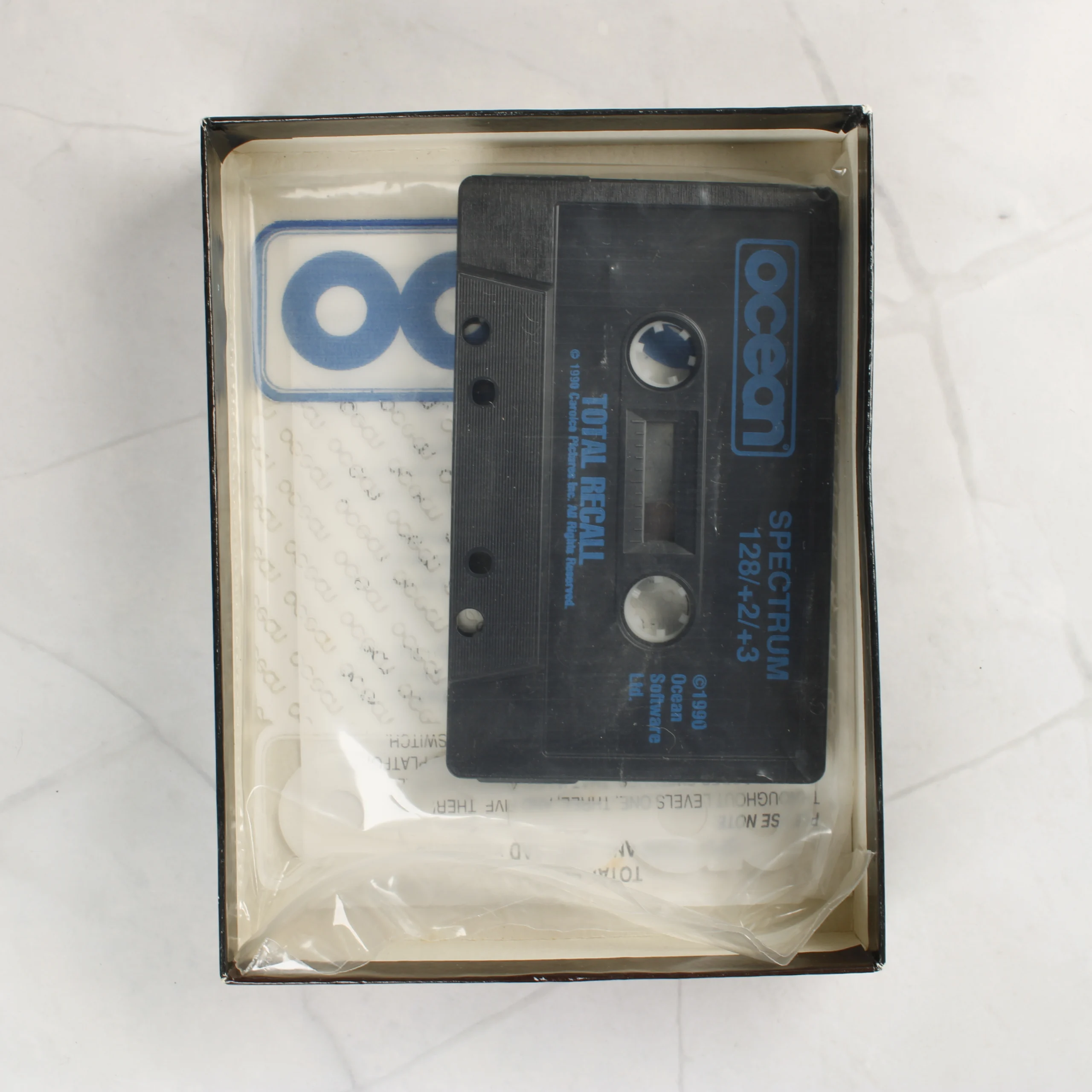 A Total Recall című videójáték ZX Spectrum platformra kiadott változata. A csomagolás egy nagyméretű kartondobozból áll, amelynek előlapján Arnold Schwarzenegger arca látható kék tónusban, alul pedig az Ocean Software logója szerepel. A doboz hátoldala piros alapszínű, többnyelvű (angol, francia, német) leírást, játékmenet-fotókat és egy 1990-es szerzői jogi jelzést tartalmaz. A doboz belsejében egy fekete műanyag kazetta található, amelyen kék felirat jelzi a kompatibilitást a Spectrum 128, +2 és +3 modellekkel. A kazetta mellett az eredeti dokumentáció és egy átlátszó műanyag tálca is látható. A papírdoboz élei mentén fehér kopásnyomok és kisebb benyomódások észlelhetők, különösen a sarkoknál.