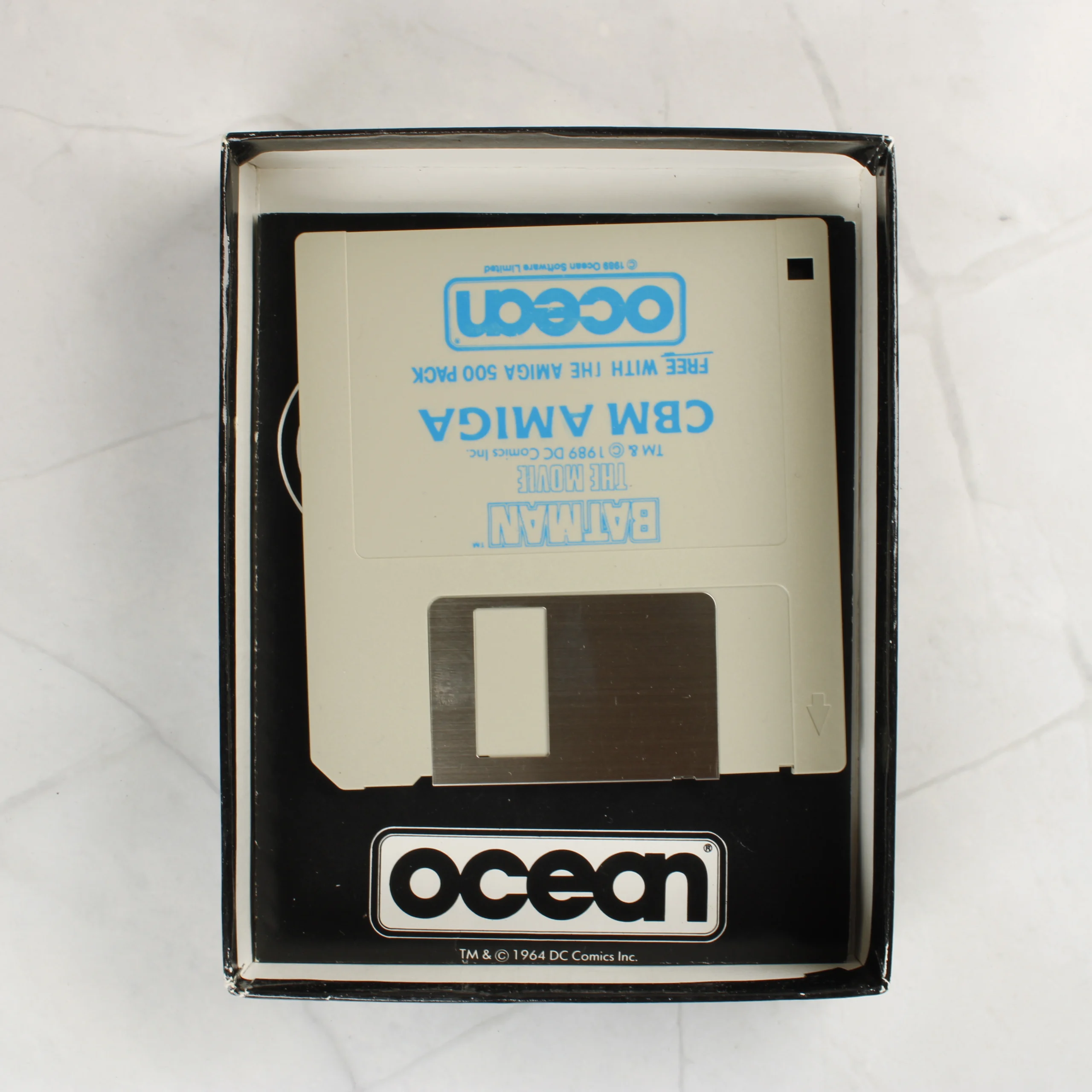 A Batman: The Movie című videójáték Amiga platformra készült kiadása. A csomag egy fekete kartondobozt tartalmaz, amelynek elején a klasszikus sárga-fekete Batman logó és az Ocean kiadó emblémája látható. A doboz belsejében egy 3,5 colos floppy lemez található, amelyen kék felirat jelzi a játék címét és a CBM Amiga kompatibilitást. A lemez címkéjén szerepel továbbá, hogy az Amiga 500 csomag részét képezte. A doboz élei mentén apróbb kopások és fehér foltok láthatóak, de a szerkezete ép. A floppy lemez fém védőlemeze karcmentesnek tűnik, a műanyag ház tiszta.