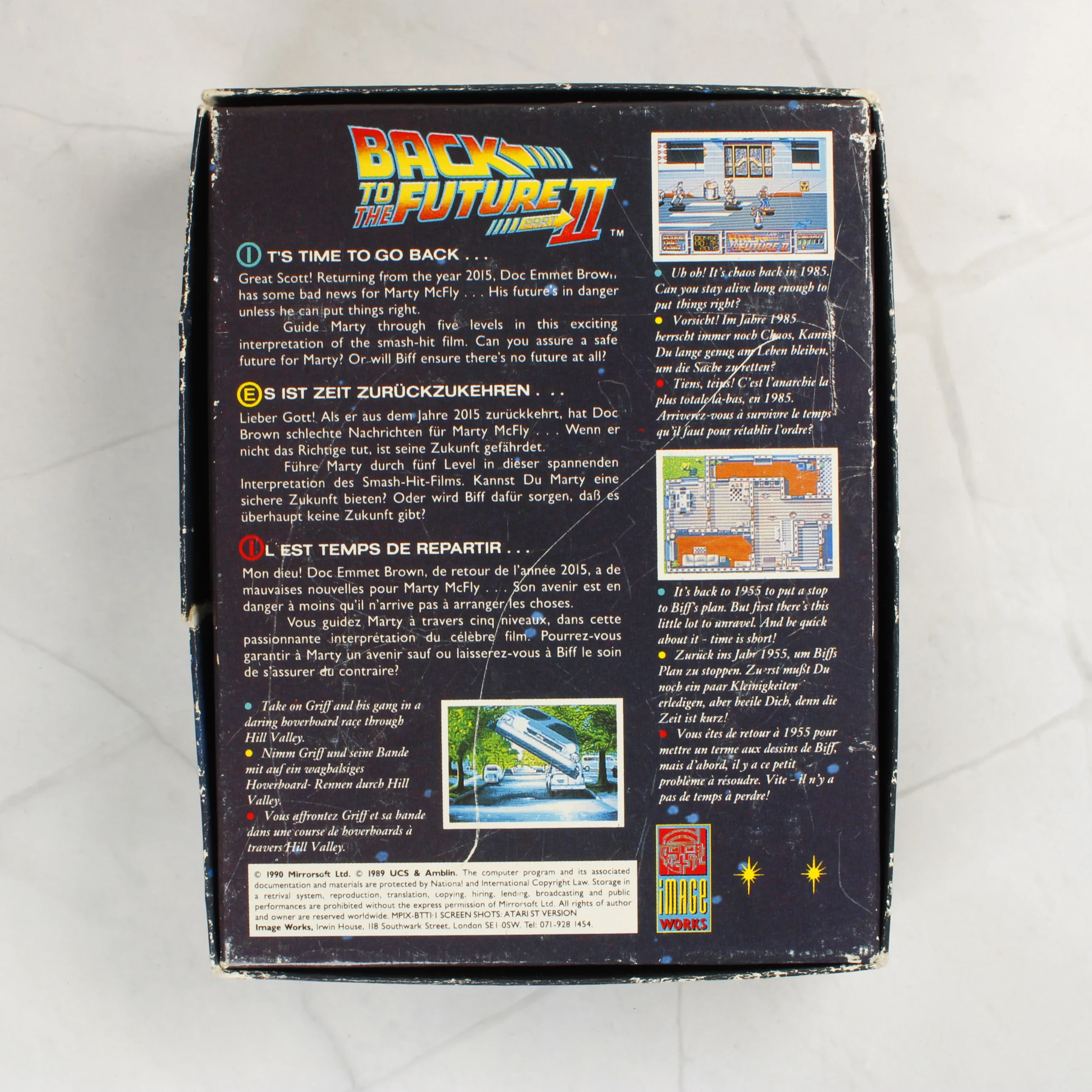 A Back to the Future Part II videójáték Amiga platformra készült kiadása eredeti kartondobozban. A csomag tartalmaz egy 3,5 colos kék színű floppy lemezt, amelyen a játék címe és az Image Works logója látható. A doboz elején a filmből ismert ikonikus DeLorean időgép és a film logója szerepel egy stilizált óraszerkezet előtt. A hátoldalon többnyelvű (angol, német, francia) leírás és színes képernyőmentések láthatóak a játékmenetből. A doboz belsejében papíralapú dokumentáció is található. A csomagolás élei mentén fehér kopásnyomok láthatóak, a sarkok enyhén megviseltek, de a grafika továbbra is élénk és jól kivehető.