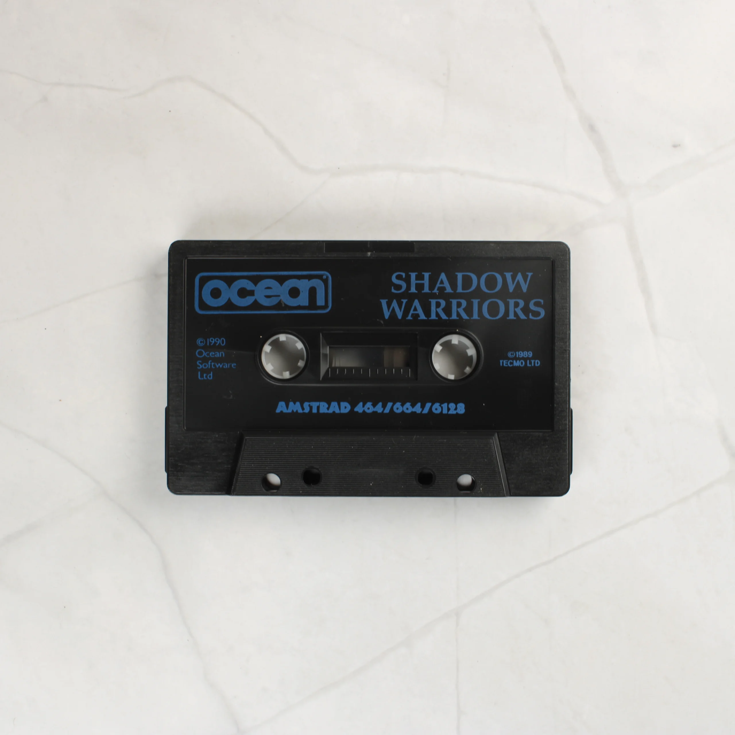 A Shadow Warriors című videójáték Amstrad CPC platformra készült kiadása. A csomag tartalmazza az eredeti kartondobozt és egy fekete színű mágnesszalagos kazettát. A doboz előlapján egy kék ruhás nindzsa látható városi háttér előtt, sárga és lila grafikai elemekkel kiegészítve. A doboz jobb felső sarkában egy régi árcédula maradványa látható. A hátoldalon többnyelvű (angol, francia, német) leírás és három színes játékmenet-fotó szerepel. A kazetta fekete műanyag házas, kék felirattal, amelyen az Ocean logó és az Amstrad 464/664/6128 kompatibilitás olvasható. A doboz élei mentén kopások és kisebb benyomódások tapasztalhatók, a sarkok enyhén rojtosak.
