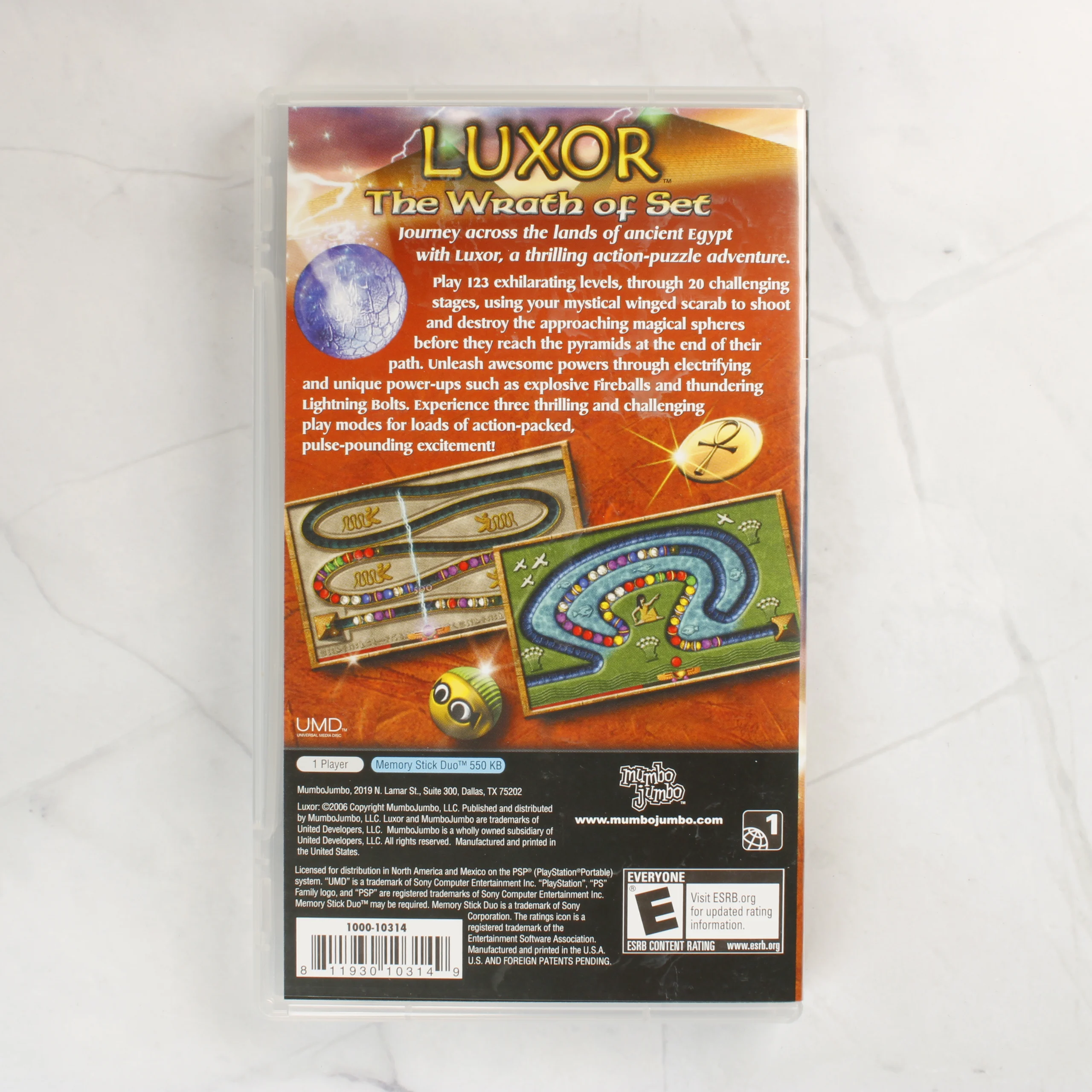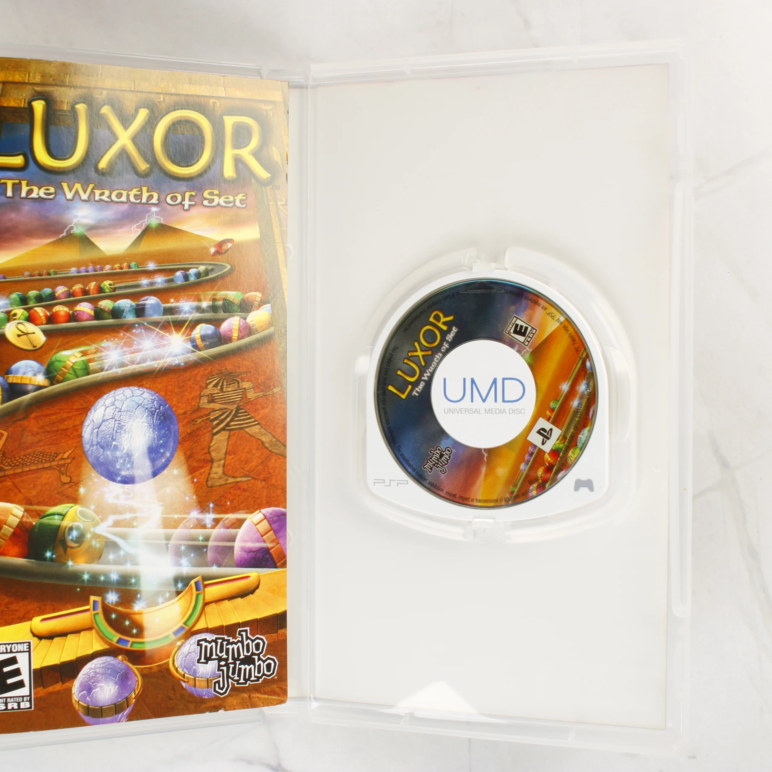 A Luxor: The Wrath of Set című videójáték PlayStation Portable (PSP) konzolra. A csomag tartalmazza az eredeti műanyag tokot, a színes borítót és a Universal Media Disc (UMD) adathordozót. A borítón egyiptomi motívumok és színes golyók láthatók egy sínpályán. A tok átlátszó műanyagból készült, a belső részén a lemez biztonságosan rögzítve van. A hátoldalon angol nyelvű leírás és játékmenet-képek olvashatók. Az ESRB besorolása szerint a játék mindenki számára ajánlott (Everyone). A termék használt, de megkímélt állapotban van, a lemez és a tok felülete tiszta.