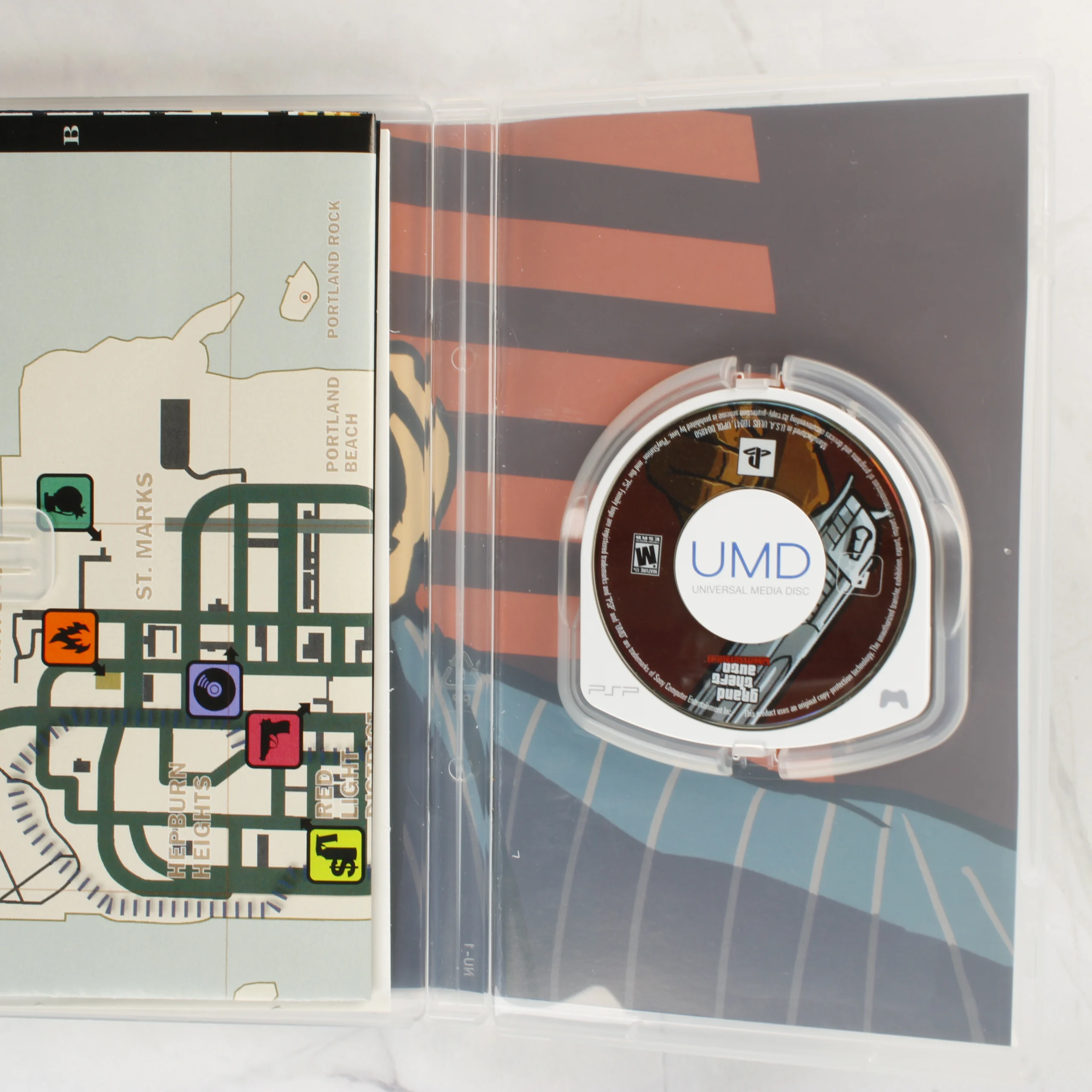 A Grand Theft Auto: Liberty City Stories videójáték PlayStation Portable (PSP) konzolra. A csomag tartalmazza az eredeti műanyag tokot a színes borítóval, a játékot tartalmazó UMD lemezt, valamint egy összehajtható térképet és kézikönyvet. A borítón a sorozatra jellemző montázs látható helikopterrel, autóval és karakterekkel. A hátoldalon angol nyelvű leírás és játékmenet-fotók szerepelnek. Az ESRB besorolása szerint Mature (17+) kategóriájú. A tok átlátszó műanyagból készült, a belső részben a térkép és a lemez biztonságosan rögzítve van.