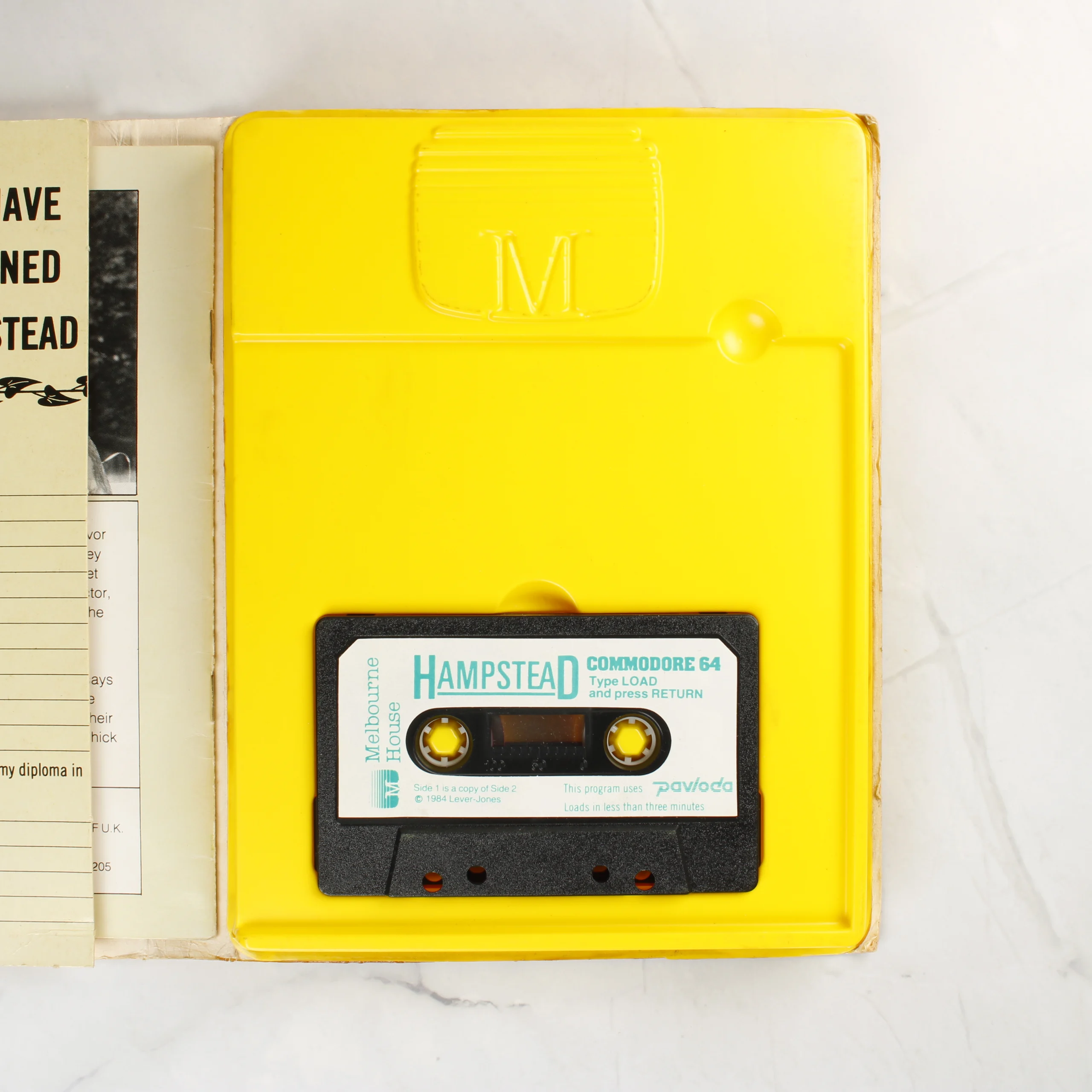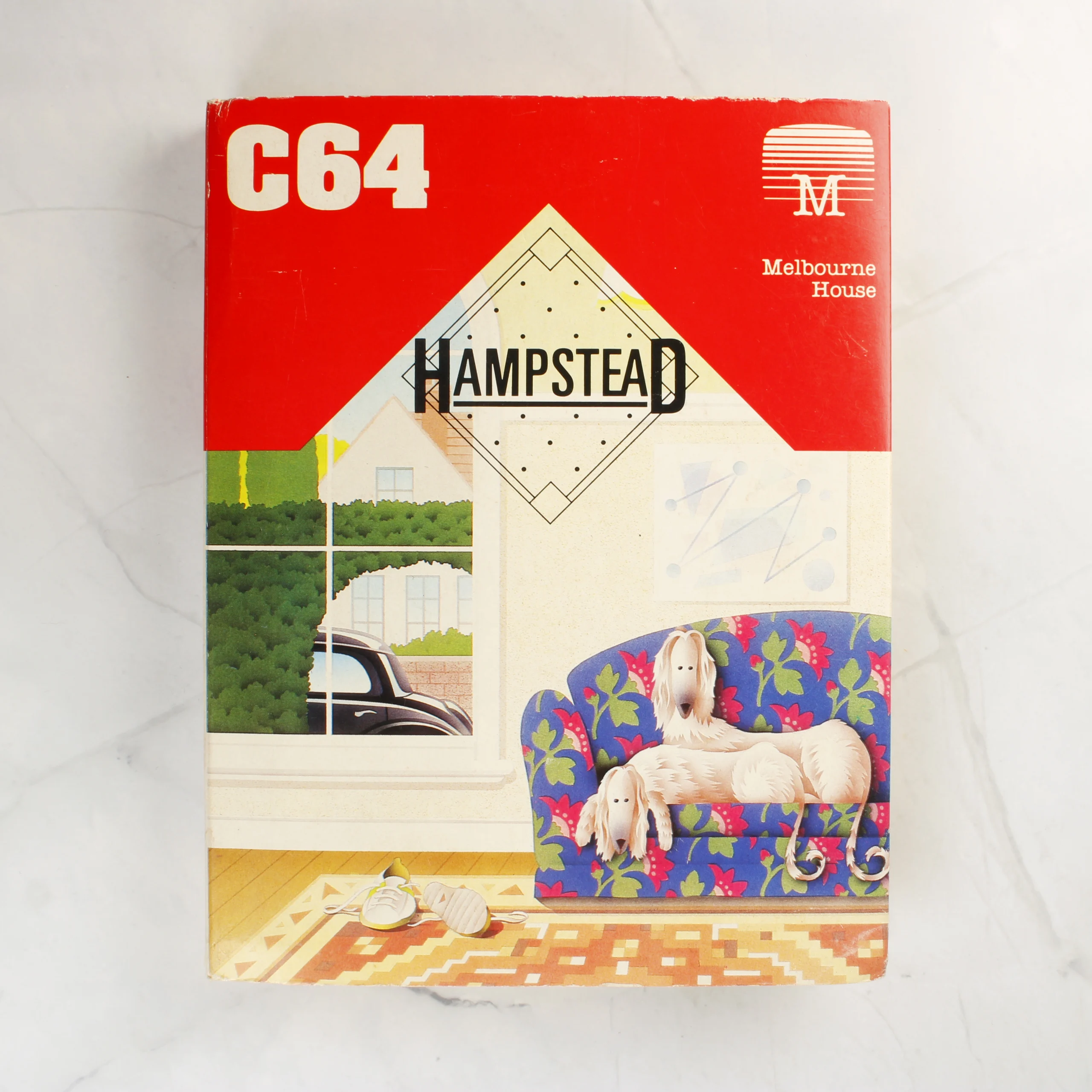 A Melbourne House által kiadott Hampstead című videójáték Commodore 64 platformra. A csomagolás egy nagyméretű, kartonból készült doboz, amelynek grafikája a klasszikus Marlboro cigarettásdobozok dizájnját idézi piros és fehér színeivel. Az előlapon egy nappali belső tere látható kutyákkal és egy ablakon keresztül látszó autóval. A doboz belsejében egy sárga műanyag tálca tartja a fekete színű magnókazettát, amelyen fehér címke található türkizkék feliratokkal. A hátoldalon angol nyelvű leírás, egy fekete-fehér fotó a készítőkről, valamint a technikai adatok és az ISBN azonosító olvasható.