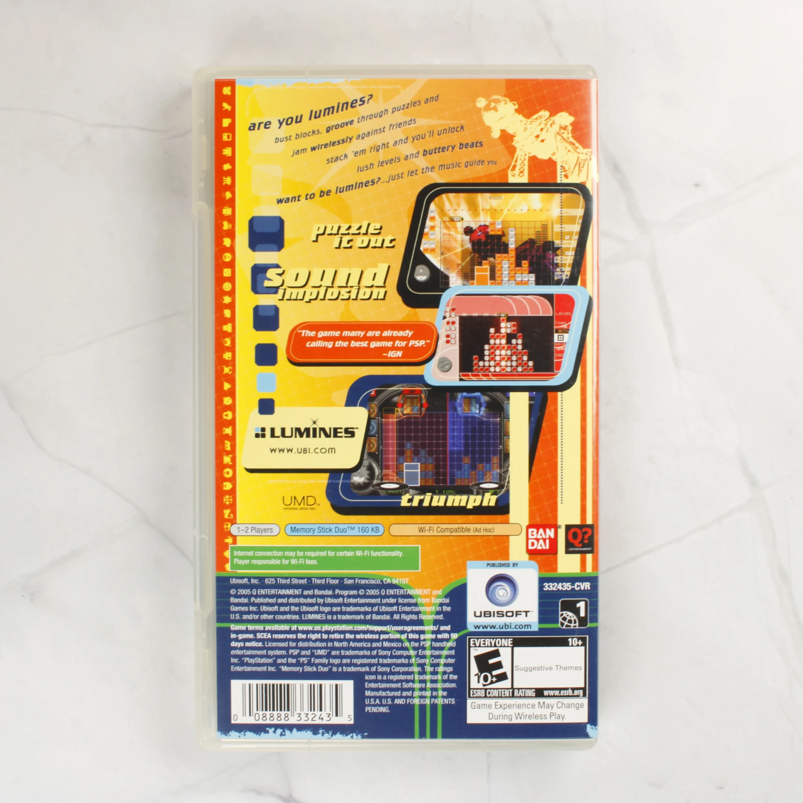 A Lumines: Puzzle Fusion videójáték PlayStation Portable (PSP) konzolra. A csomag tartalmazza az eredeti műanyag tokot, a színes borítót és az UMD lemezt. A borítón narancssárga, sárga és kék színek dominálnak, absztrakt mintákkal és a játék logójával. A hátoldalon angol nyelvű leírás, játékmenet-képek és technikai adatok láthatóak, többek között az Ubisoft és a Q Entertainment logói. Az UMD lemez fehér és kék színű, rajta a játék címével és a PSP logóval. A tok átlátszó műanyagból készült, belső részén a lemeztartó füllel.