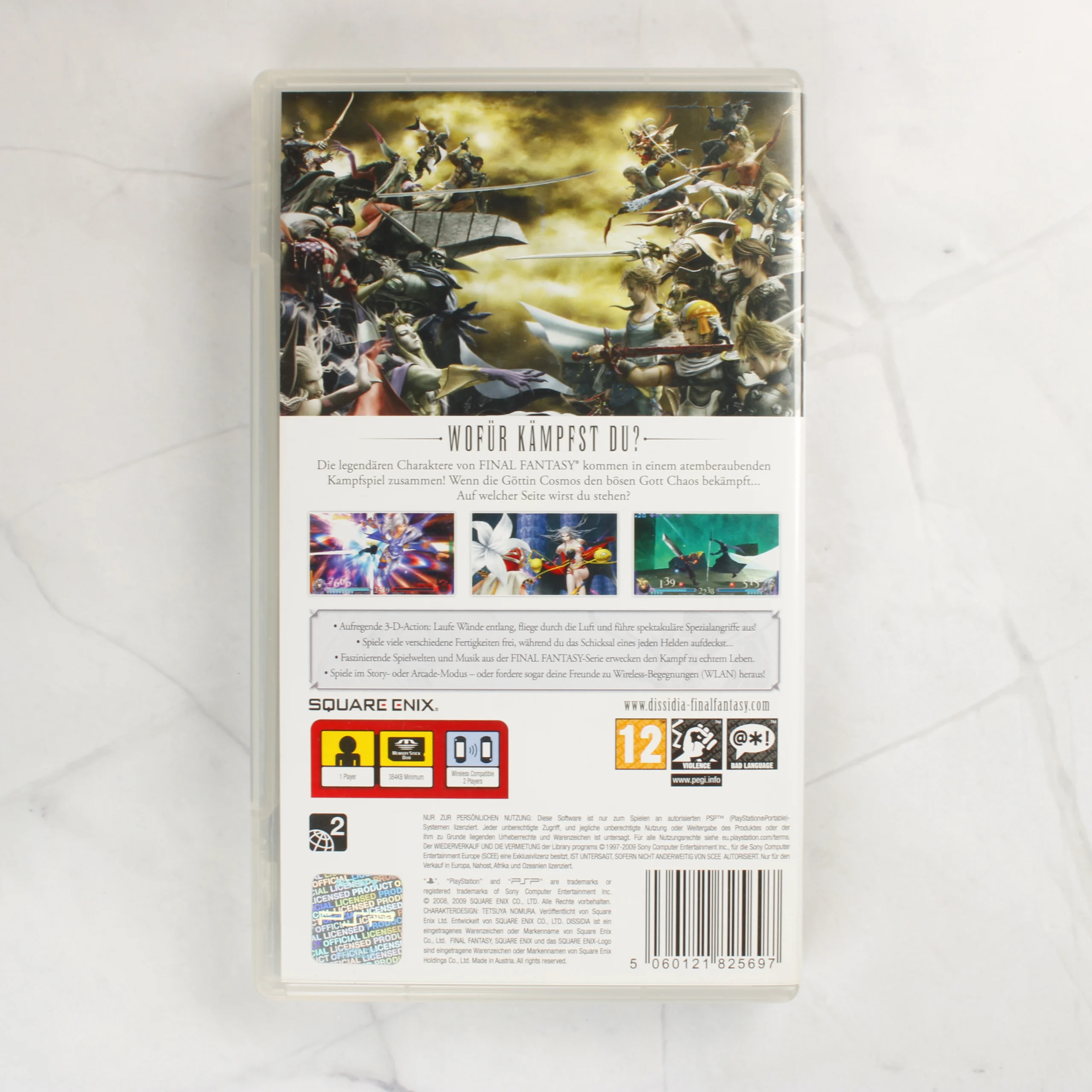 A Dissidia Final Fantasy videójáték PlayStation Portable (PSP) konzolra. A csomag tartalmazza az eredeti műanyag tokot, a színes borítót, a használati útmutatót és az UMD lemezt. A borítón számos Final Fantasy karakter látható illusztrált stílusban, fehér háttér előtt. A tok hátoldalán német nyelvű leírás, játékmenet-képek és technikai adatok szerepelnek. A PEGI 12-es korhatár-besorolás jól látható a borító bal alsó sarkában. A belső részben az UMD lemez biztonságosan rögzítve van a tartóban, mellette pedig a többoldalas kiskönyv található. A Square Enix logója több helyen is feltűnik a csomagoláson.