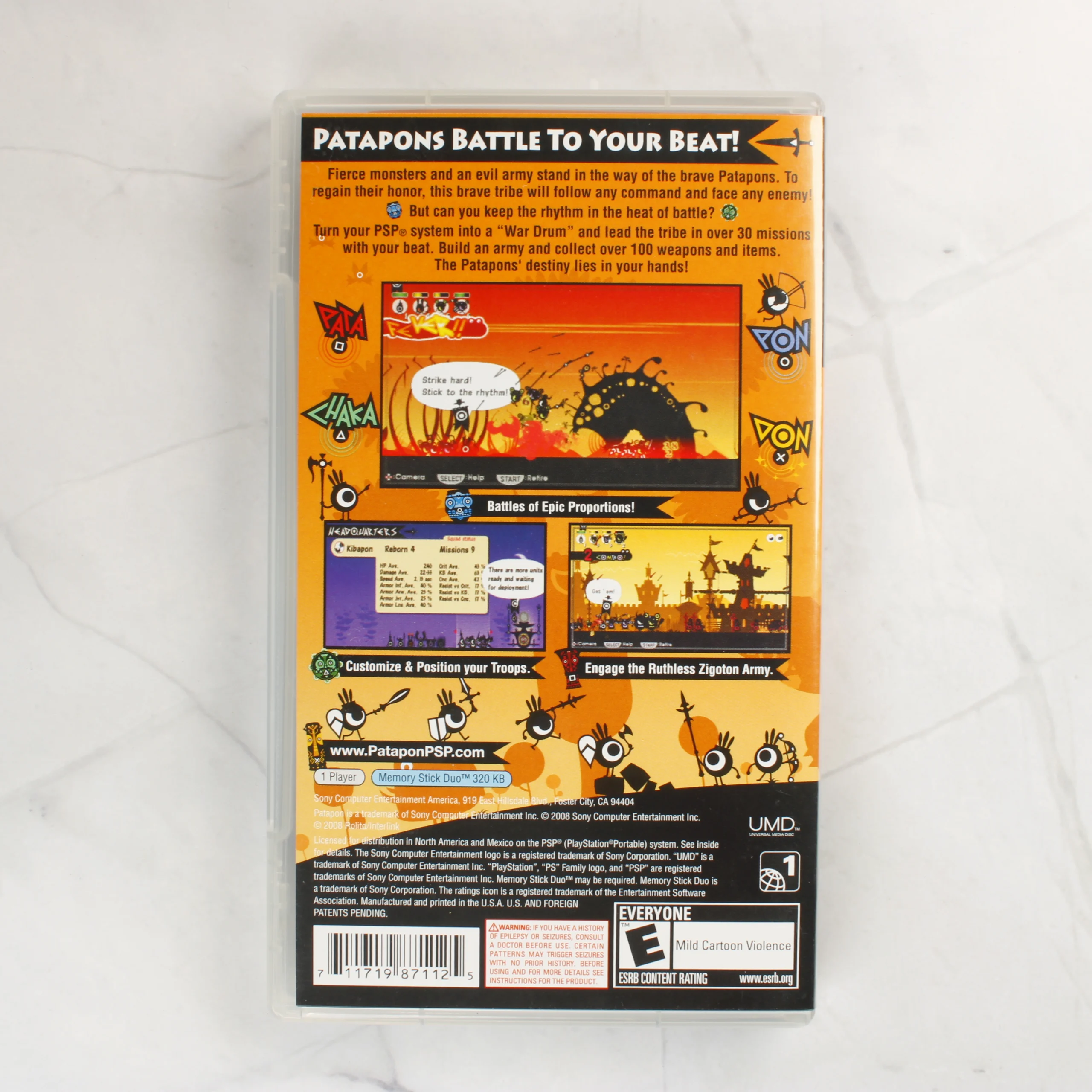 A Patapon egy ritmusalapú akció-stratégiai videójáték PlayStation Portable (PSP) konzolra. A csomag tartalmazza az eredeti átlátszó műanyag tokot, a színes borítót, a használati útmutatót és a játékot tartalmazó UMD lemezt. A borító grafikája dominánsan narancssárga és fekete színű, amelyen a játék jellegzetes, egyszemű harcosai láthatóak. A tok hátoldalán angol nyelvű leírás és játékmenet-pillanatképek szerepelnek. Az ESRB besorolása szerint a játék mindenki számára ajánlott (Everyone). A belső részben a fehér keretes UMD lemez biztonságosan rögzítve van a tartóban. A termék megkímélt állapotban van, a műanyag tokon csak minimális felületi karcok láthatóak, a nyomtatott anyagok épek és tiszták.