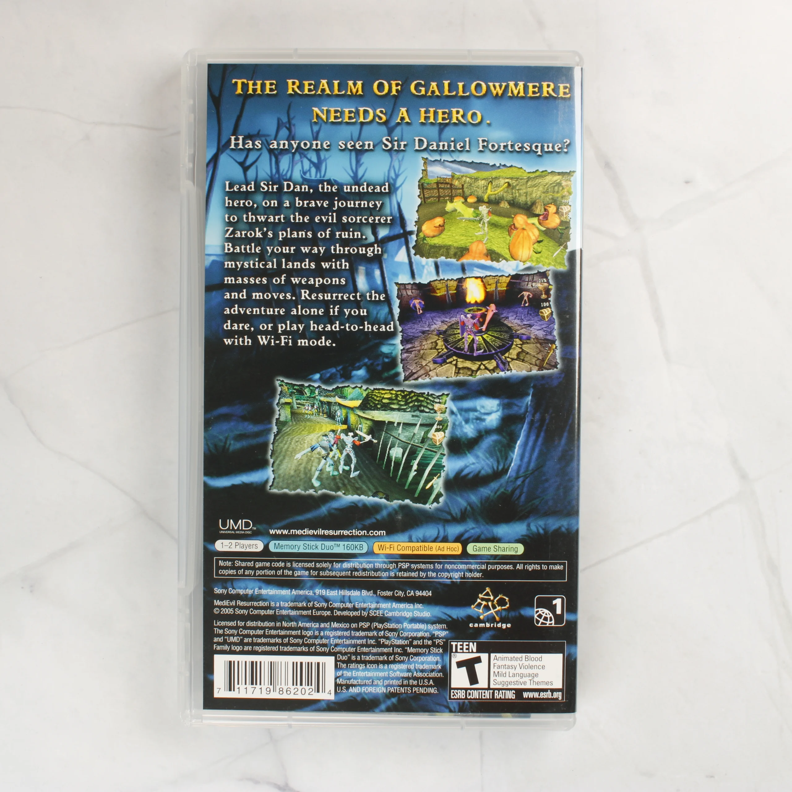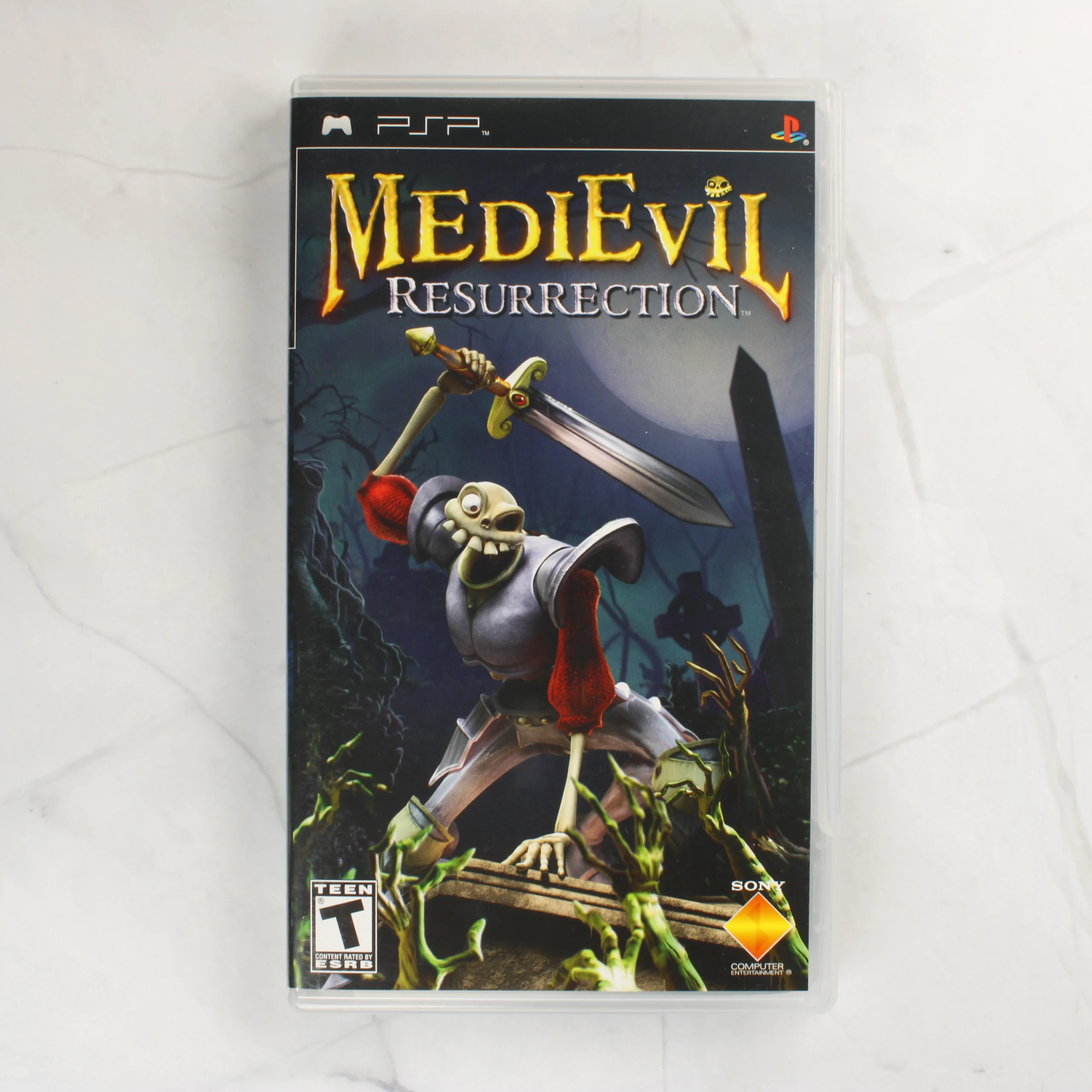 A MediEvil Resurrection című videójáték PlayStation Portable (PSP) konzolra. A csomag tartalmazza az eredeti átlátszó műanyag tokot, a színes borítót, a belső illusztrációt és magát az UMD lemezt. A borítón Sir Daniel Fortesque látható karddal a kezében, sötét, temetői környezetben. A tok hátoldalán angol nyelvű leírás és játékmenet-fotók találhatók. Az UMD lemez fehér és kék mintázatú, rajta a játék logójával. A kiadvány az észak-amerikai (NTSC-U/C) régióhoz tartozik, ESRB Teen korhatár-besorolással rendelkezik.