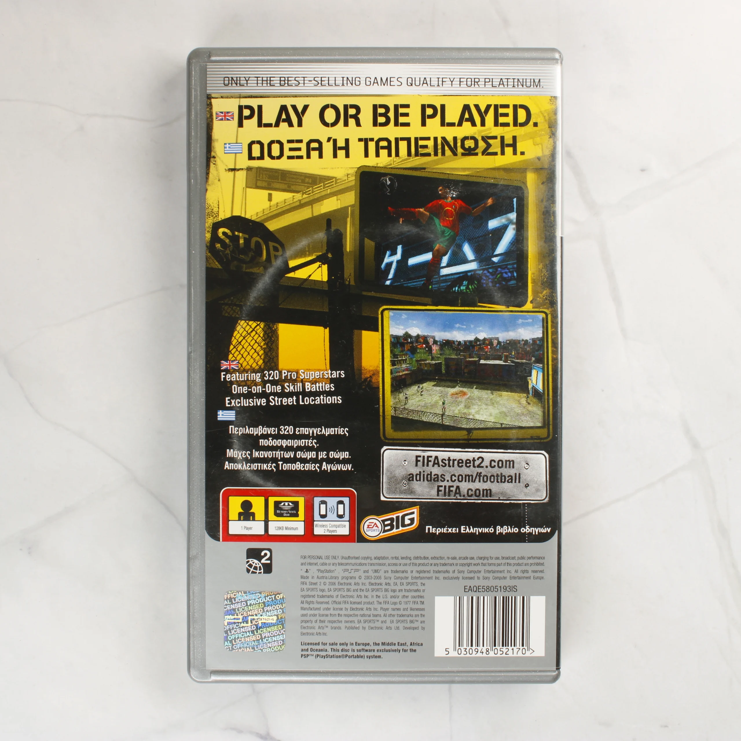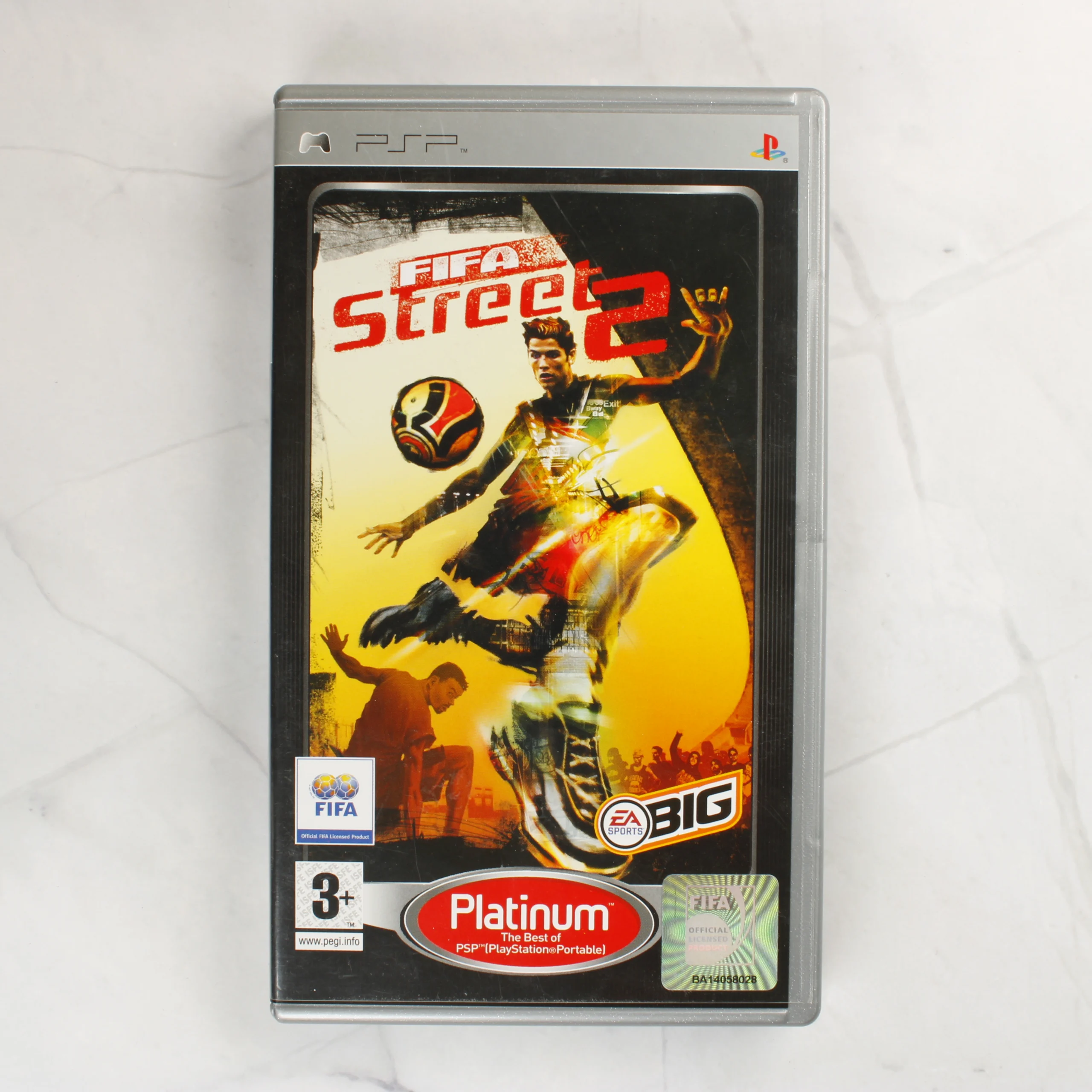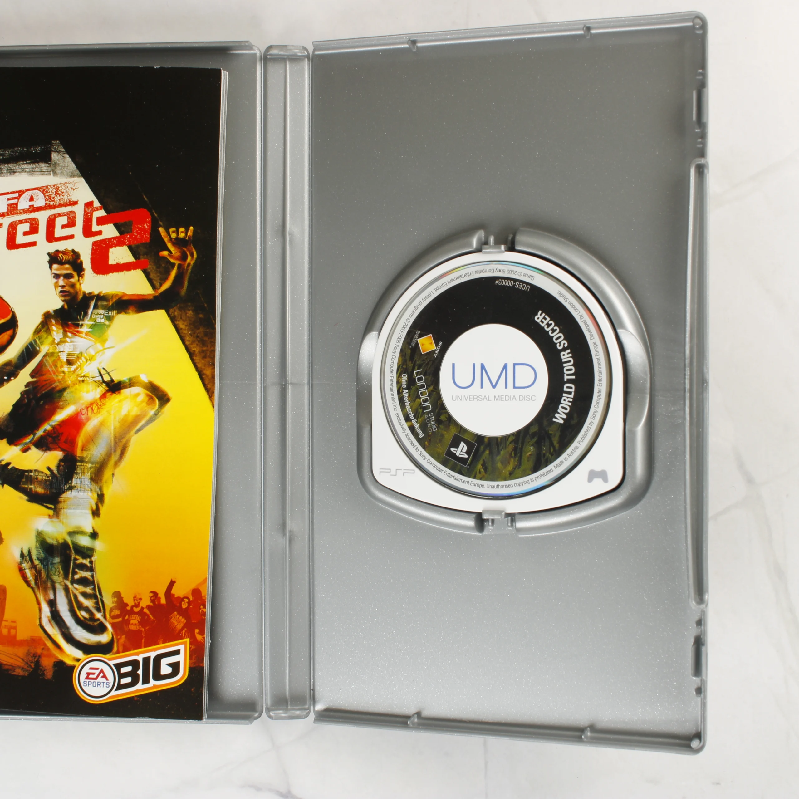 A FIFA Street 2 videójáték PlayStation Portable (PSP) konzolra kiadott Platinum változata. A csomag tartalmazza az eredeti szürke műanyag tokot, a színes borítót és a kézikönyvet. A borítón Cristiano Ronaldo látható akció közben. Fontos megjegyzés, hogy a tokban található UMD lemez nem a FIFA Street 2, hanem a World Tour Soccer című játékot tartalmazza. A tok és a nyomtatott anyagok angol és görög nyelvű feliratokkal rendelkeznek. A termék használt, a tokon és a lemezen kisebb használati nyomok láthatóak.