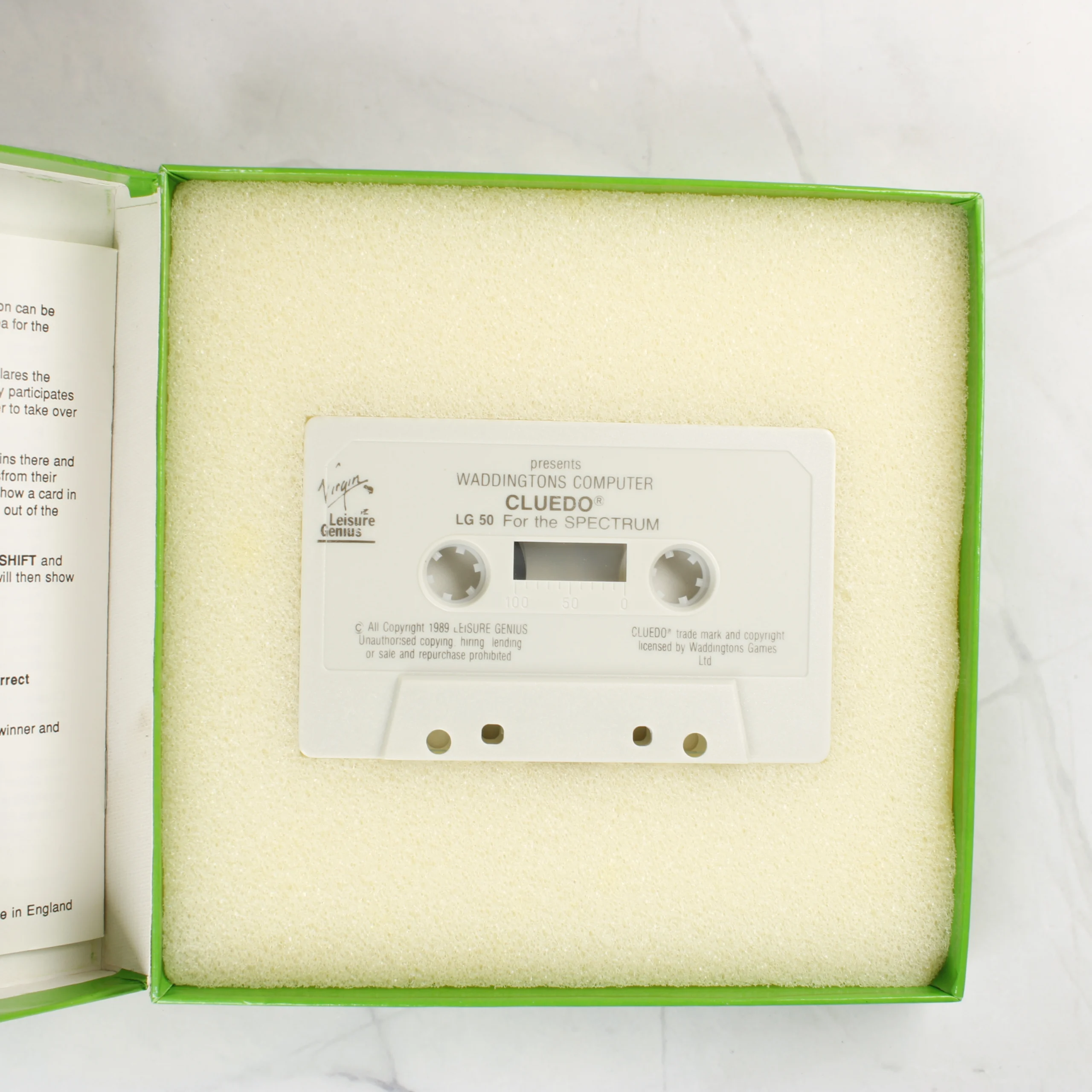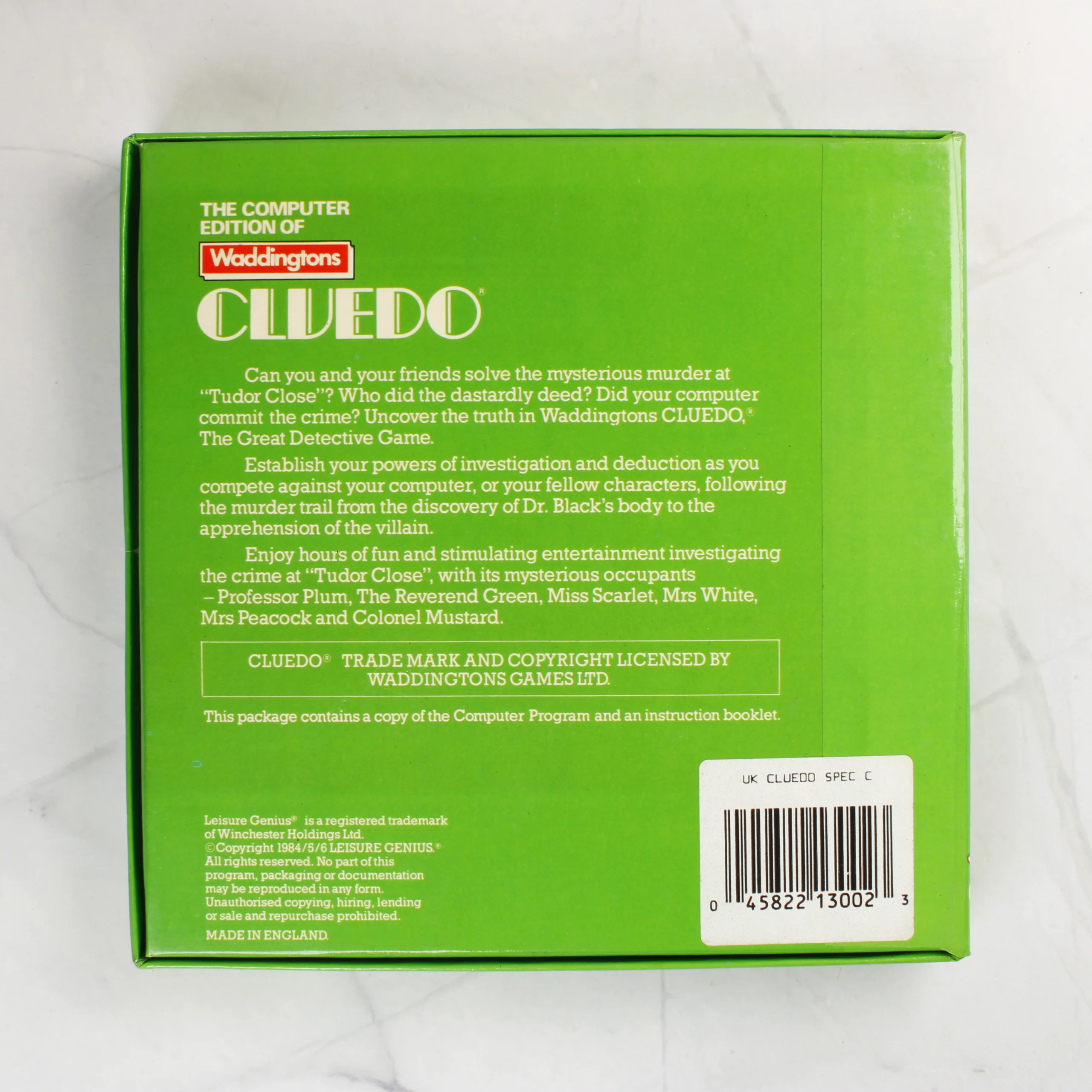 A Waddingtons Cluedo videójáték ZX Spectrum számítógépre készült kiadása. A csomagolás egy élénkzöld színű, négyzet alakú kartondoboz, amelynek elején a játék címe és egy nyomozati eszközöket ábrázoló illusztráció látható. A doboz belsejében egy fehér színű adathordozó kazetta található, amely egy sárgás szivacságyba van süllyesztve. A kazettán a Virgin és a Leisure Genius logói, valamint a játék címe olvasható. A doboz hátoldalán angol nyelvű leírás és egy vonalkód szerepel. A csomag tartalmazza az eredeti használati útmutatót is, amely a doboz bal szélén látható.