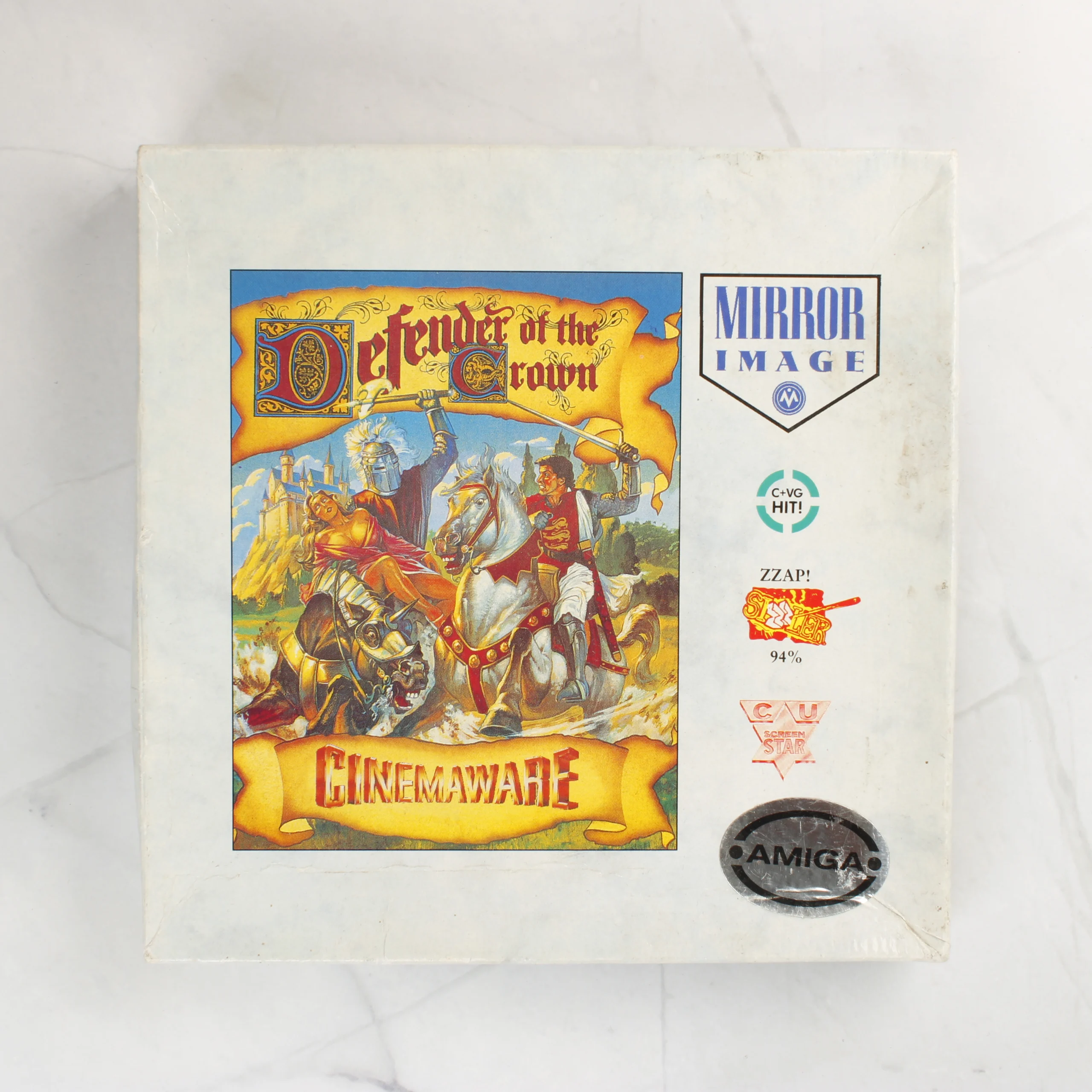 A Defender of the Crown című videójáték Amiga platformra készült kiadása. A csomag tartalmazza az eredeti kartondobozt, egy kék színű 3,5 colos floppy lemezt és a hozzá tartozó nyomtatott kézikönyvet. A doboz elején a Cinemaware klasszikus illusztrációja látható, amely egy lovagi jelenetet ábrázol. A Mirror Image kiadásában megjelent szoftver dobozán különböző szaklapok elismerő logói és egy ezüstszínű Amiga matrica is helyet kapott. A hátoldalon többnyelvű (angol, francia, német) leírás és képernyőmentések mutatják be a játékmenetet. A belső tartalmon látható feliratok szerint a lemez az Amiga 500, 1000 és 2000 modellekkel kompatibilis. A doboz és a dokumentáció a korának megfelelő, megkímélt állapotban van.